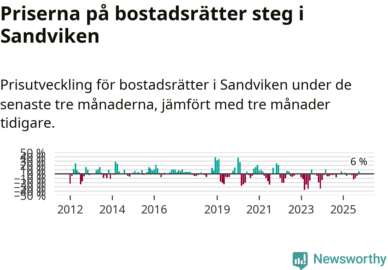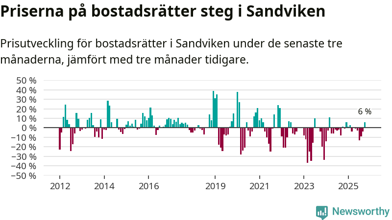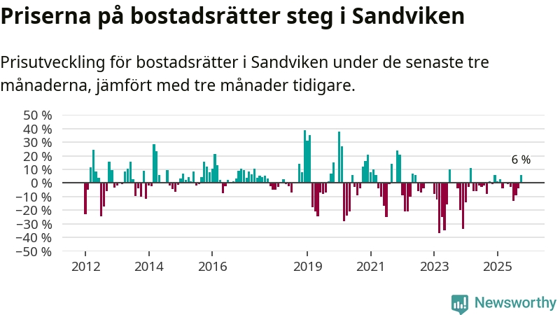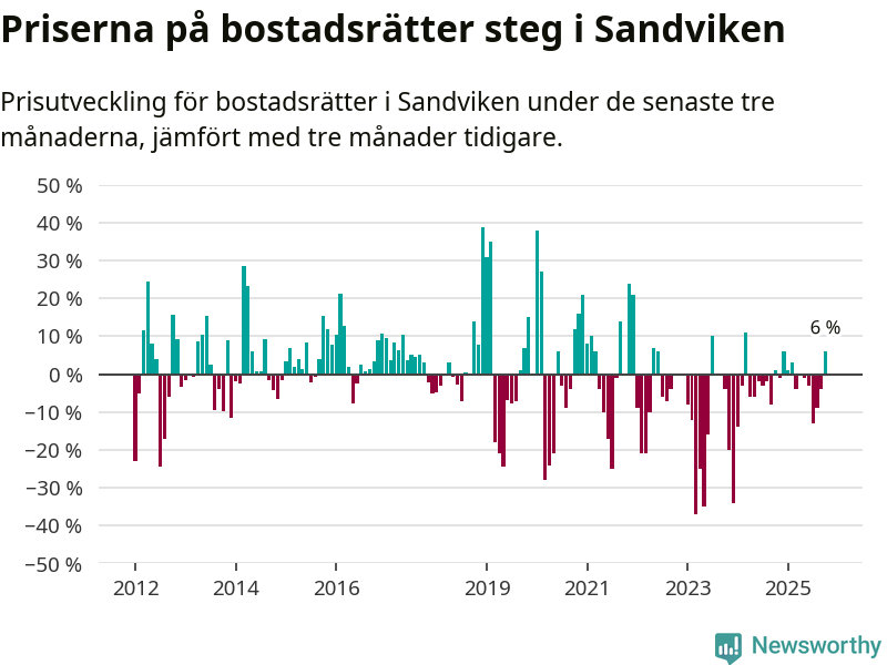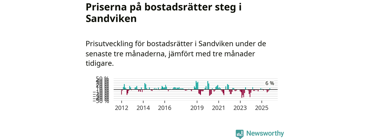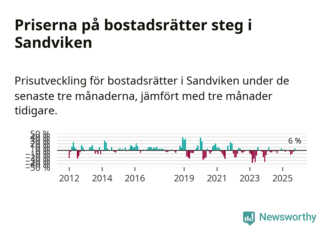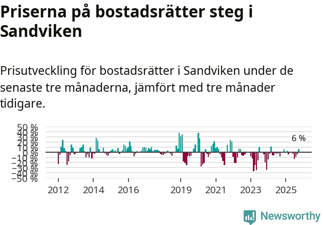 Priserna på bostadsrätter har gått upp i Sandvikens kommun. Medelpriset på försäljningarna under de senaste tre månaderna visar på en uppgång med 6 procent.