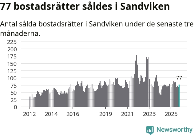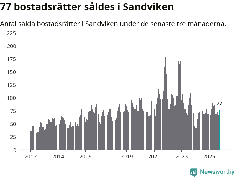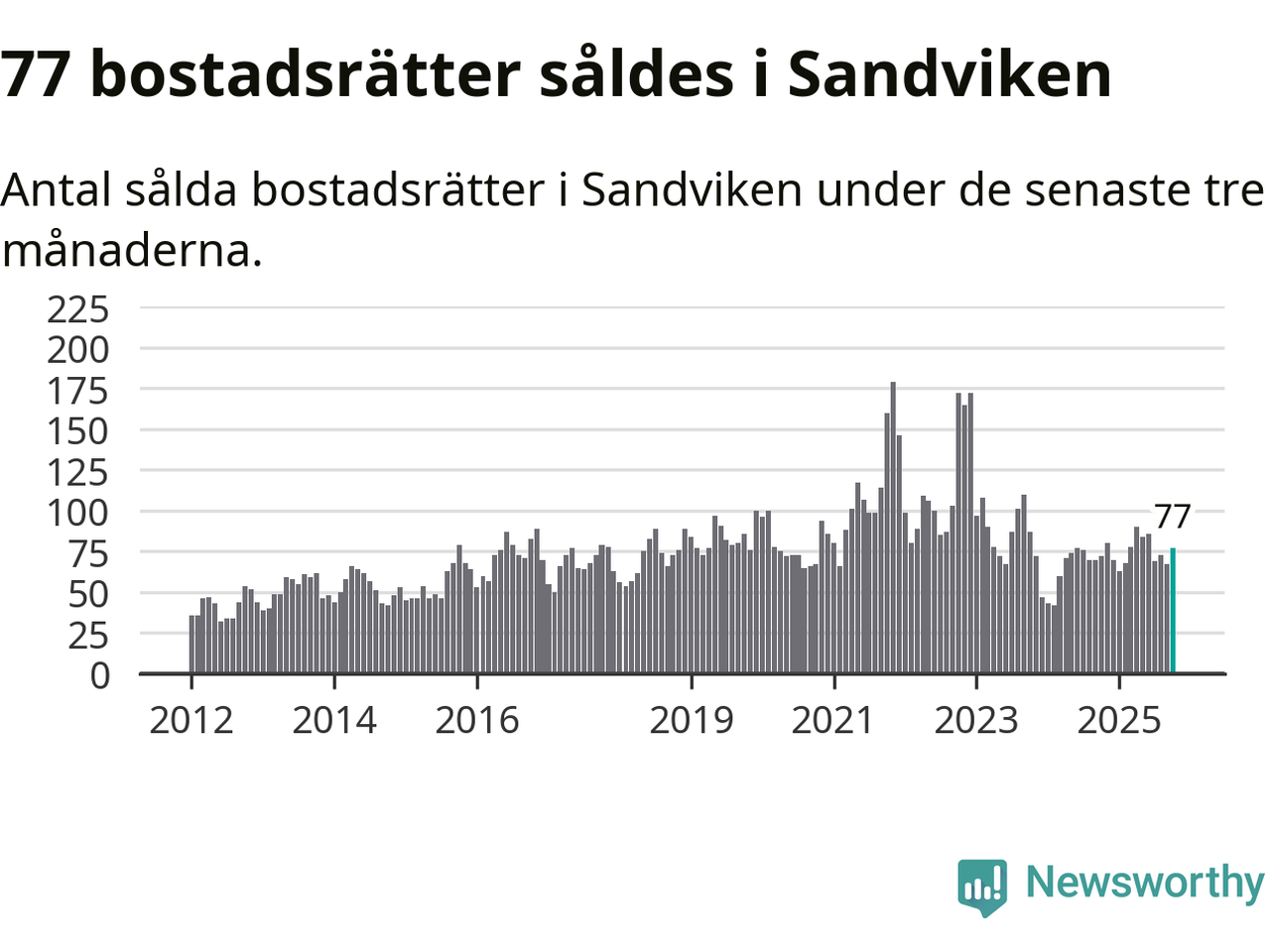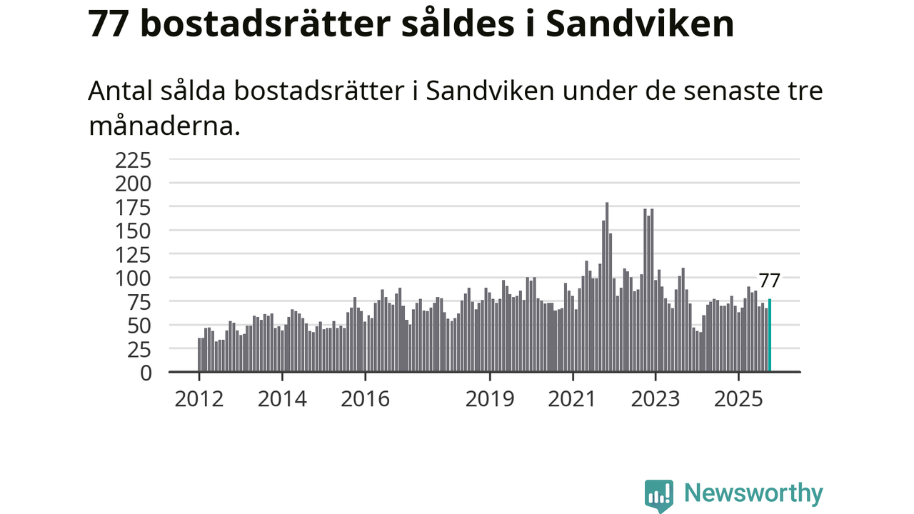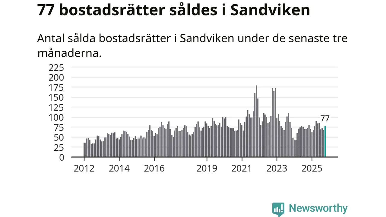 Sammanlagt såldes 77 bostadsrätter i Sandvikens kommun mellan augusti och oktober till ett genomsnittligt pris på 0,7 miljoner kronor. I fjol gjordes 72 affärer vid den här tiden på året.
