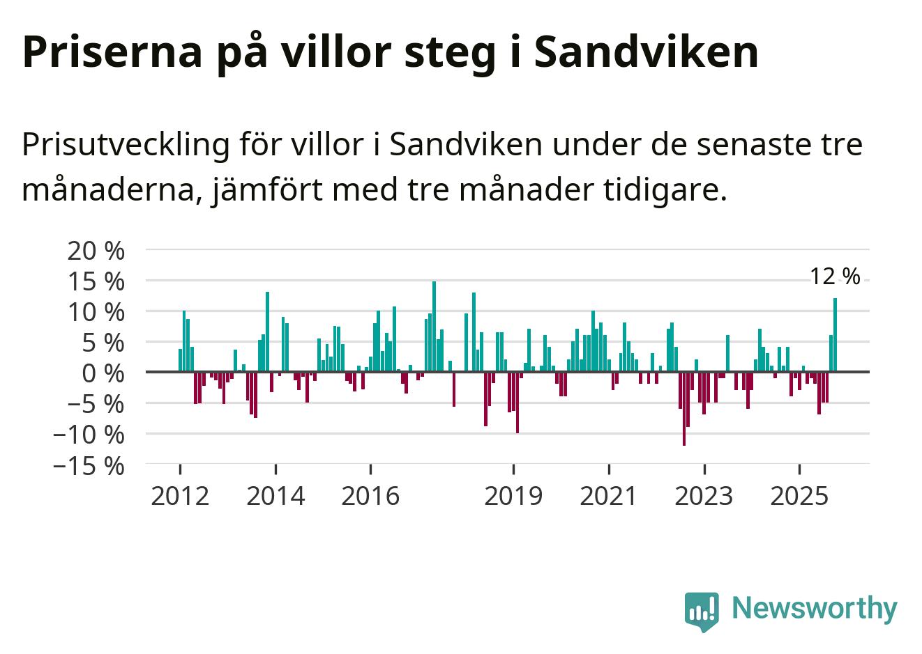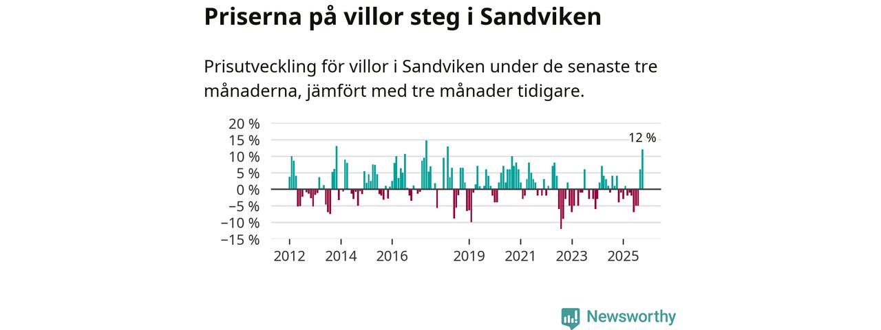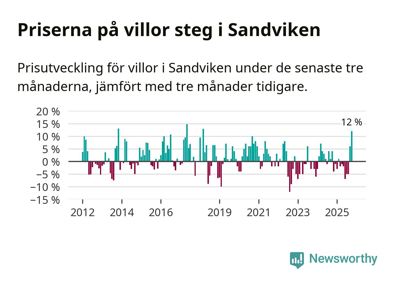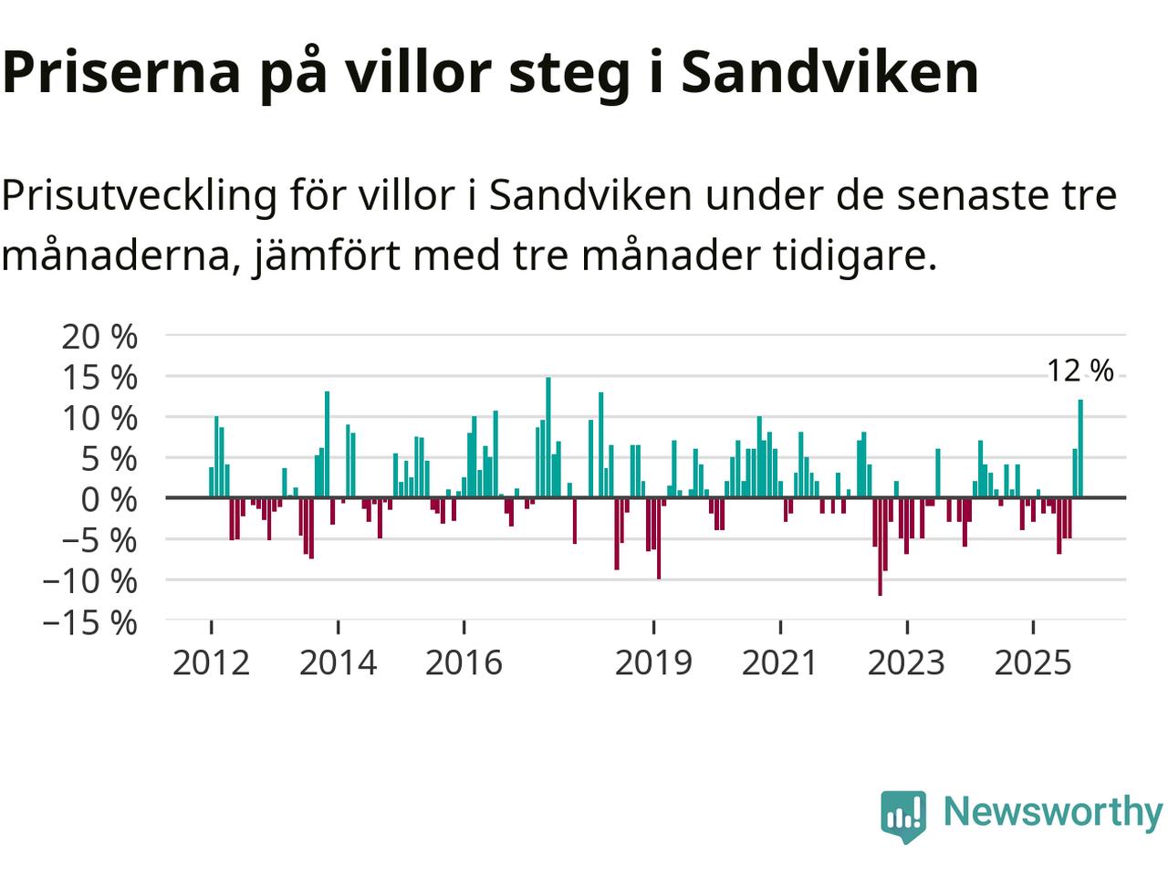 Villapriserna steg med tolv procent i Sandvikens kommun under de senaste tre månaderna. Det är den starkaste prisutvecklingen sedan 2018.