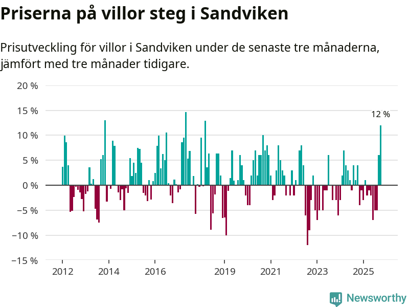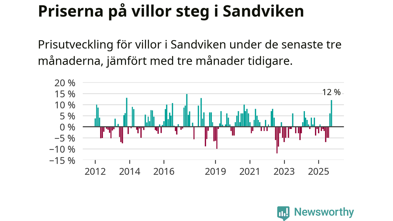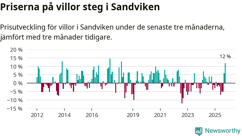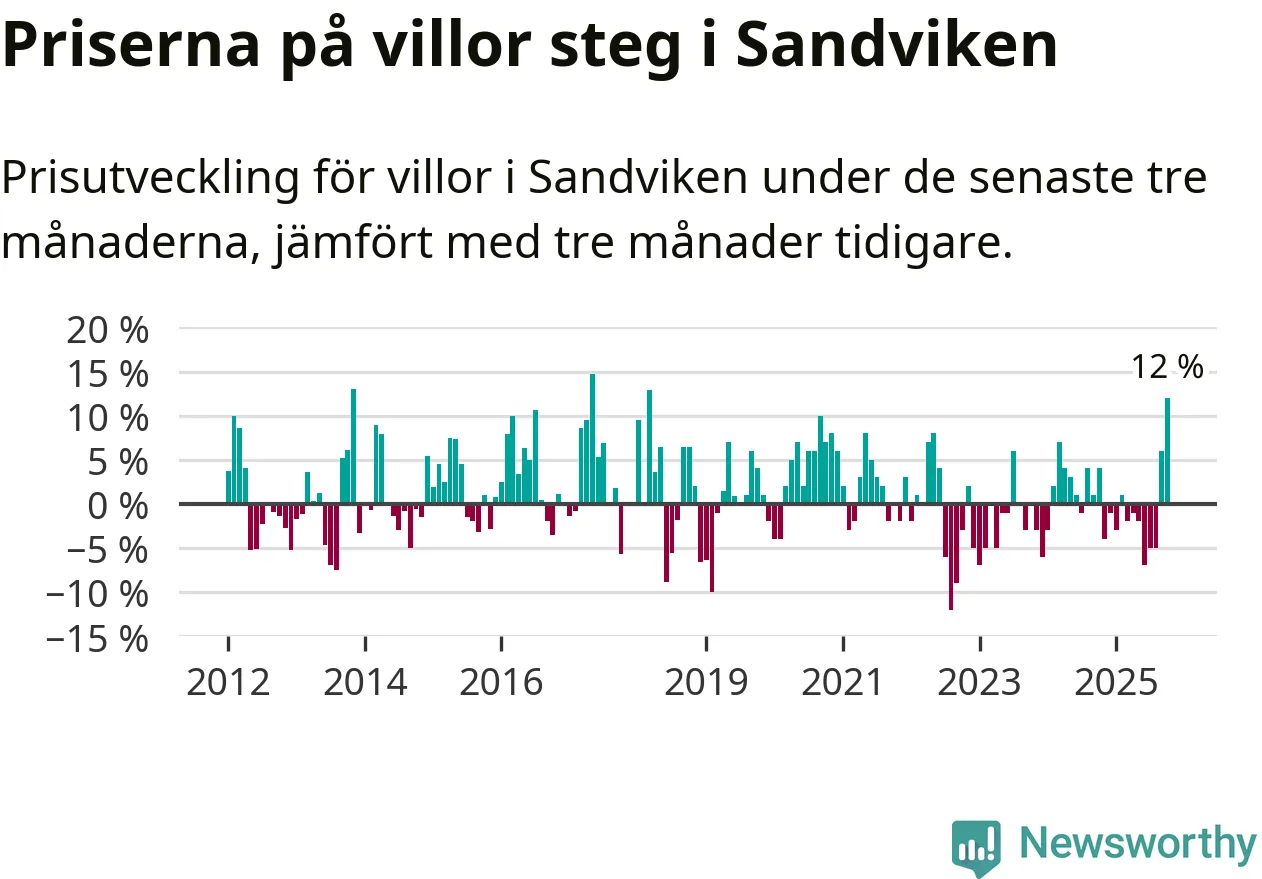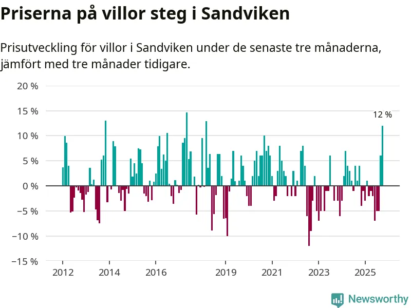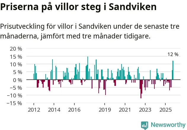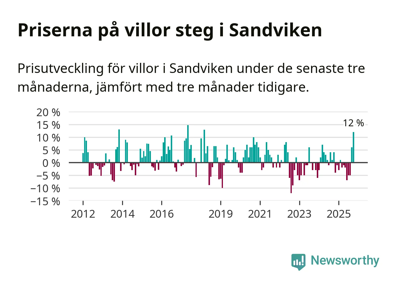Villapriserna steg med tolv procent i Sandvikens kommun under de senaste tre månaderna. Det är den starkaste prisutvecklingen sedan 2018.