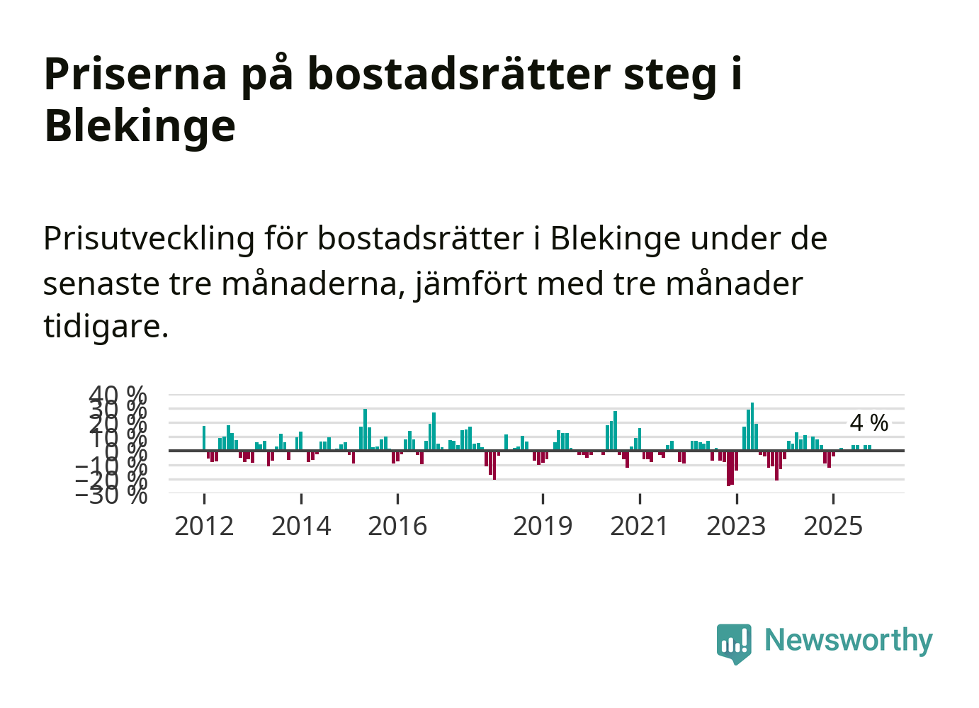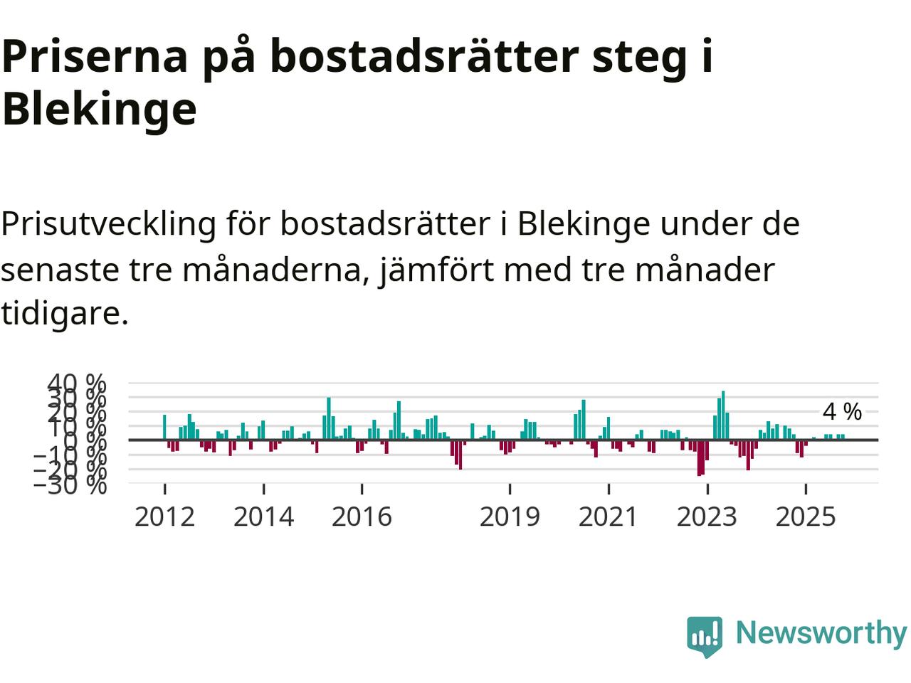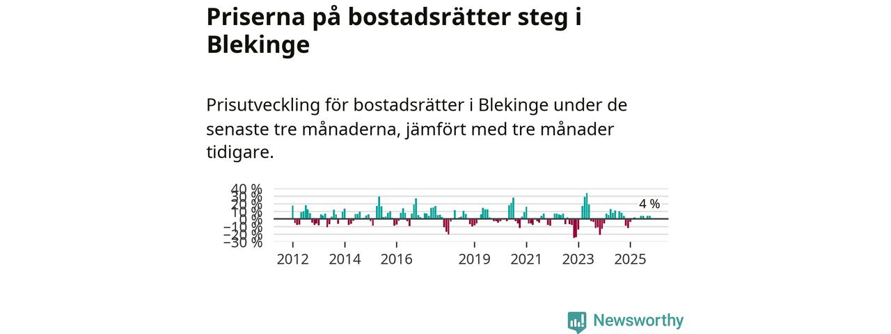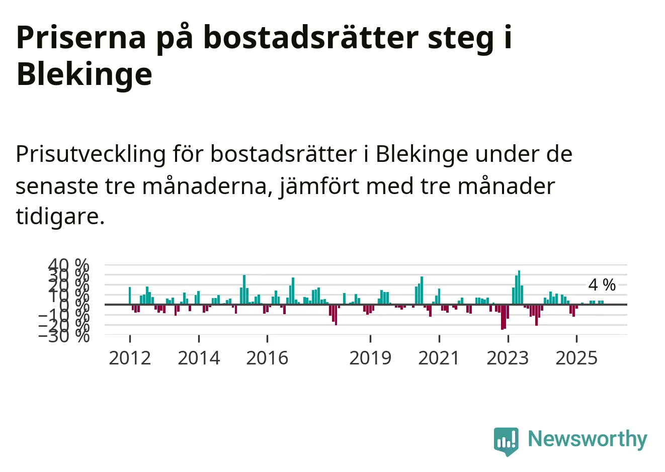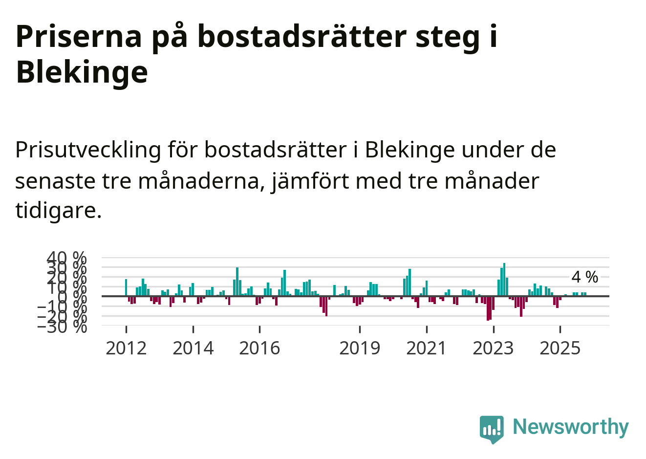 Priserna på bostadsrätter har gått upp i Blekinge län. Medelpriset på försäljningarna under de senaste tre månaderna visar på en uppgång med 4 procent.