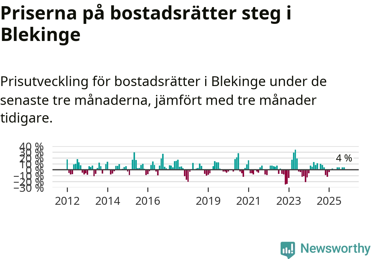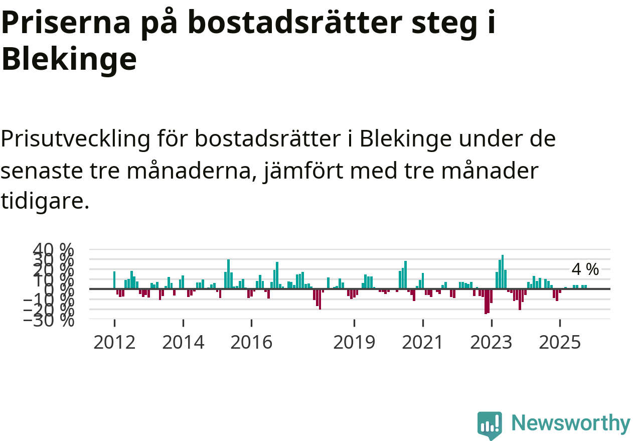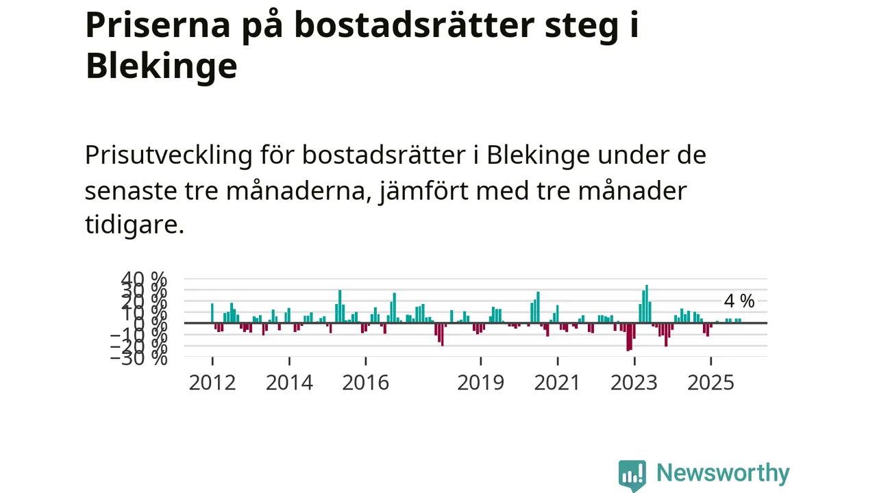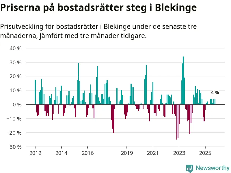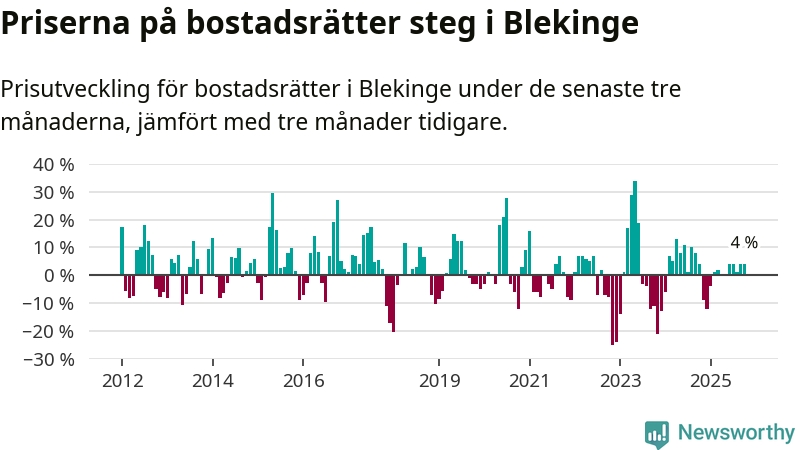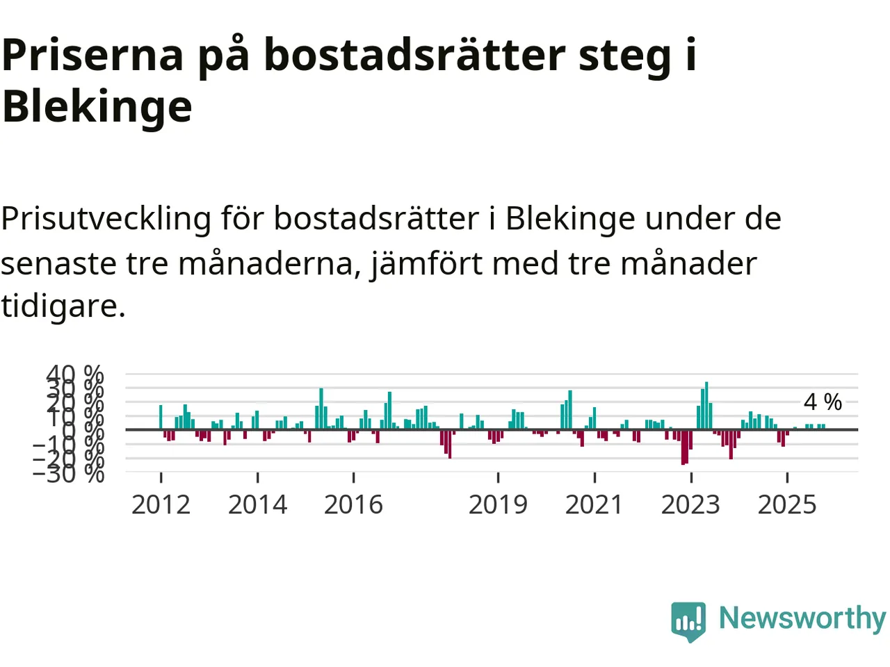 Priserna på bostadsrätter har gått upp i Blekinge län. Medelpriset på försäljningarna under de senaste tre månaderna visar på en uppgång med 4 procent.