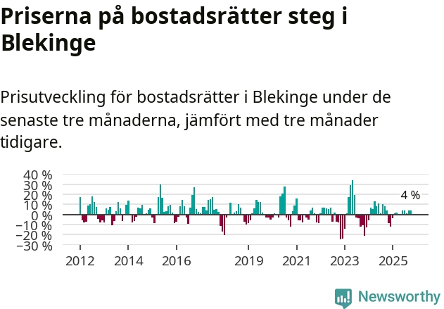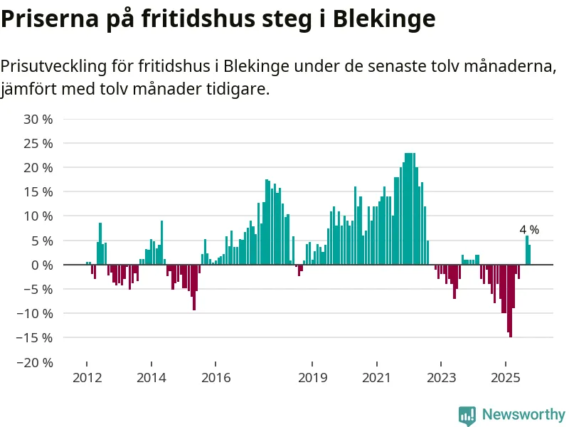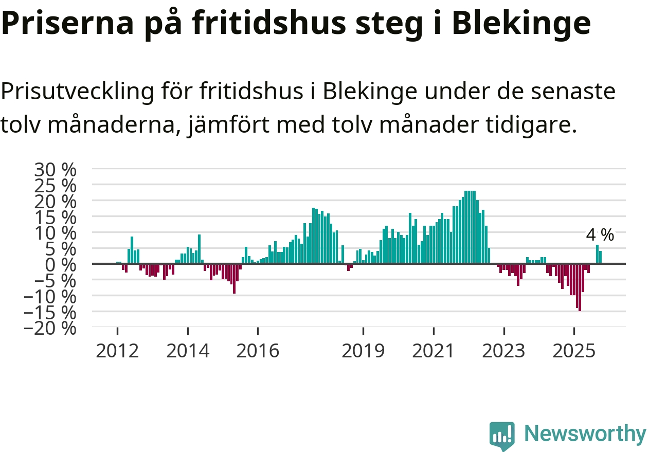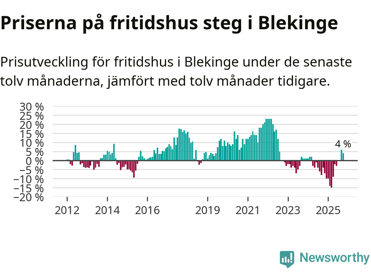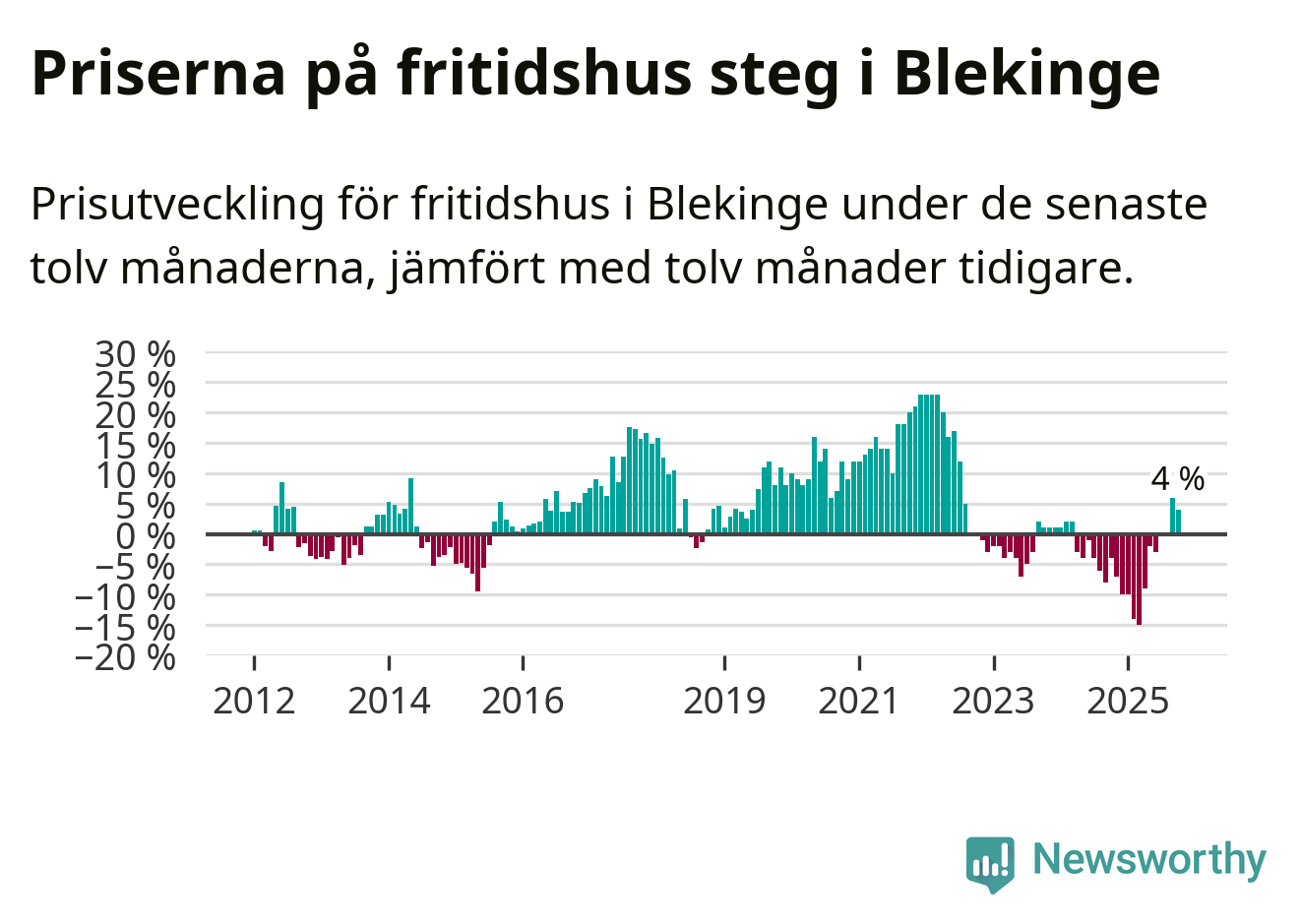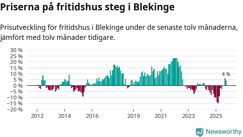 Priserna på fritidshus steg mellan november 2024 och oktober med 4 procent i Blekinge län. Det är en betydande uppgång jämfört med det gångna året då priserna i snitt sjunkit med 5 procent.