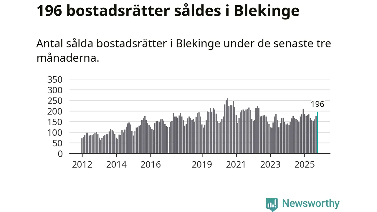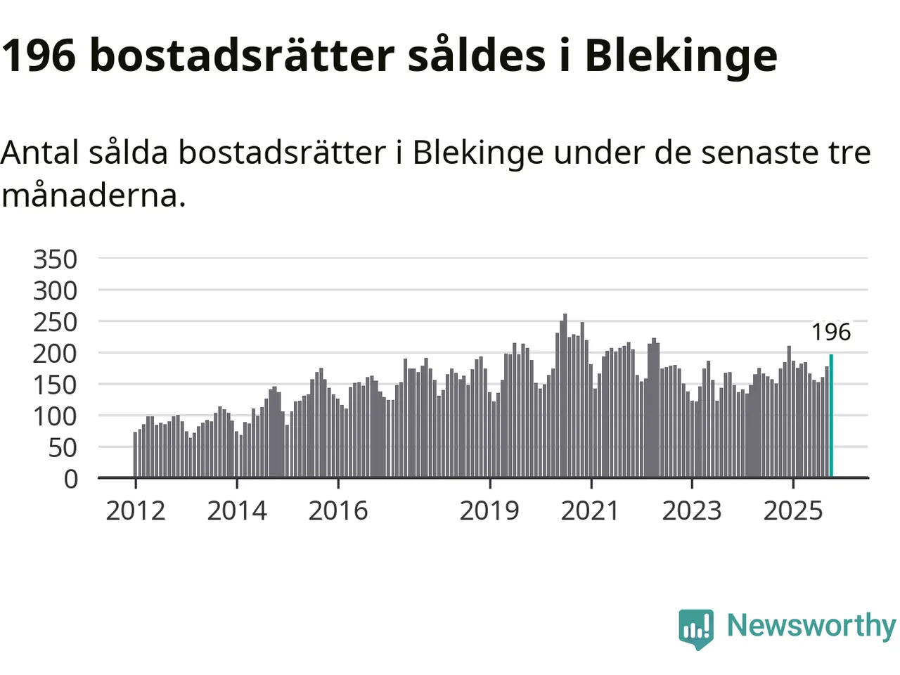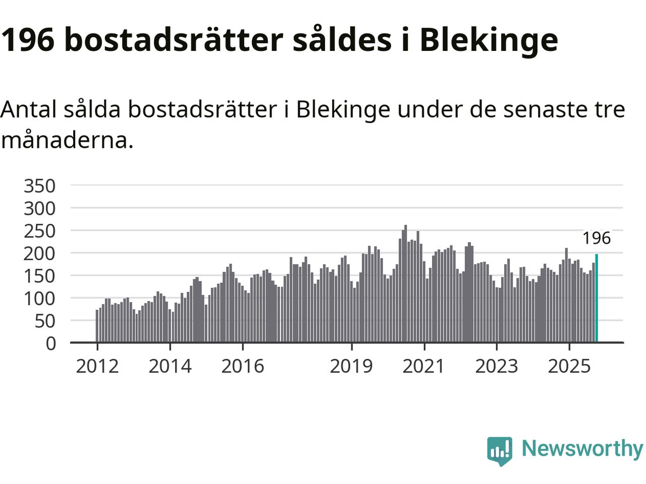 Sammanlagt såldes 196 bostadsrätter i Blekinge län mellan augusti och oktober till ett genomsnittligt pris på 1,6 miljoner kronor. I fjol gjordes 173 affärer vid den här tiden på året.