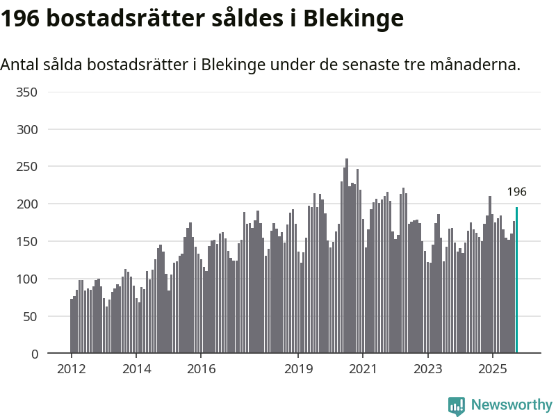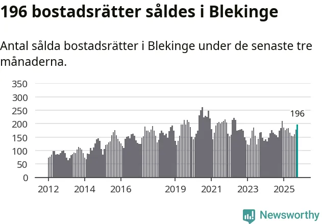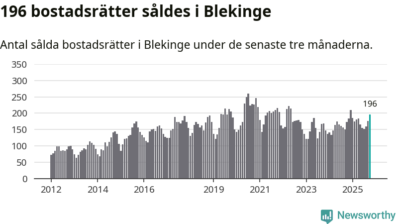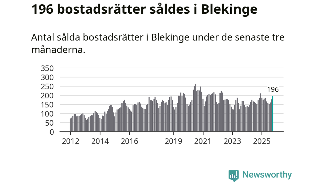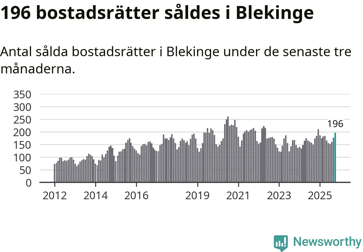 Sammanlagt såldes 196 bostadsrätter i Blekinge län mellan augusti och oktober till ett genomsnittligt pris på 1,6 miljoner kronor. I fjol gjordes 173 affärer vid den här tiden på året.
