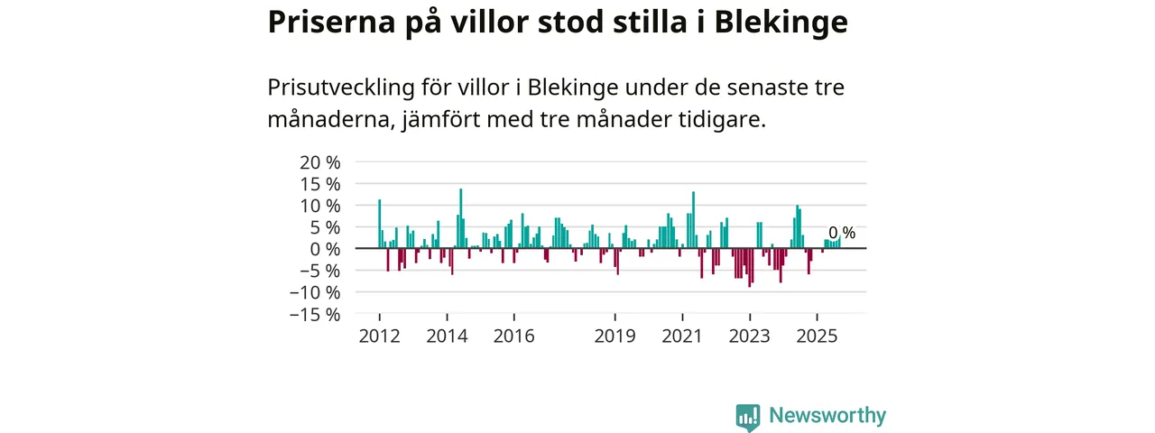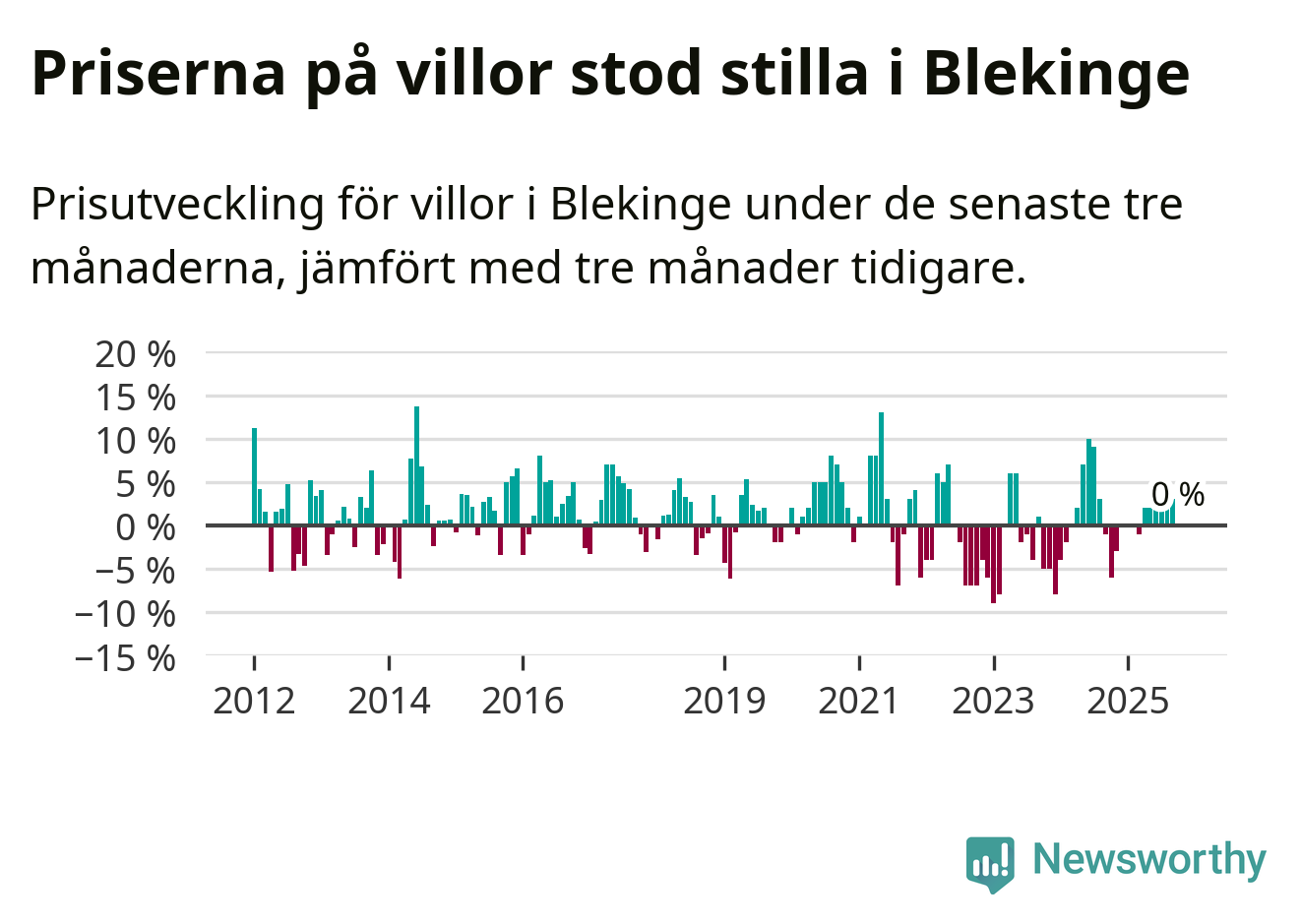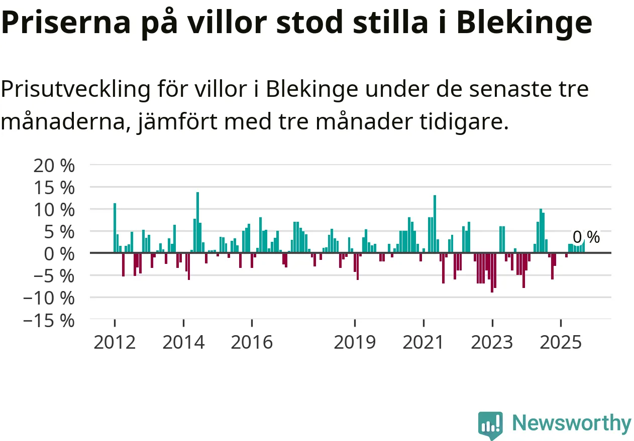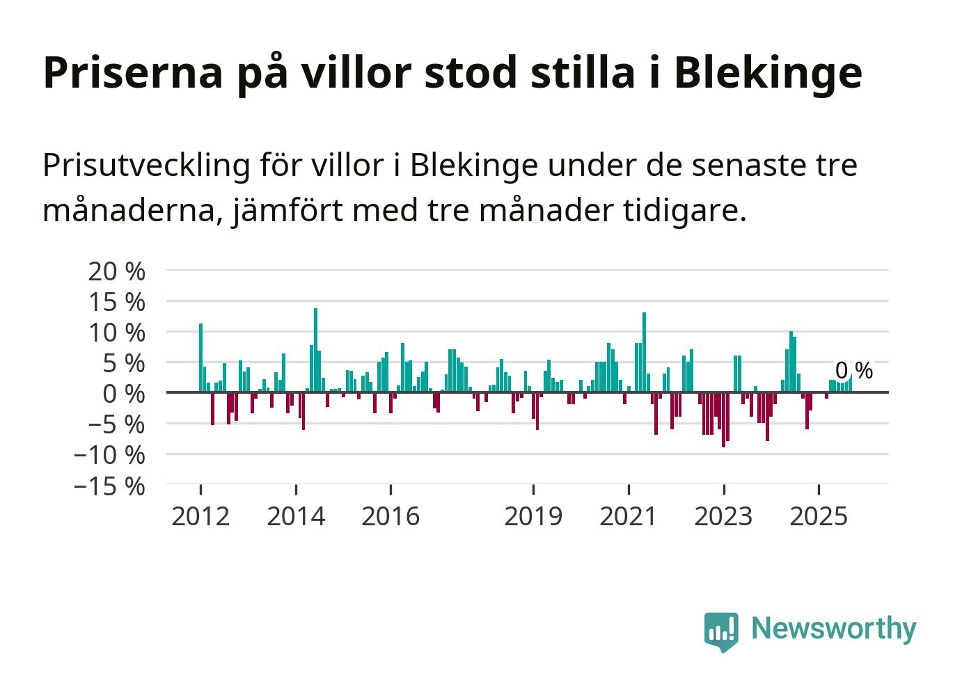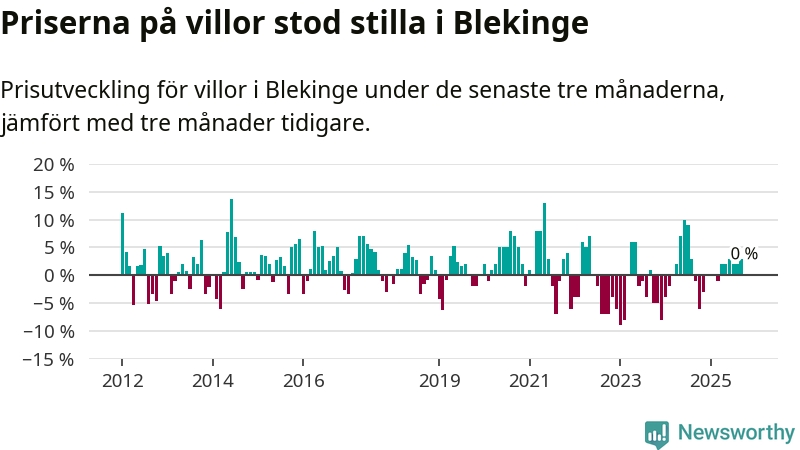 Villapriserna står i stort sett stilla i Blekinge län. Medelpriset på de på försäljningarna under de senaste tre månaderna låg på samma nivå som för tre månader sedan.