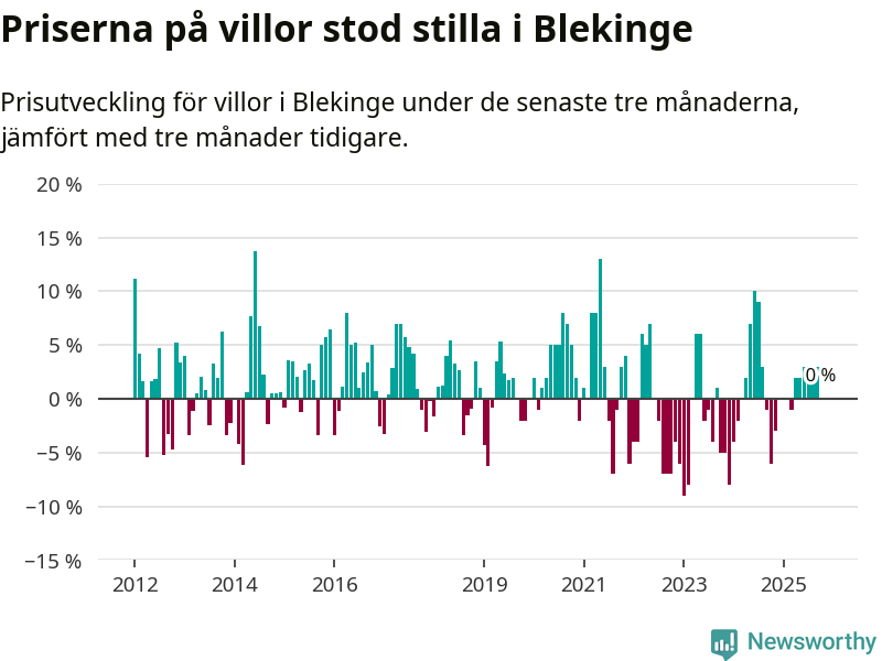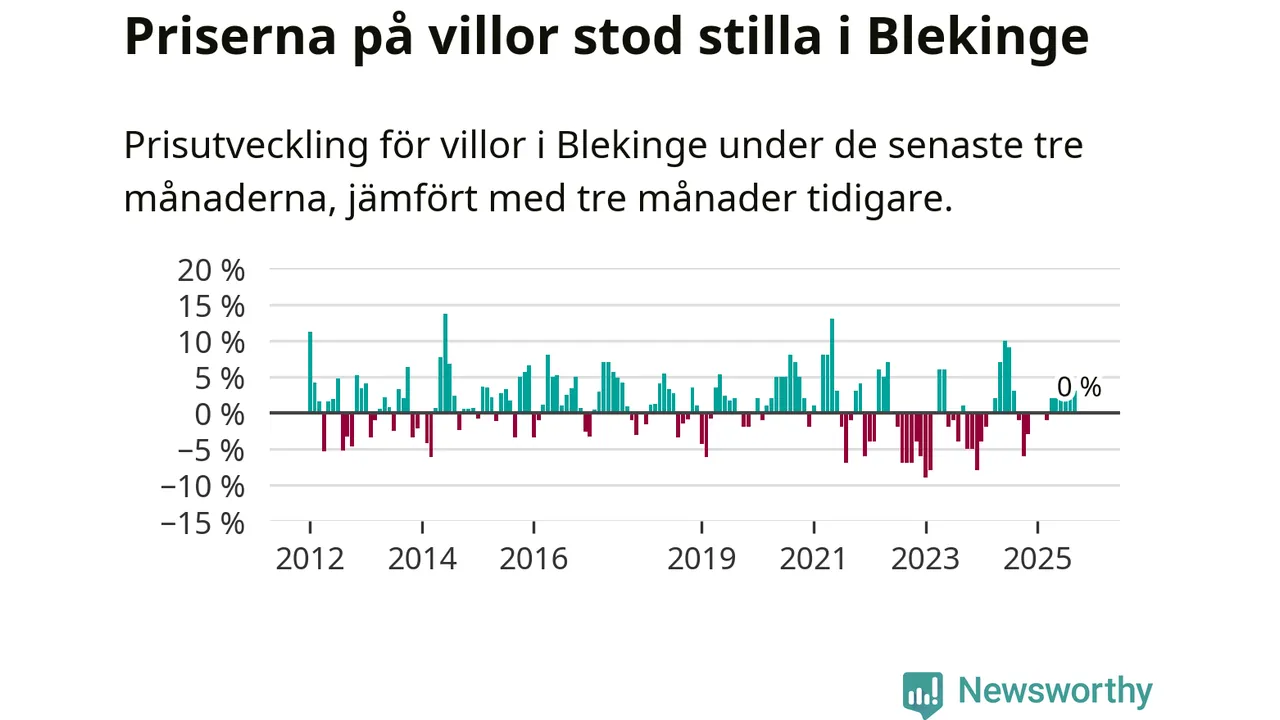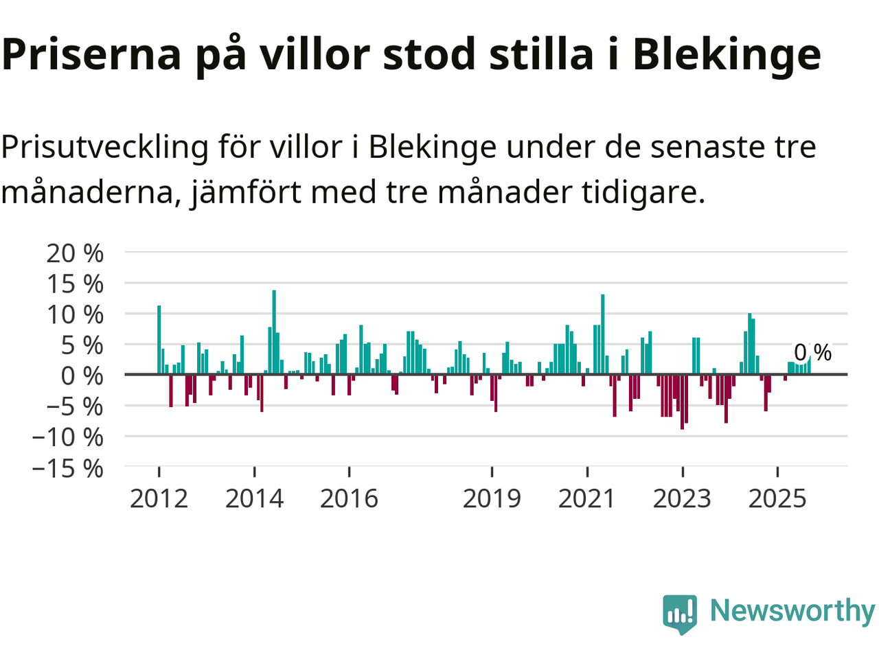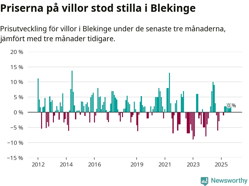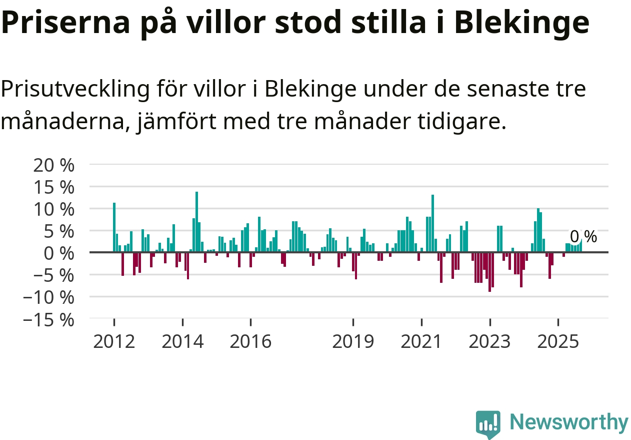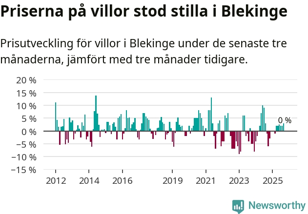 Villapriserna står i stort sett stilla i Blekinge län. Medelpriset på de på försäljningarna under de senaste tre månaderna låg på samma nivå som för tre månader sedan.