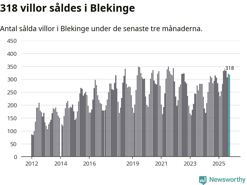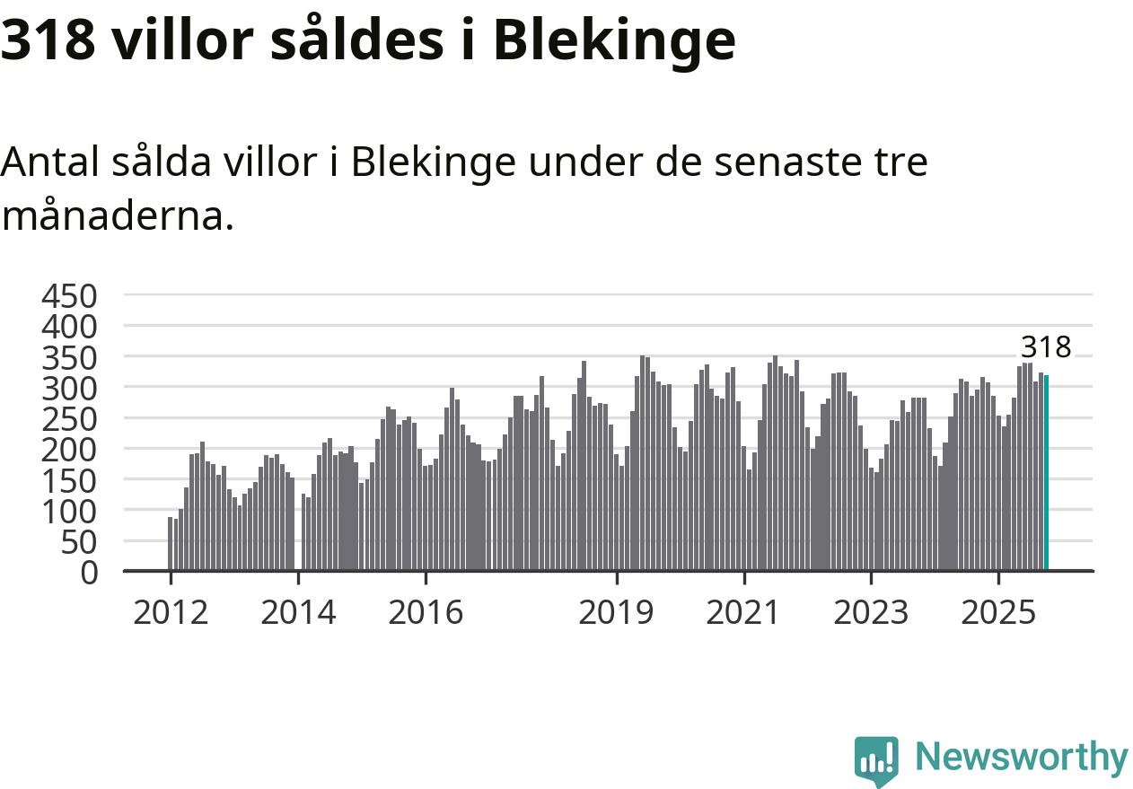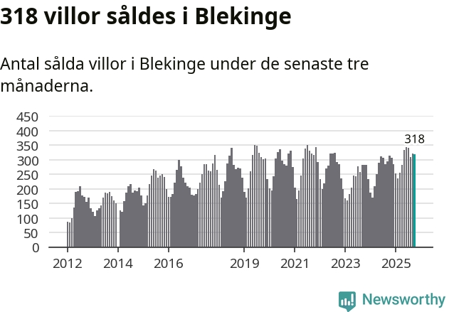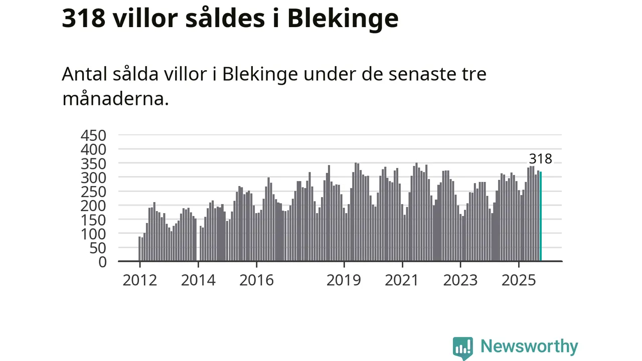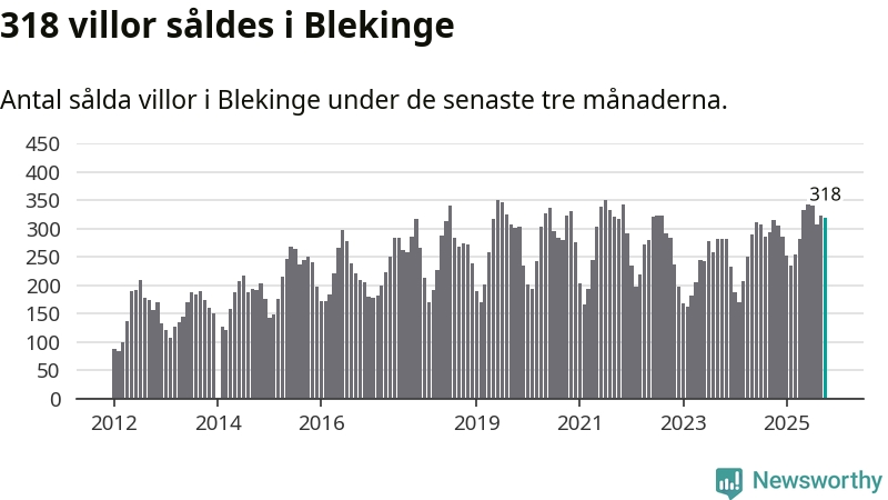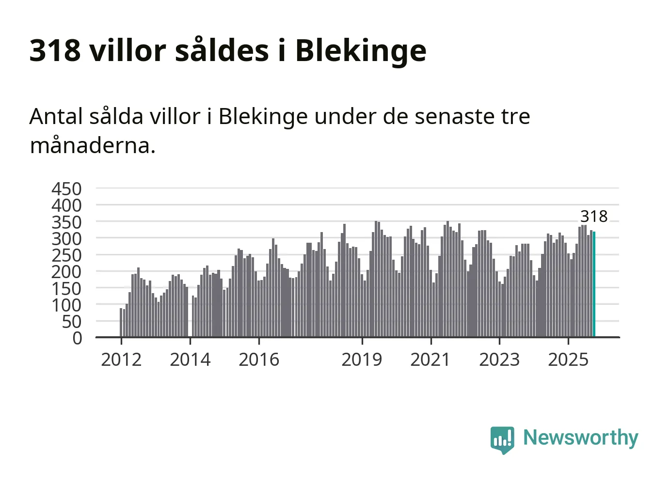 Sammanlagt såldes 318 villor i Blekinge län mellan augusti och oktober till ett genomsnittligt pris på 2,3 miljoner kronor. I fjol gjordes 315 affärer vid den här tiden på året.