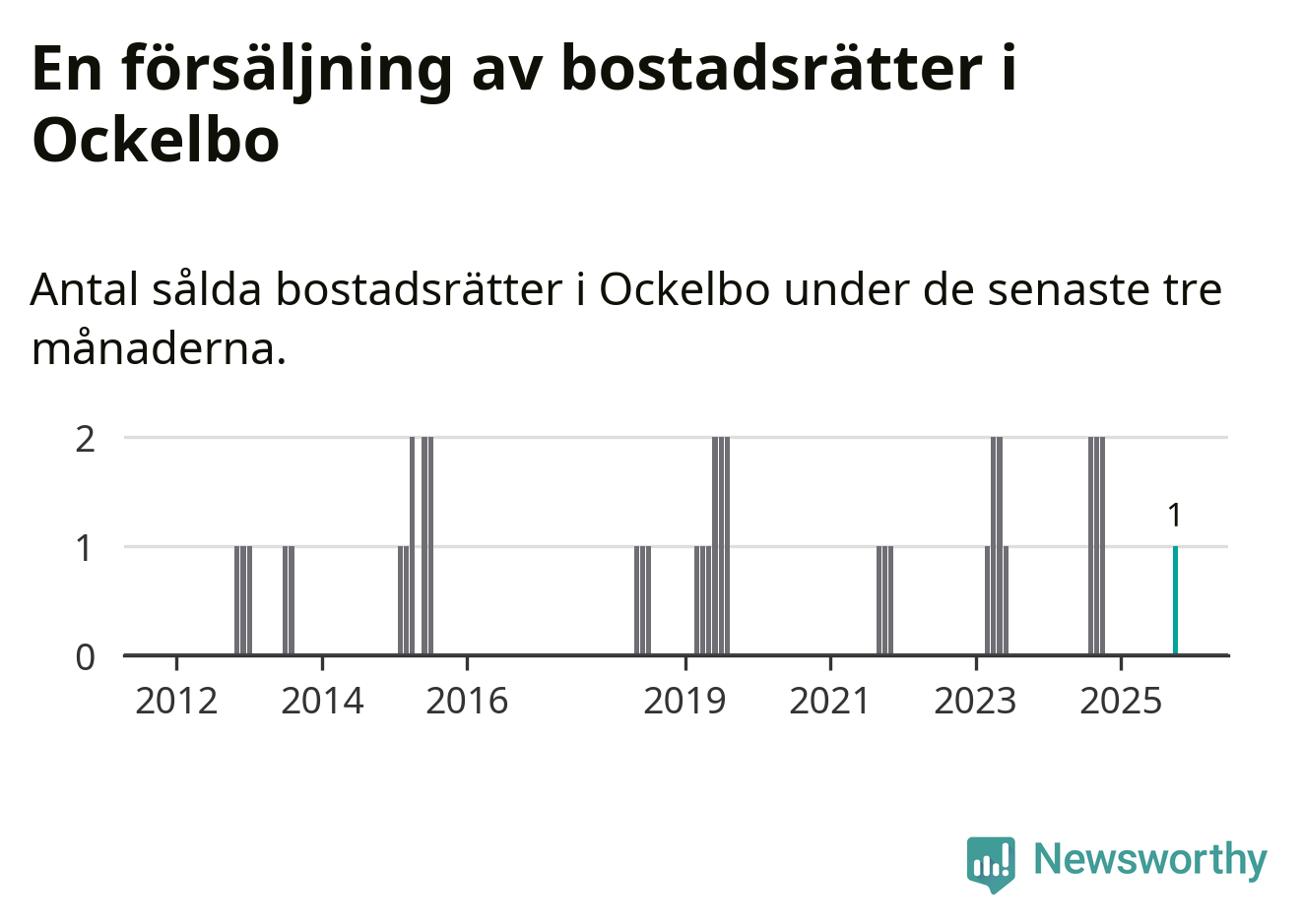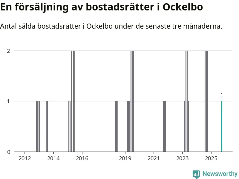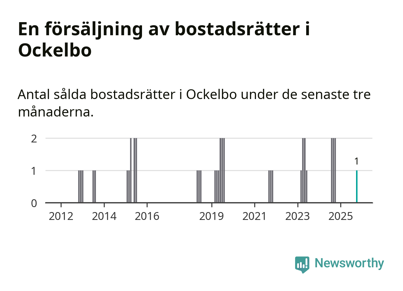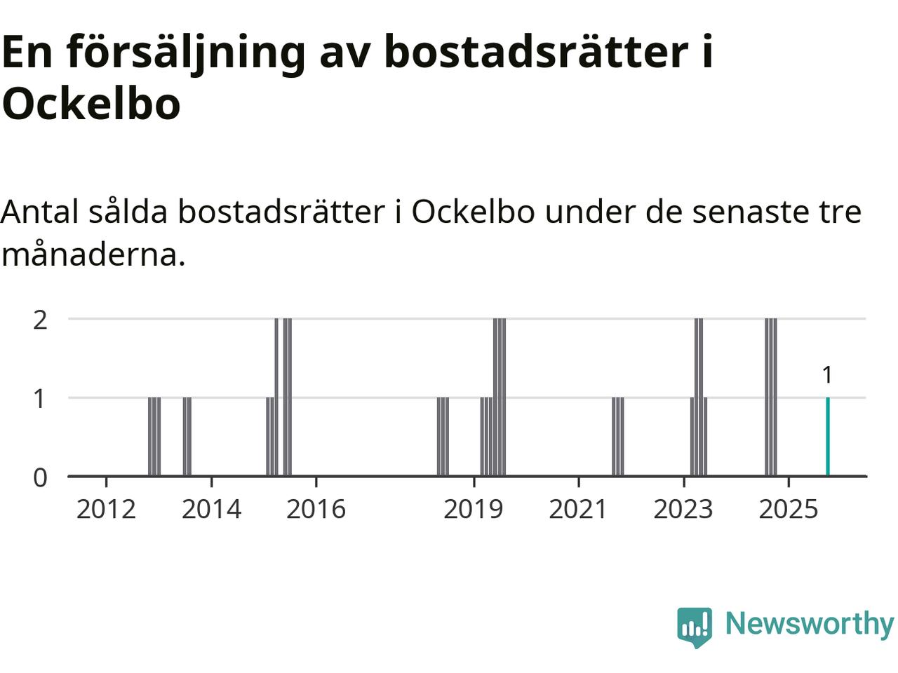 Mellan augusti och oktober gjordes sammanlagt en affär med bostadsrätter i Ockelbo kommun. Det kan jämföras med två vid motsvarande tid i fjol.
