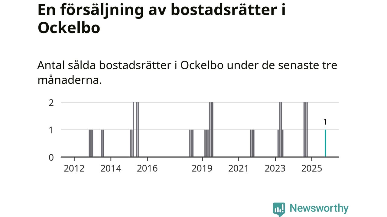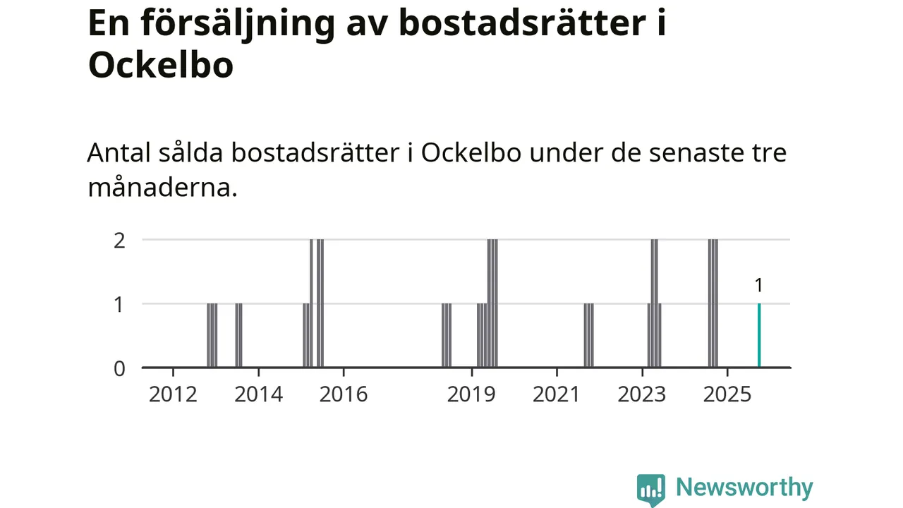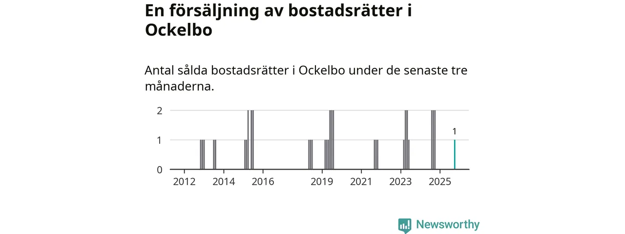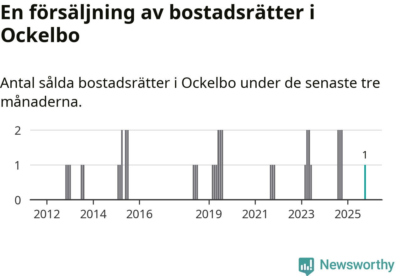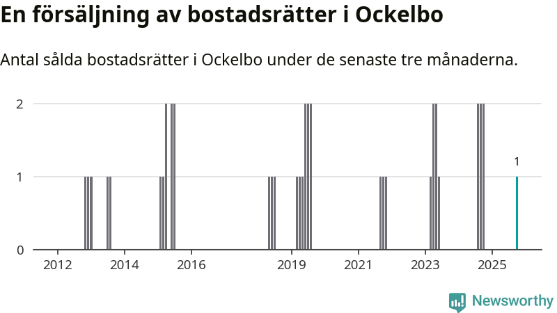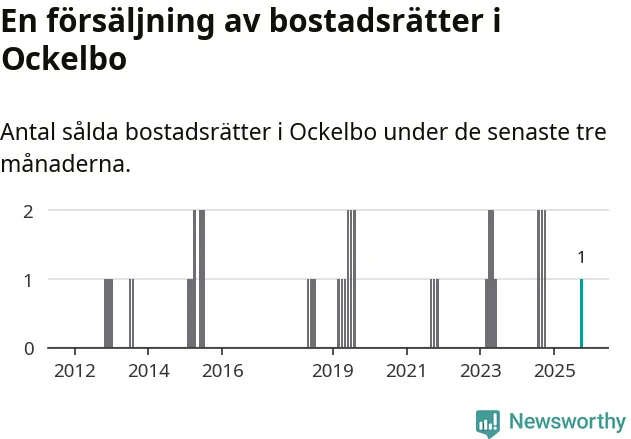 Mellan augusti och oktober gjordes sammanlagt en affär med bostadsrätter i Ockelbo kommun. Det kan jämföras med två vid motsvarande tid i fjol.