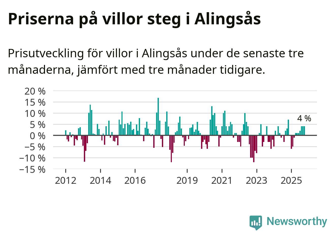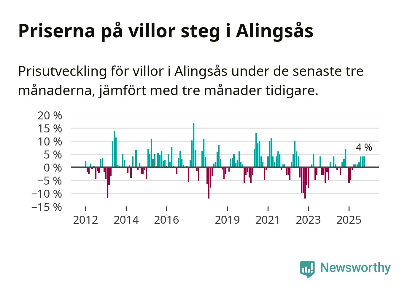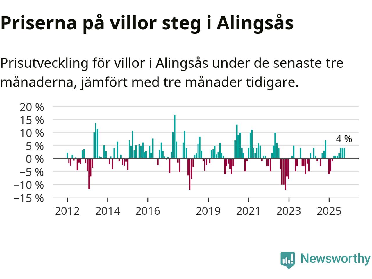 Statistiken visar även på en kännbar prisuppgång i Alingsås kommun. Medelpriset på försäljningarna av villor i kommunen var 4 procent högre än för tre månader sedan. I hela Västra Götaland däremot sjunker villapriserna. I hela länet noterades en prisnedgång på 1 procent.