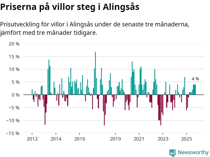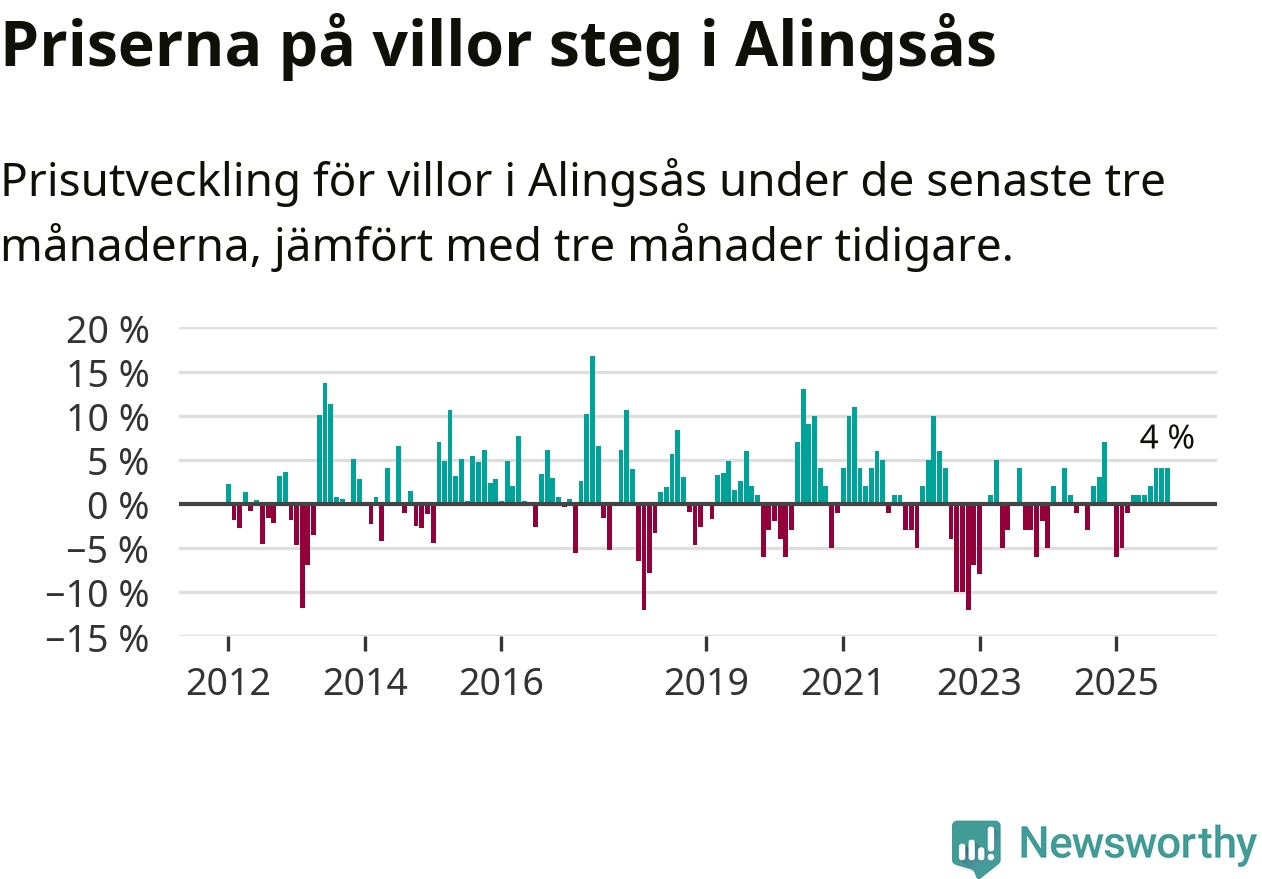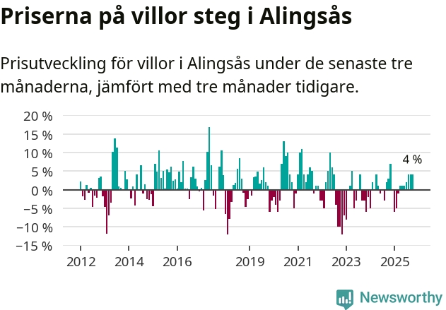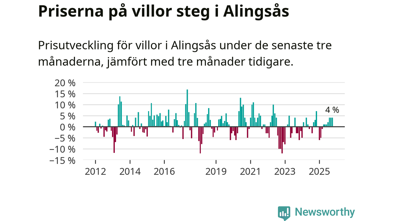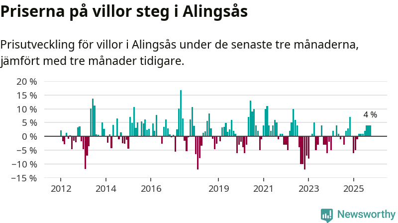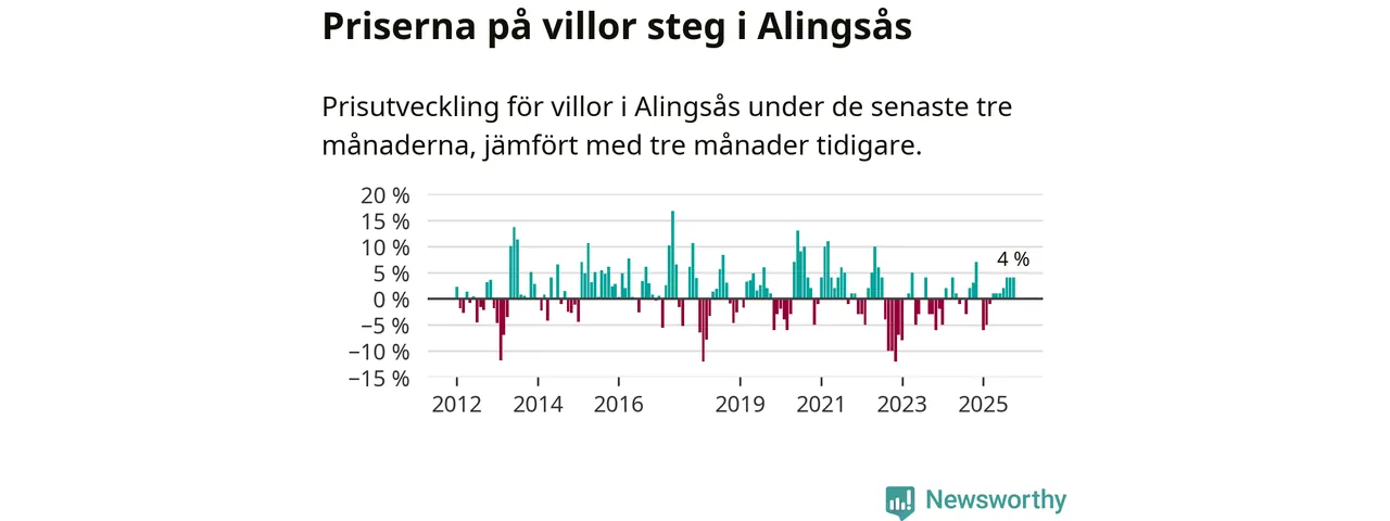 Statistiken visar även på en kännbar prisuppgång i Alingsås kommun. Medelpriset på försäljningarna av villor i kommunen var 4 procent högre än för tre månader sedan. I hela Västra Götaland däremot sjunker villapriserna. I hela länet noterades en prisnedgång på 1 procent.