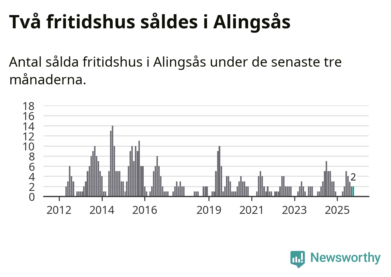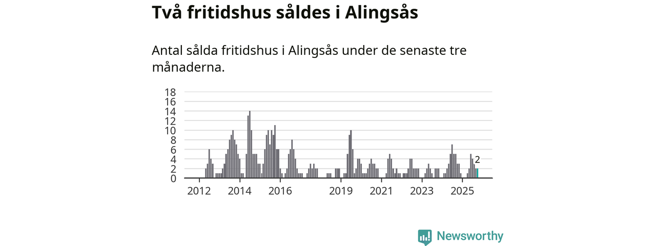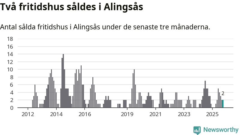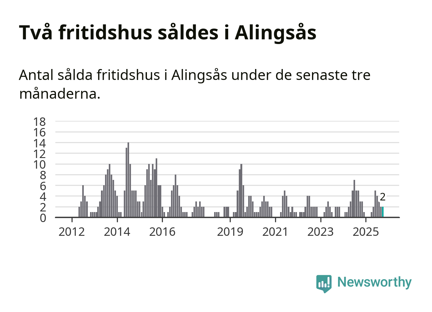 Mellan augusti och oktober gjordes sammanlagt två affärer med fritidshus i Alingsås kommun. Det kan jämföras med tre vid motsvarande tid i fjol.