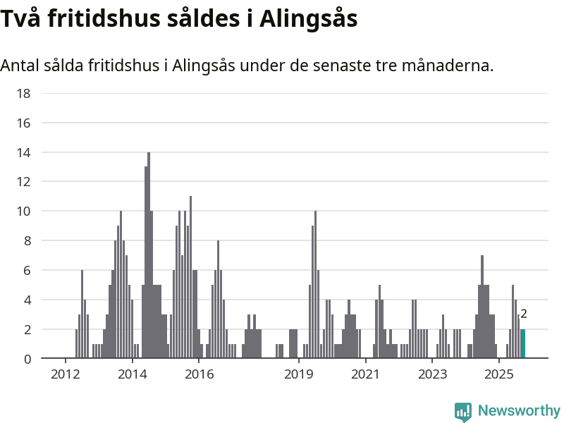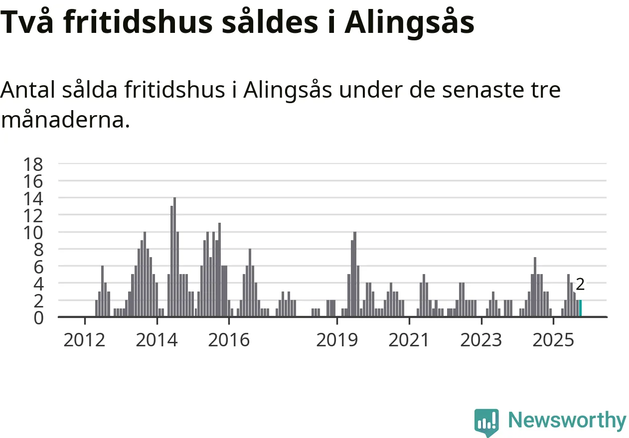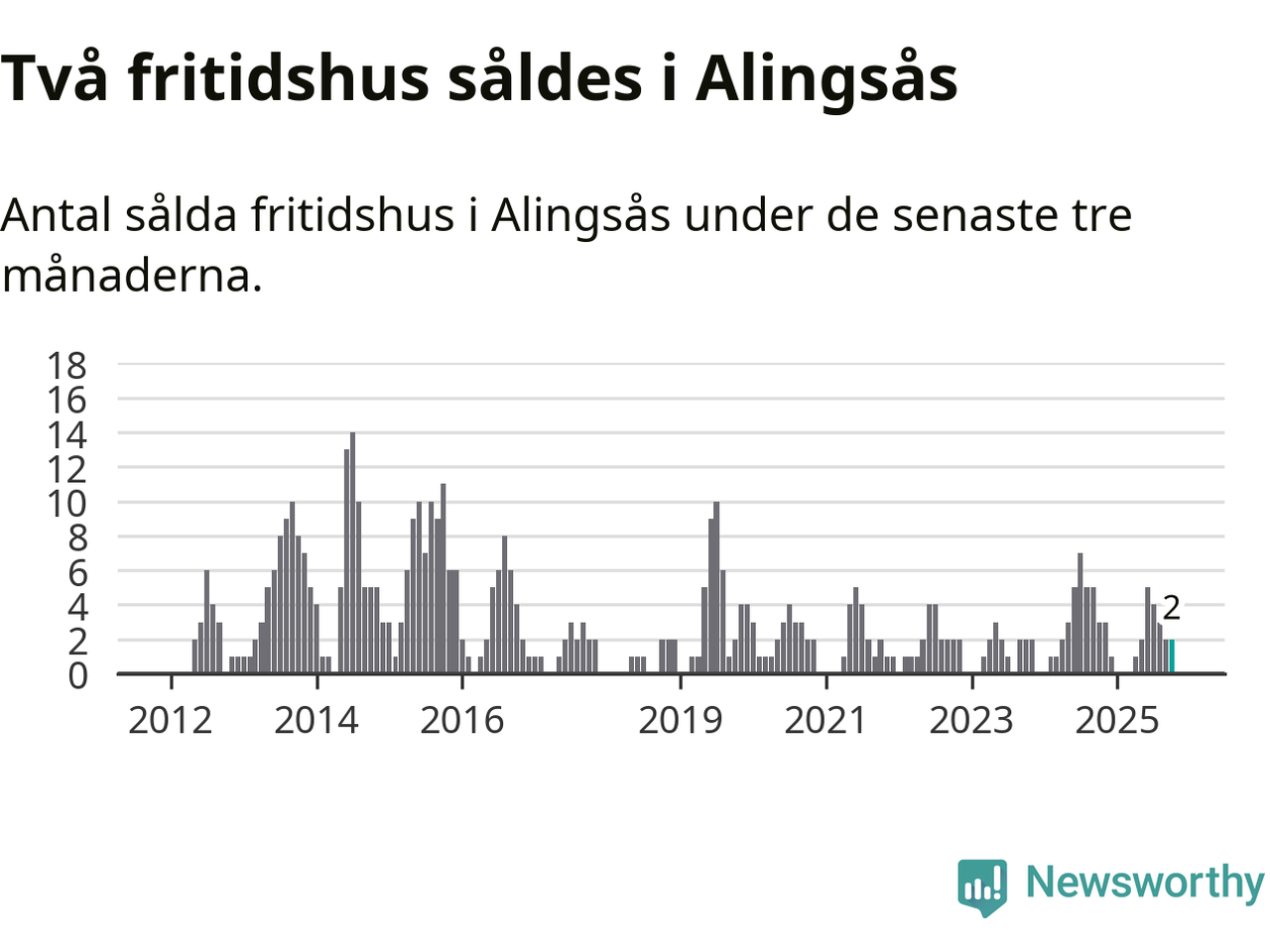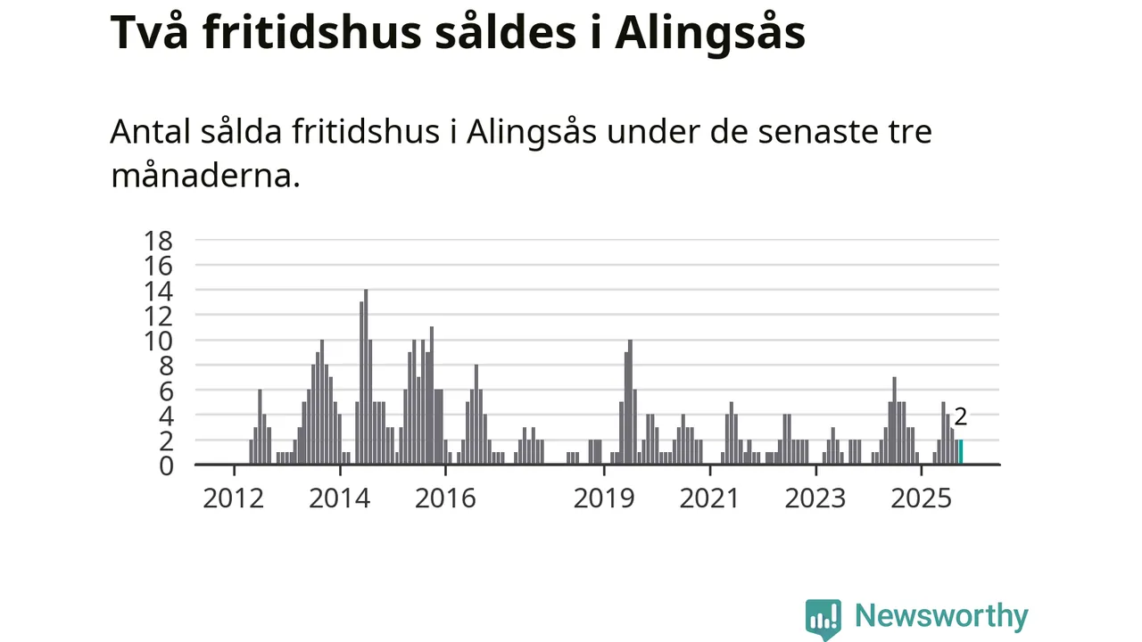 Mellan augusti och oktober gjordes sammanlagt två affärer med fritidshus i Alingsås kommun. Det kan jämföras med tre vid motsvarande tid i fjol.