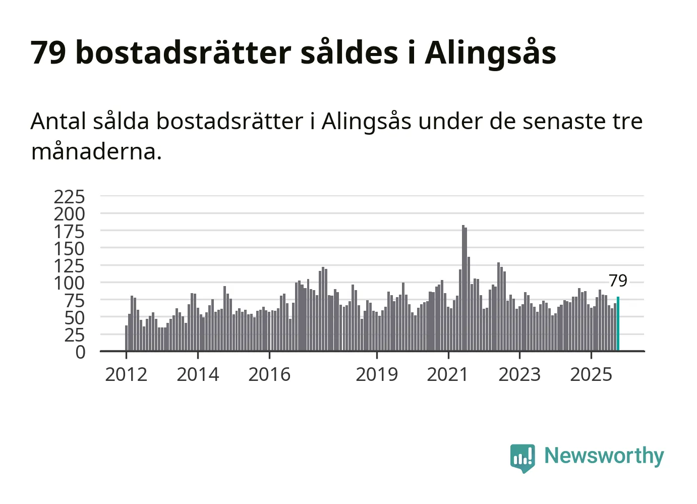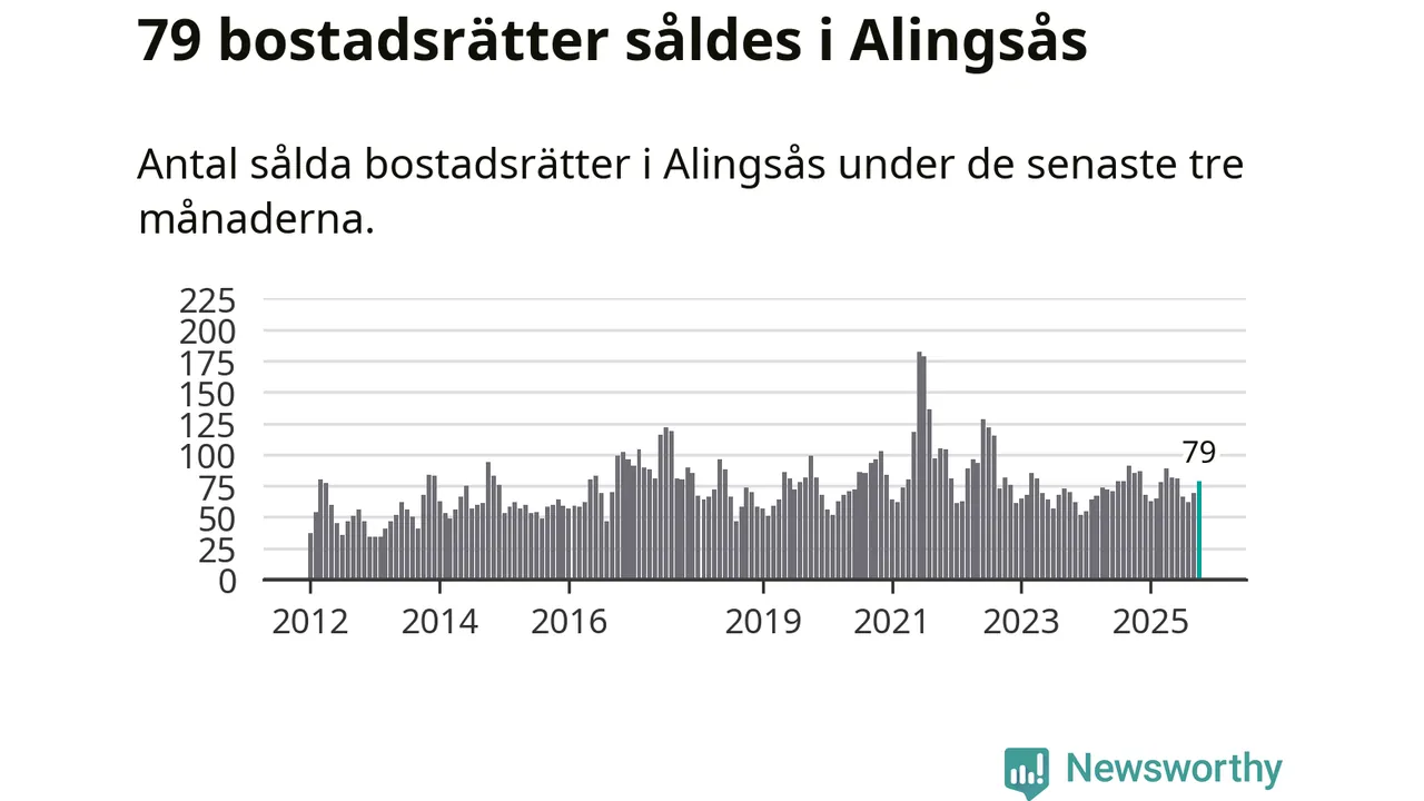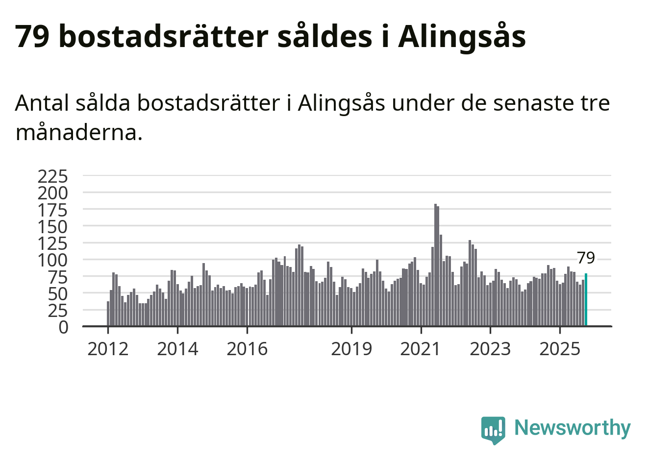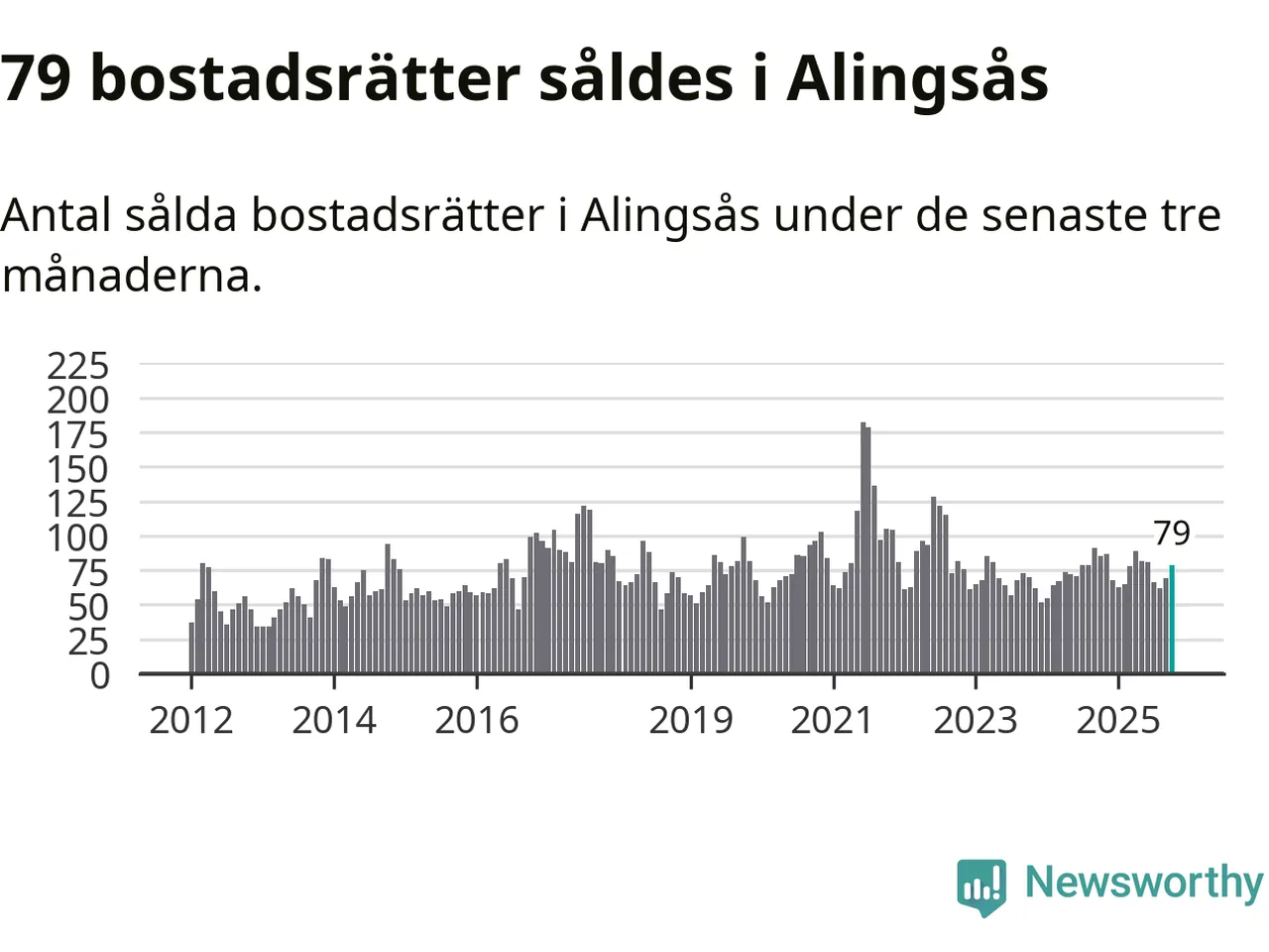 Sammanlagt såldes 79 bostadsrätter i Alingsås kommun mellan augusti och oktober till ett genomsnittligt pris på 2,5 miljoner kronor. I fjol gjordes 85 affärer vid den här tiden på året.