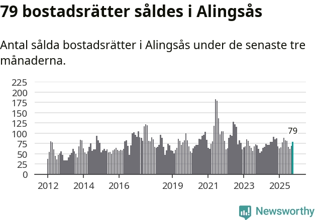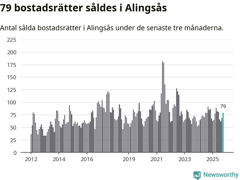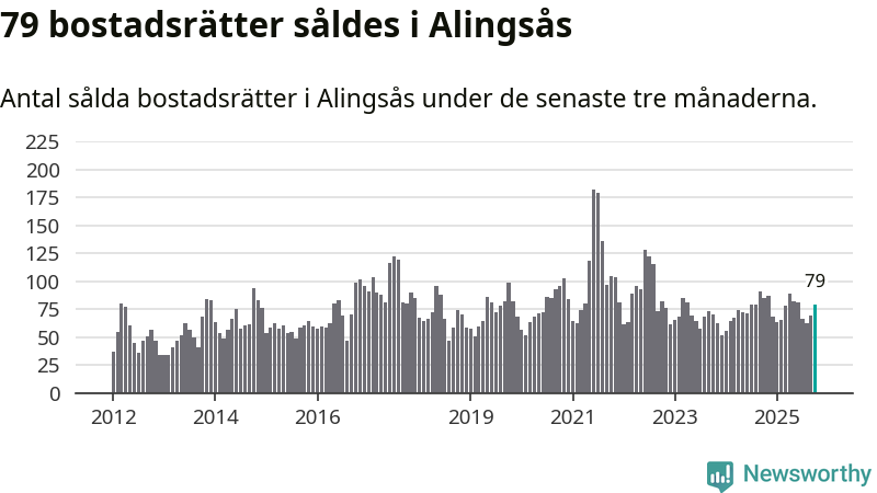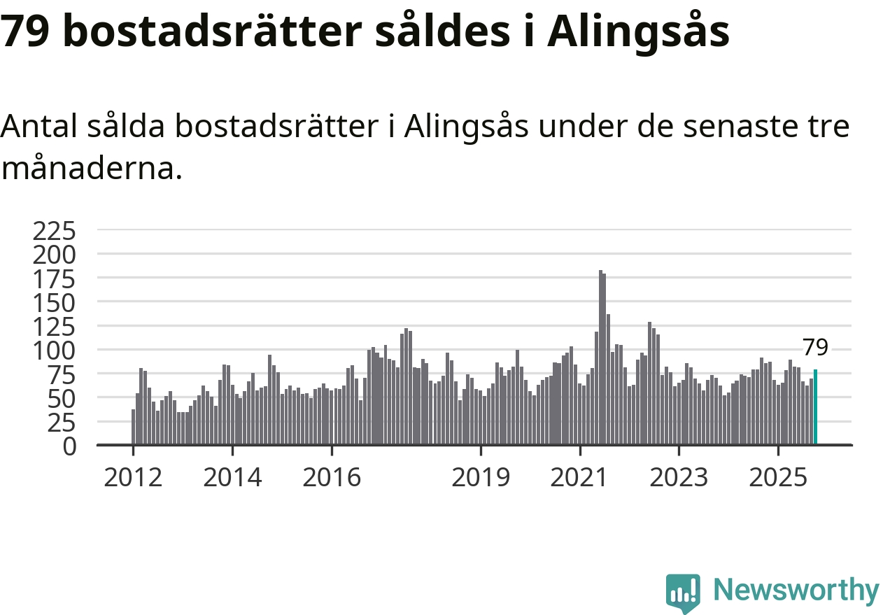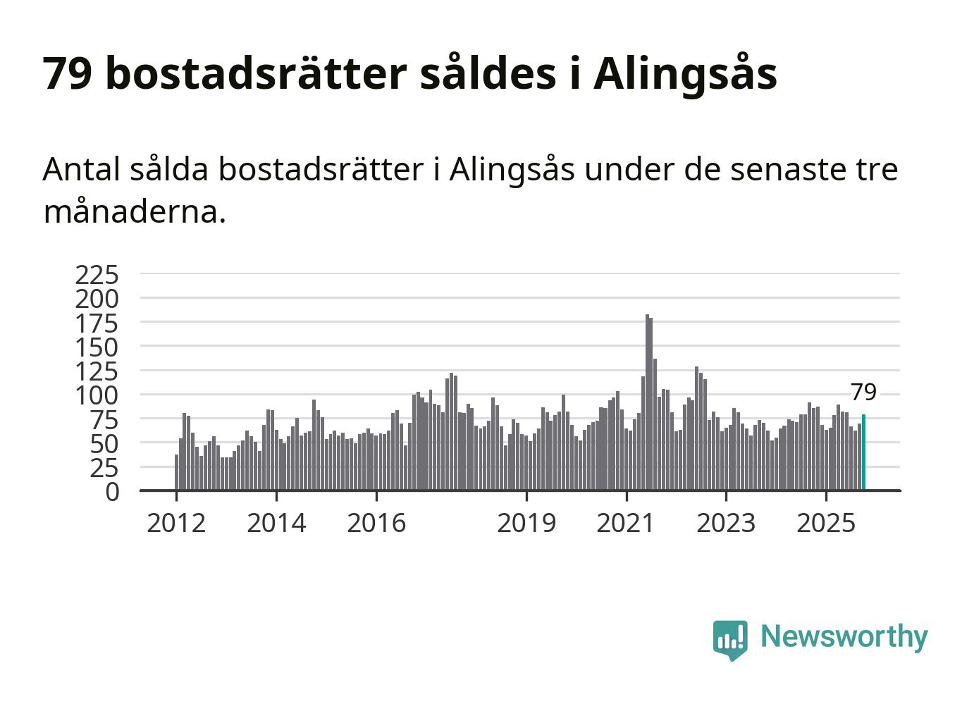 Sammanlagt såldes 79 bostadsrätter i Alingsås kommun mellan augusti och oktober till ett genomsnittligt pris på 2,5 miljoner kronor. I fjol gjordes 85 affärer vid den här tiden på året.
