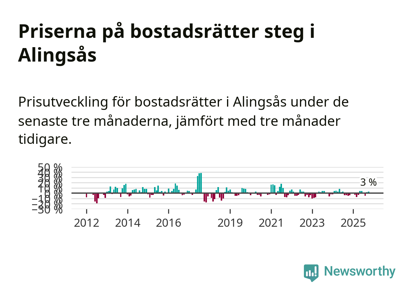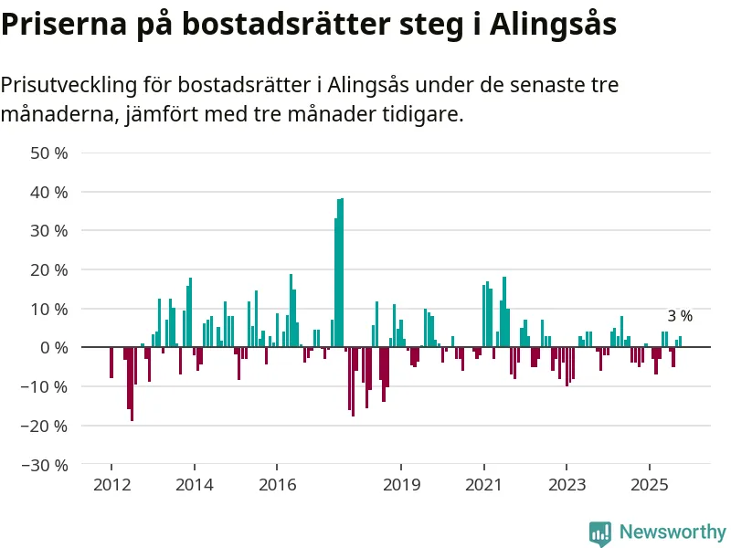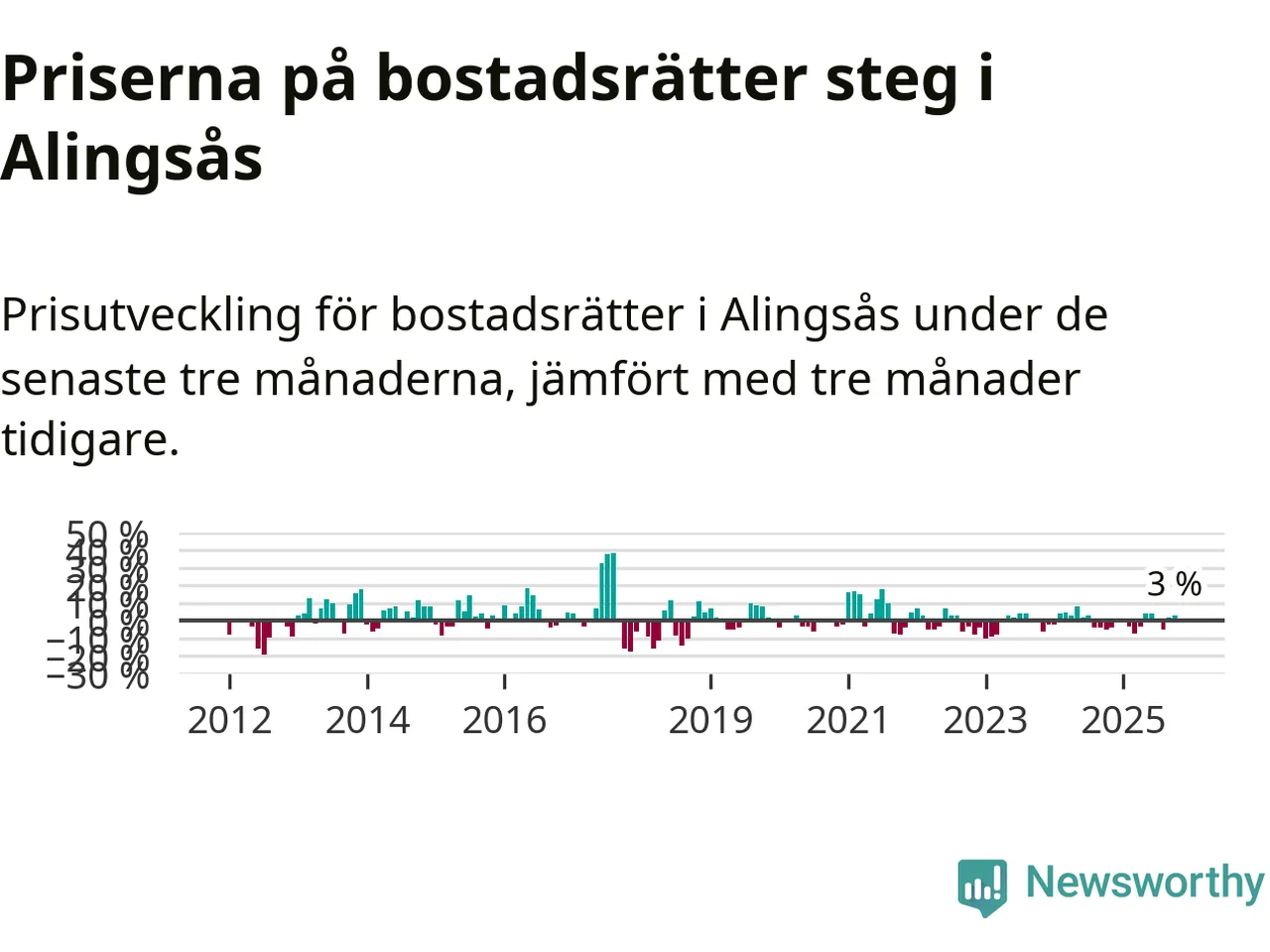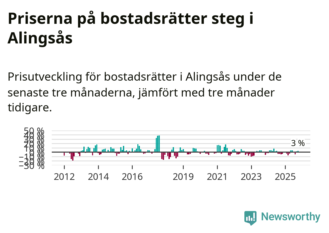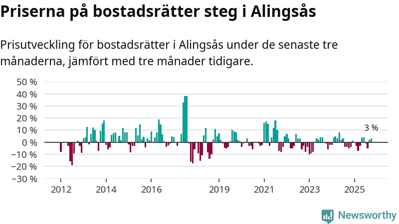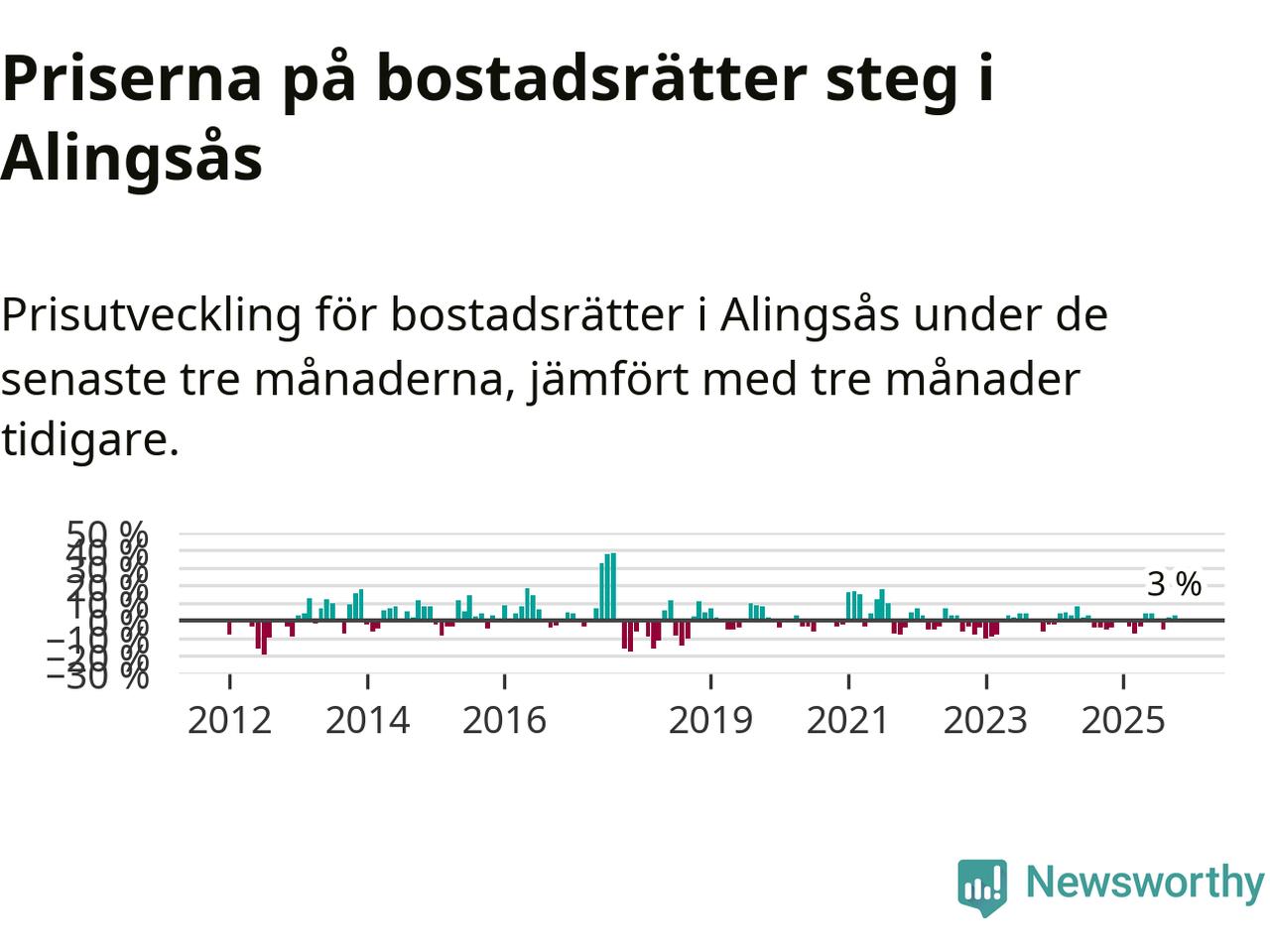 Priserna på bostadsrätter har gått upp i Alingsås kommun. Medelpriset på försäljningarna under de senaste tre månaderna visar på en uppgång med 3 procent.