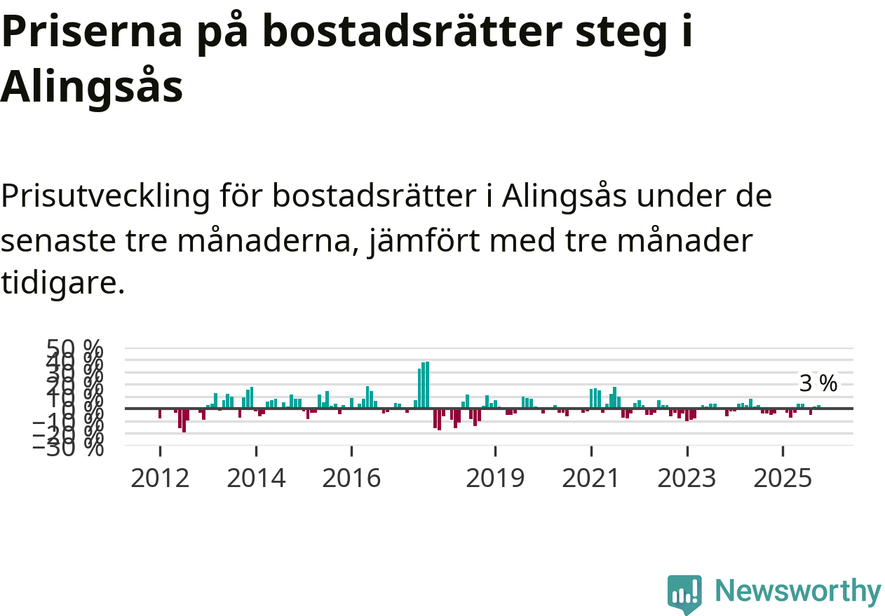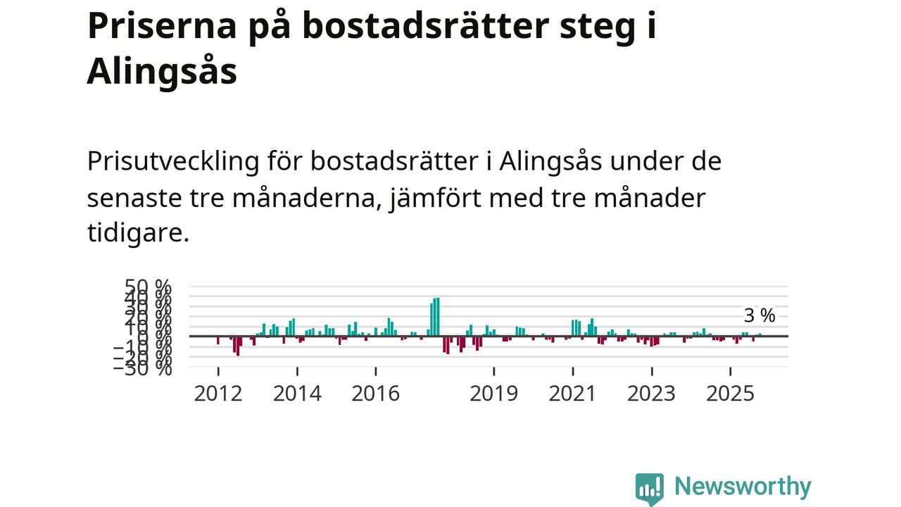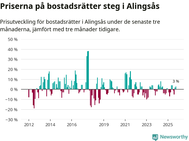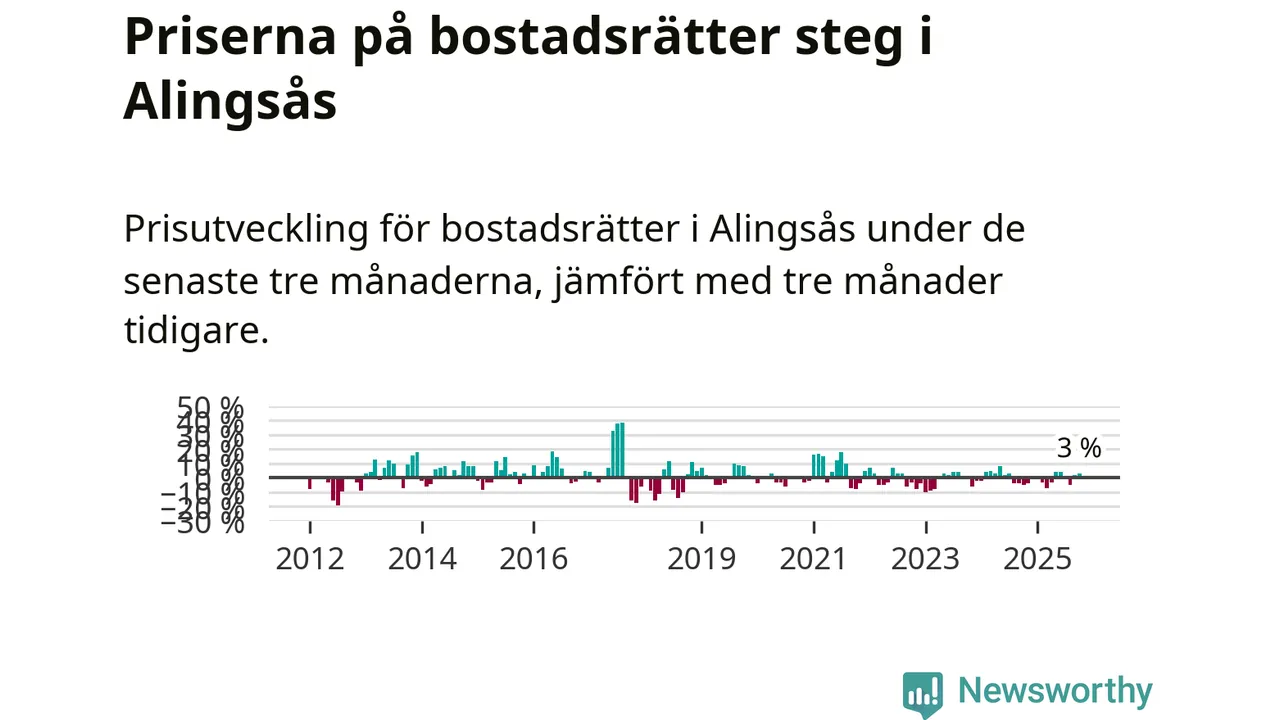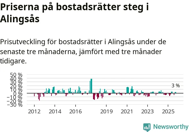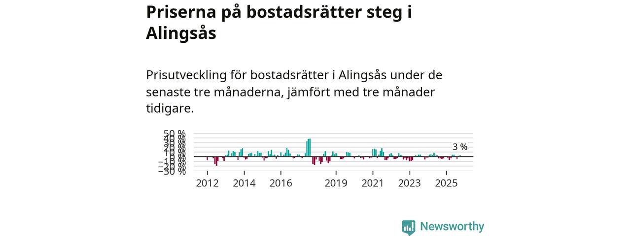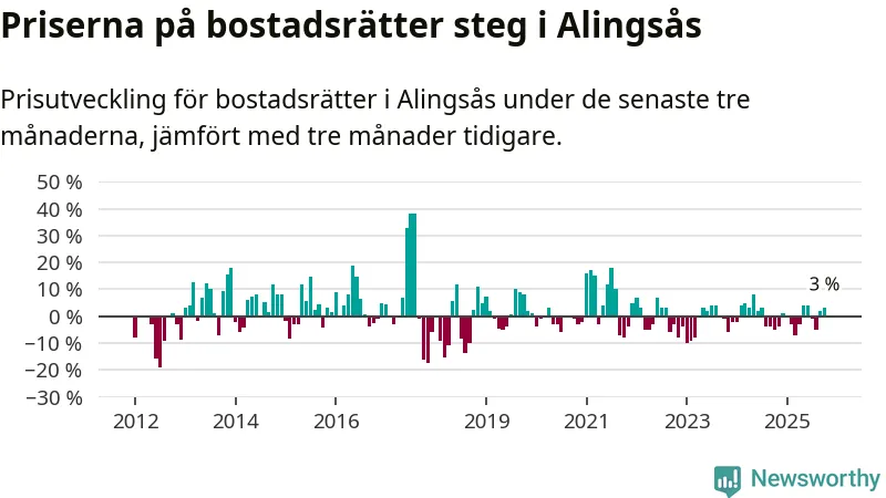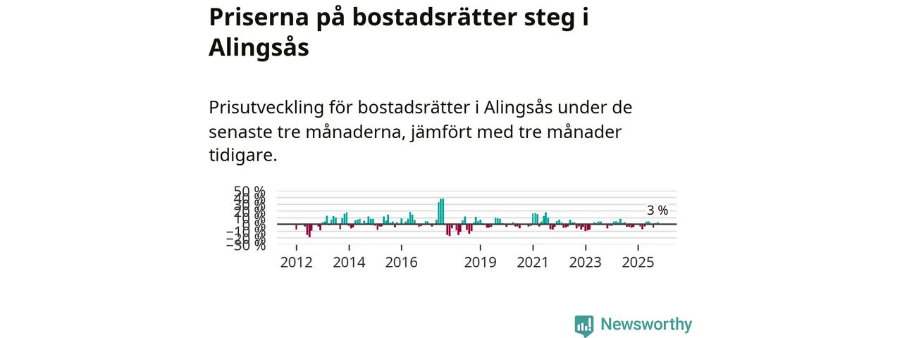 Priserna på bostadsrätter har gått upp i Alingsås kommun. Medelpriset på försäljningarna under de senaste tre månaderna visar på en uppgång med 3 procent.