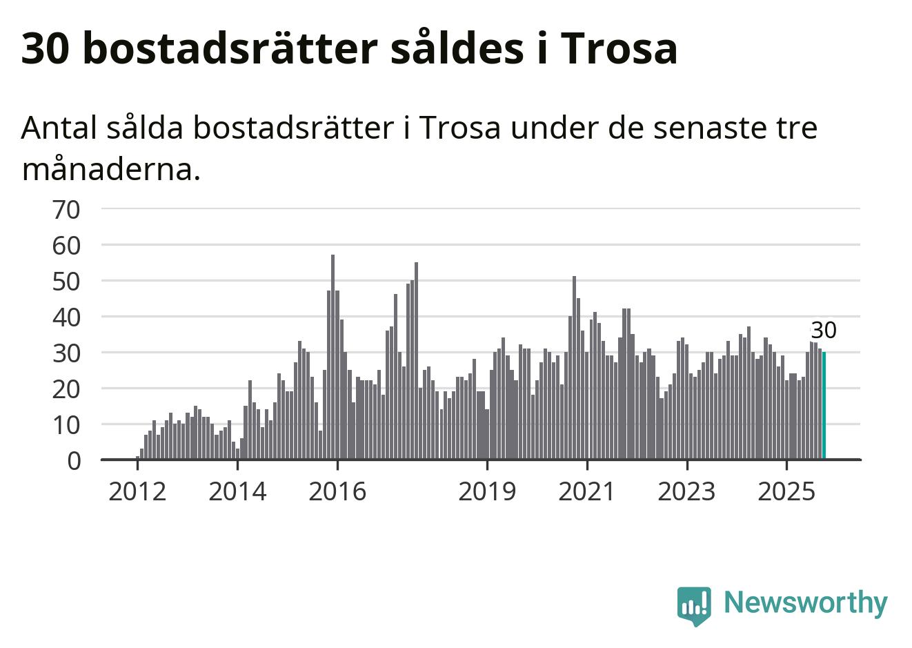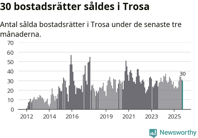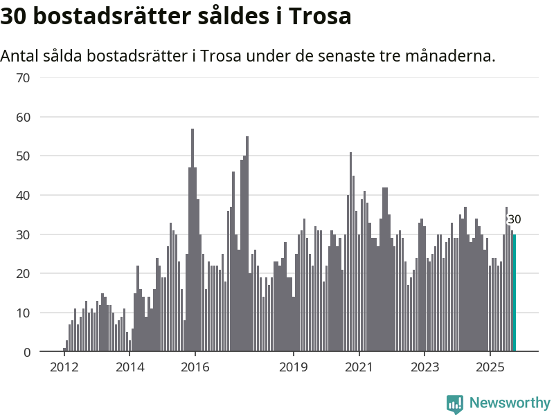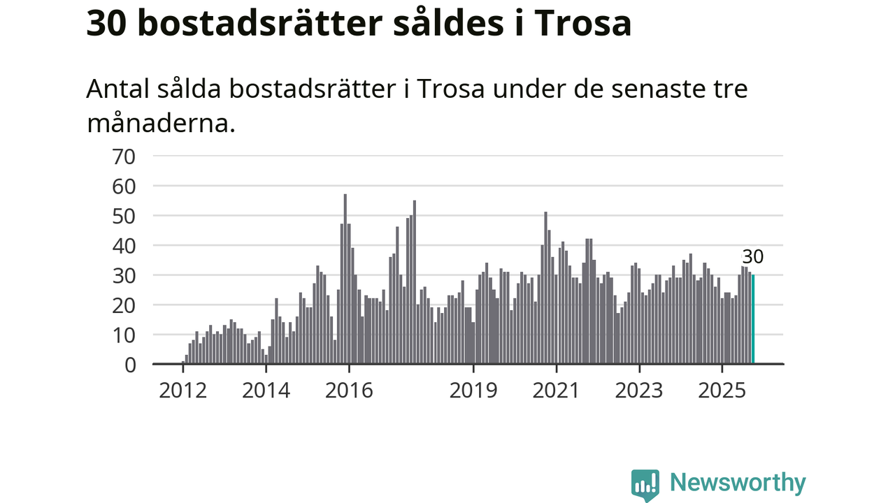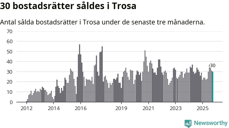 Mellan augusti och oktober gjordes sammanlagt 30 affärer med bostadsrätter i Trosa kommun. Det är lika många affärer som vid motsvarande tid i fjol.