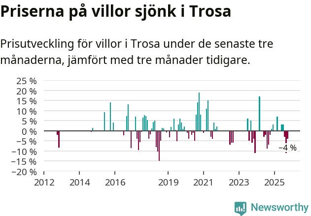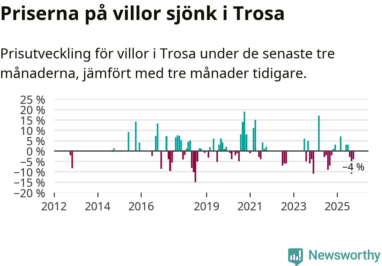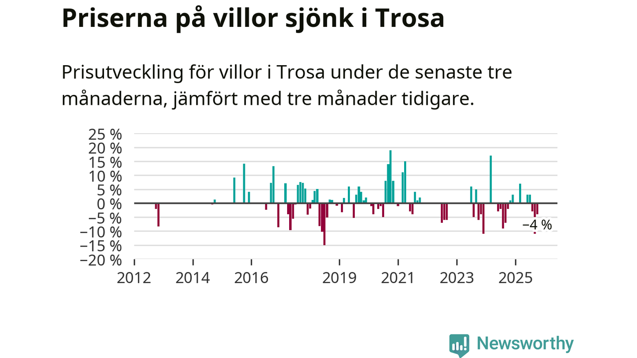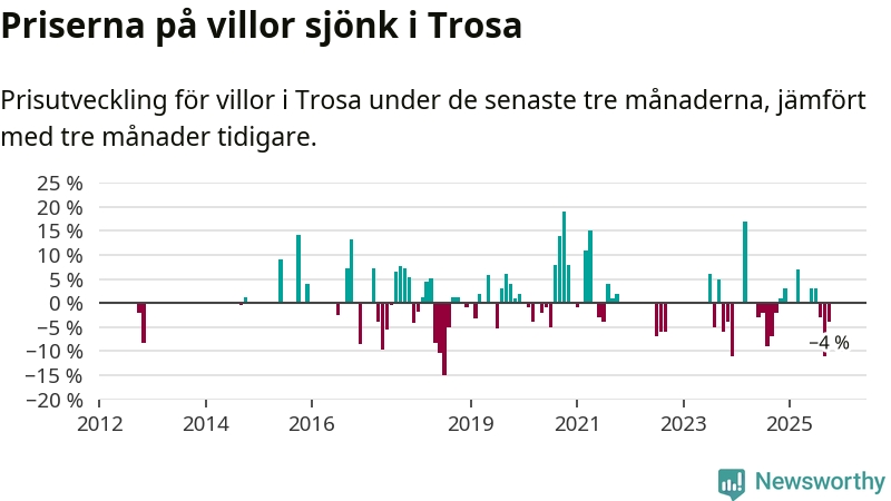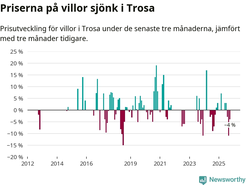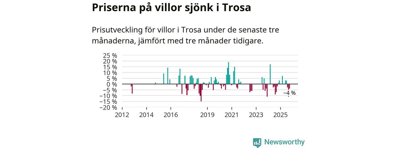 Statistiken visar även på en kännbar prisnedgång i Trosa kommun. Medelpriset på försäljningarna av villor i kommunen var 4 procent lägre än för tre månader sedan. Även i hela Södermanland sjunker villapriserna. I hela länet noterades en prisnedgång på 5 procent.