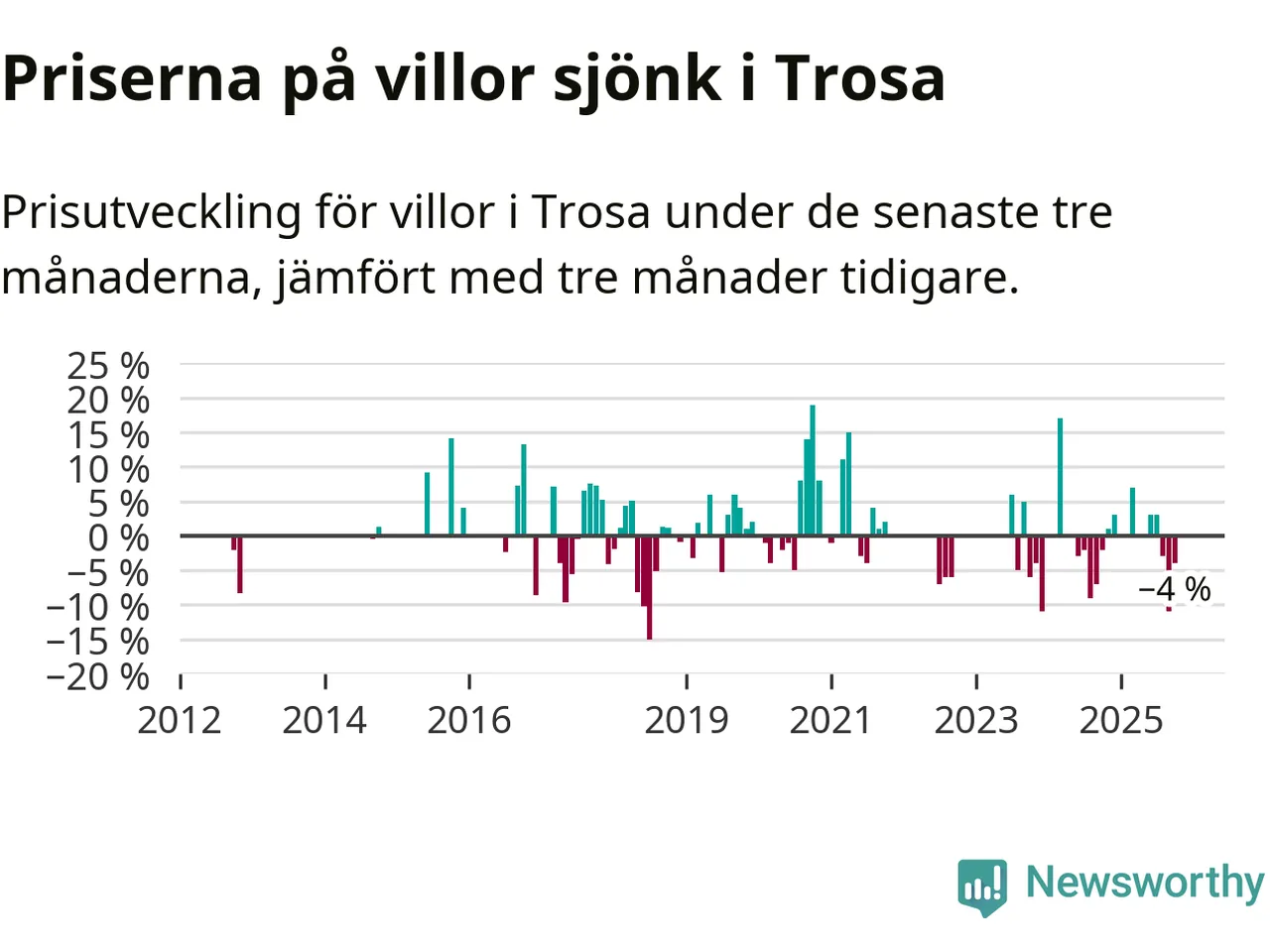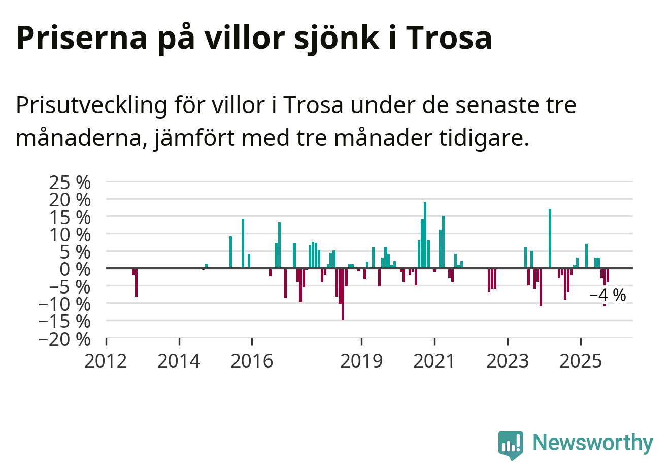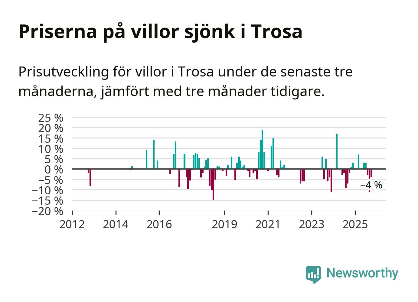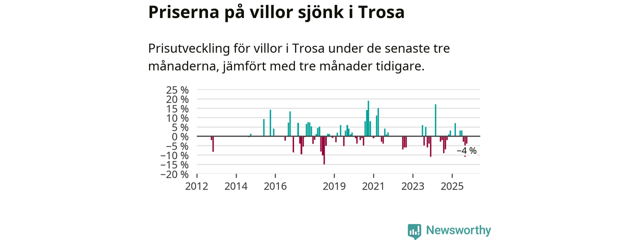 Statistiken visar även på en kännbar prisnedgång i Trosa kommun. Medelpriset på försäljningarna av villor i kommunen var 4 procent lägre än för tre månader sedan. Även i hela Södermanland sjunker villapriserna. I hela länet noterades en prisnedgång på 5 procent.
