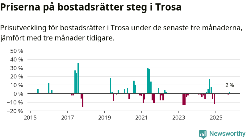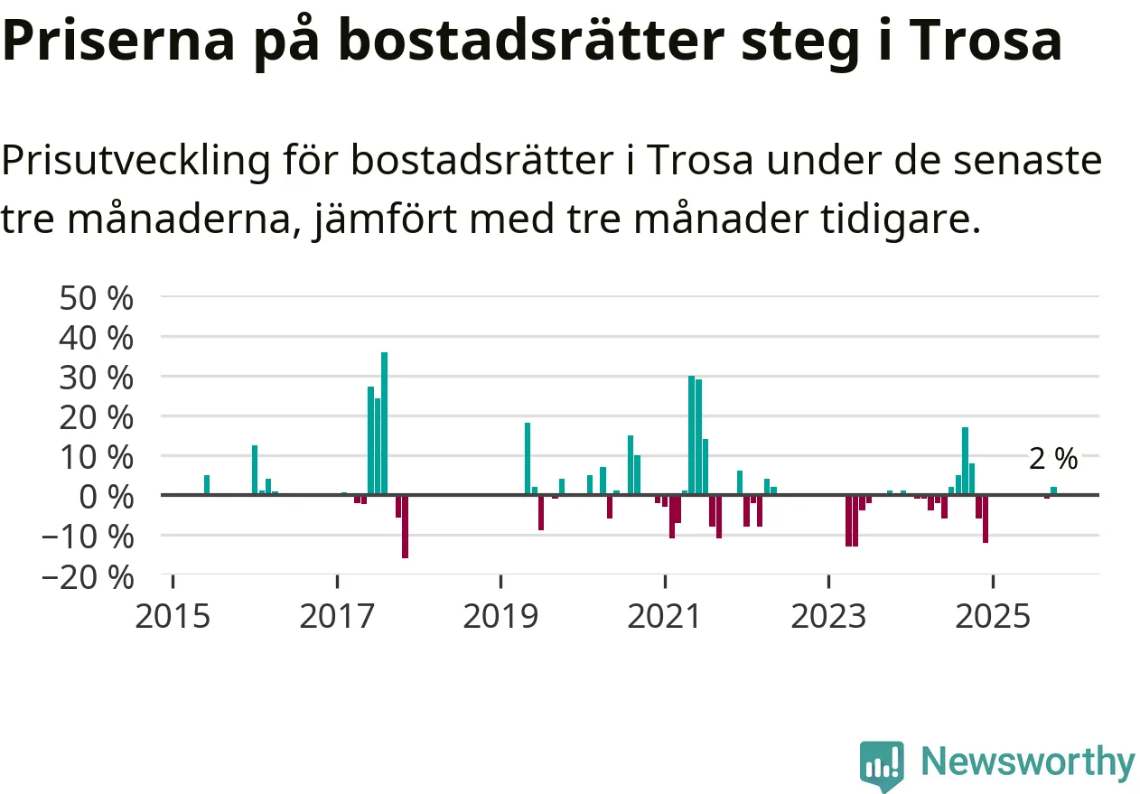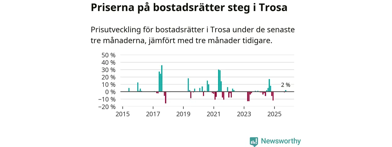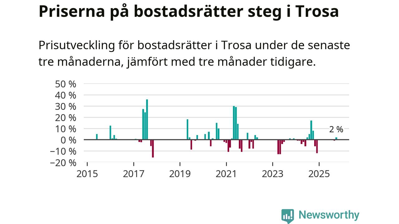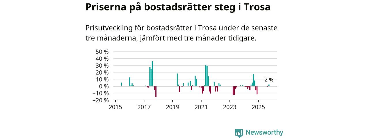 Statistiken visar även på en prisuppgång i Trosa kommun. Medelpriset på försäljningarna av bostadsrätter i kommunen var 2 procent högre än för tre månader sedan. Även i hela Södermanland ökar priserna på bostadsrätter. I hela länet noterades en prisuppgång på 4 procent.