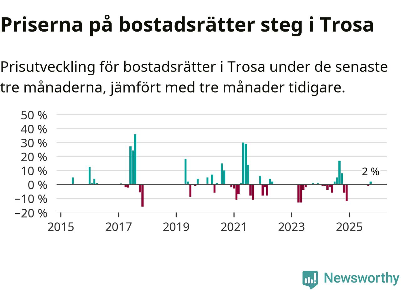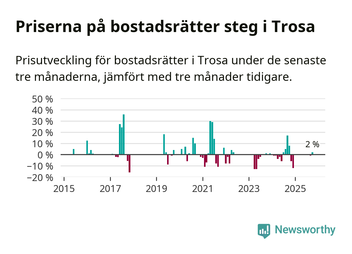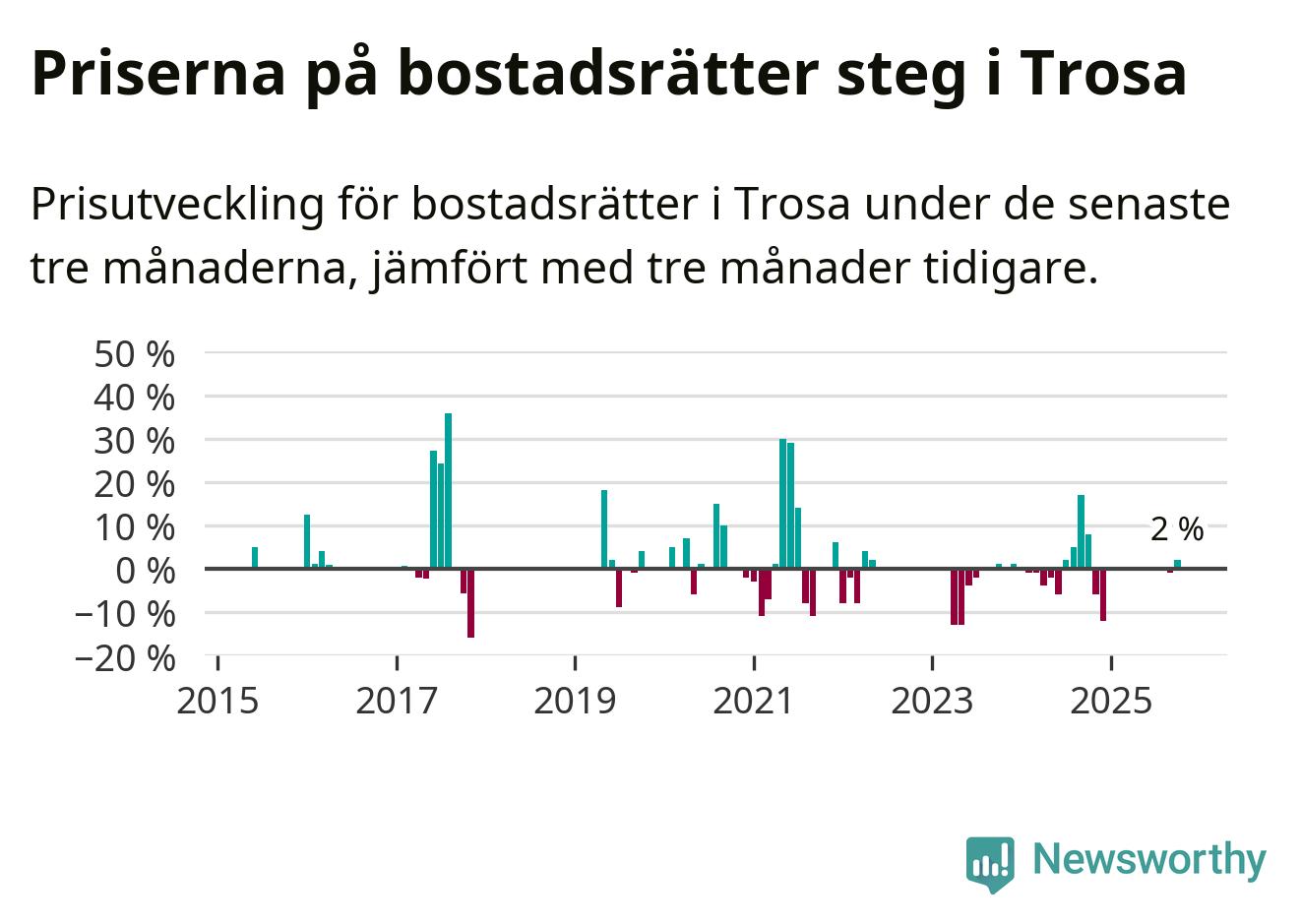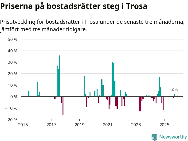 Statistiken visar även på en prisuppgång i Trosa kommun. Medelpriset på försäljningarna av bostadsrätter i kommunen var 2 procent högre än för tre månader sedan. Även i hela Södermanland ökar priserna på bostadsrätter. I hela länet noterades en prisuppgång på 4 procent.
