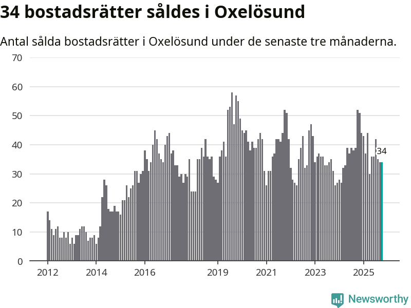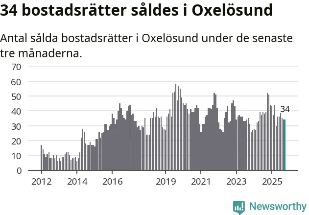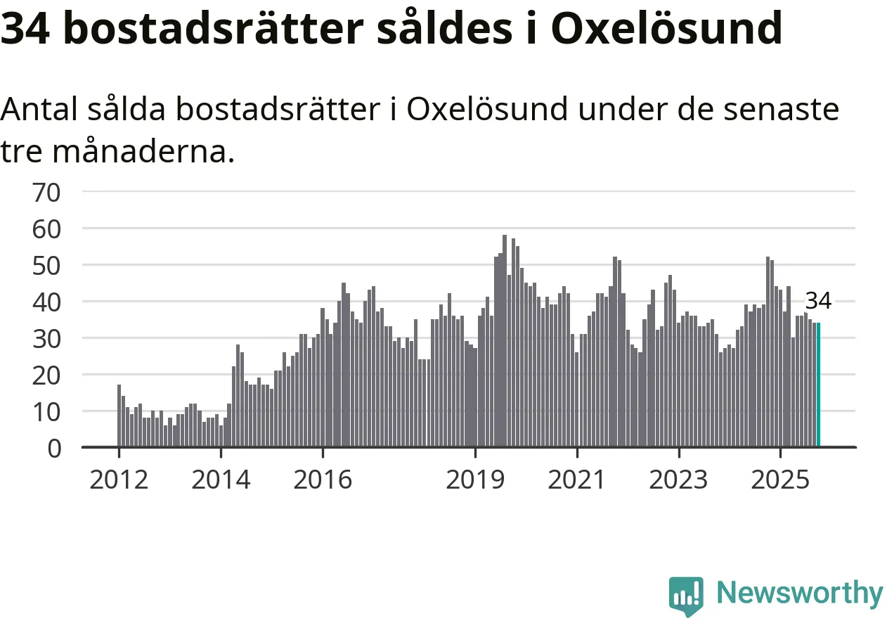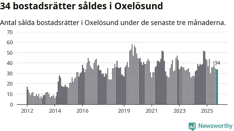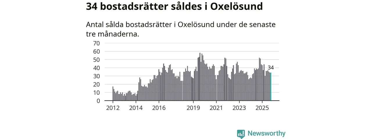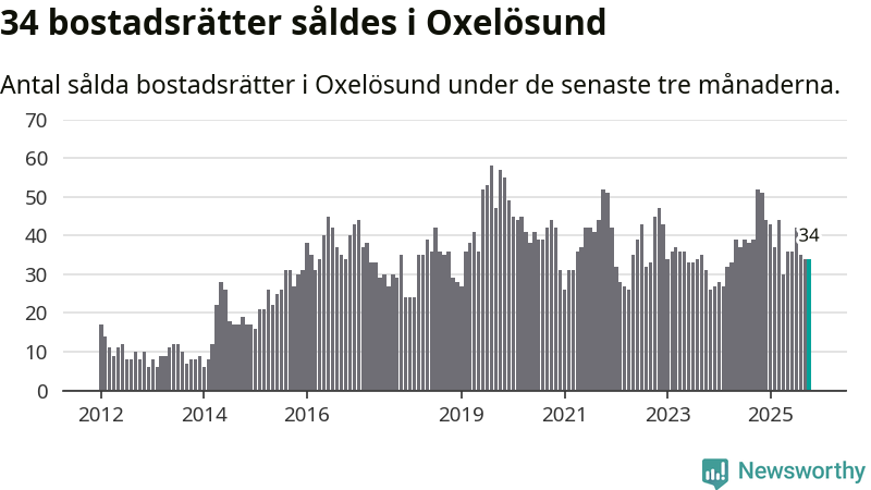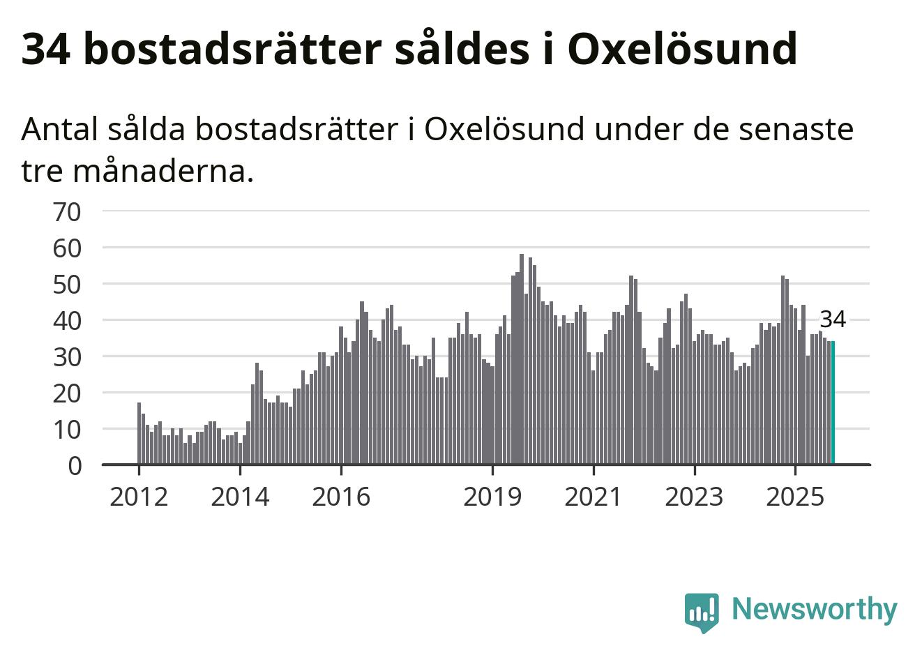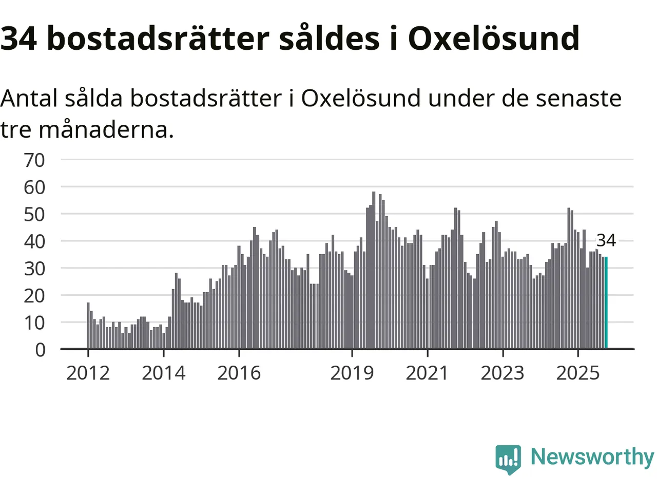 Sammanlagt såldes 34 bostadsrätter i Oxelösunds kommun mellan augusti och oktober till ett genomsnittligt pris på 0,5 miljoner kronor. I fjol gjordes 52 affärer vid den här tiden på året.