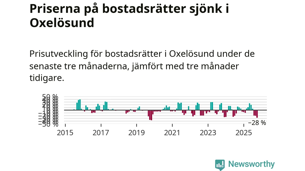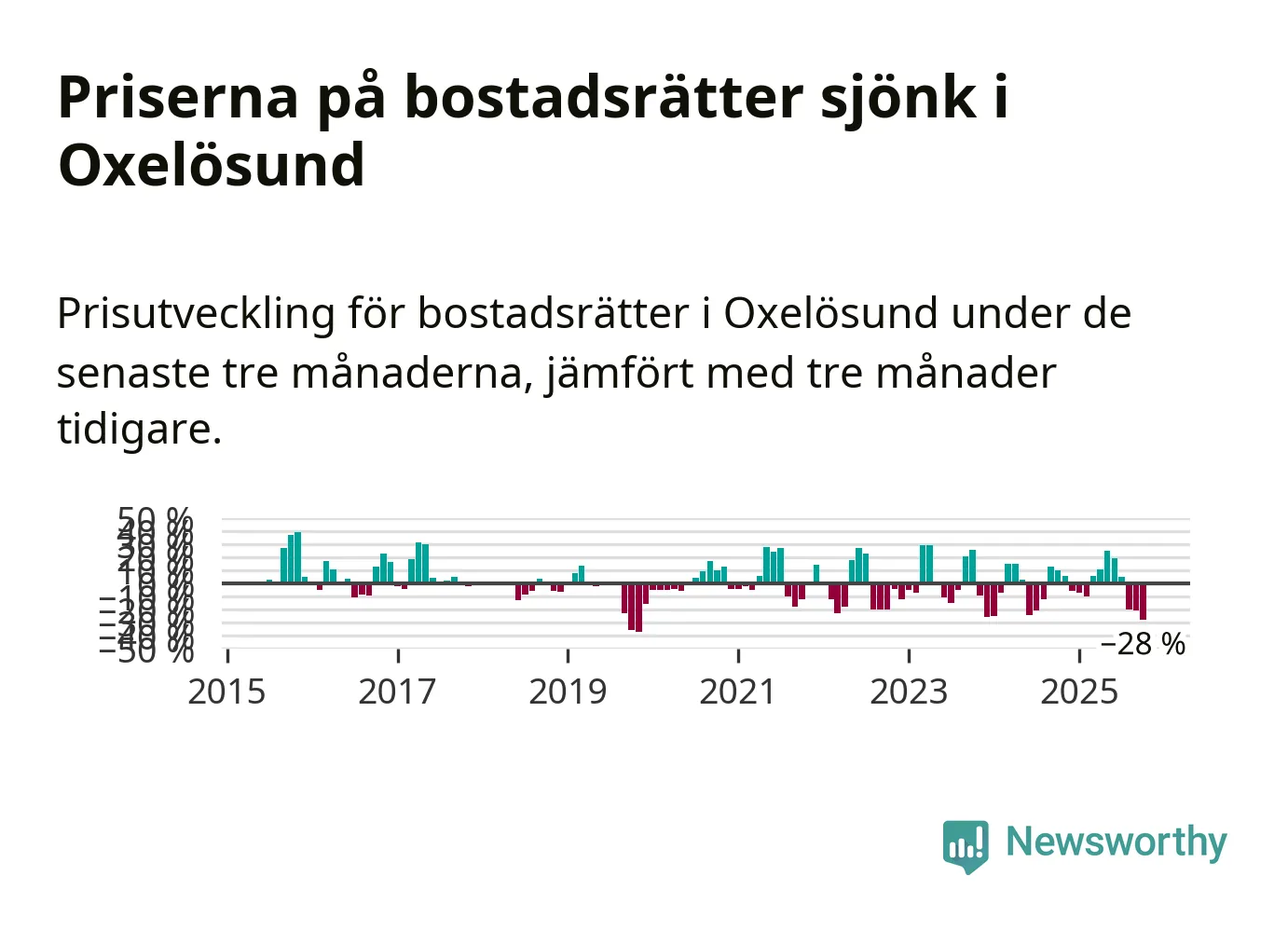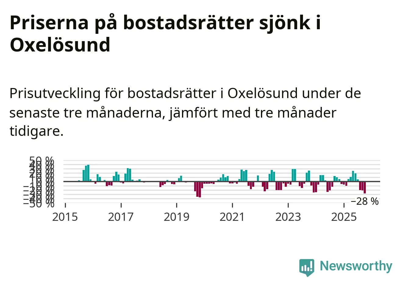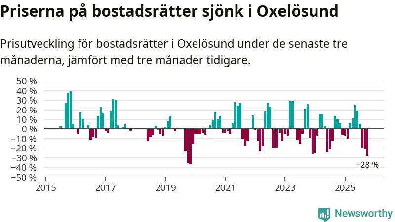 Priserna på bostadsrätter sjönk med 28 procent i Oxelösunds kommun under de senaste tre månaderna. Det är den svagaste prisutvecklingen sedan 2019.