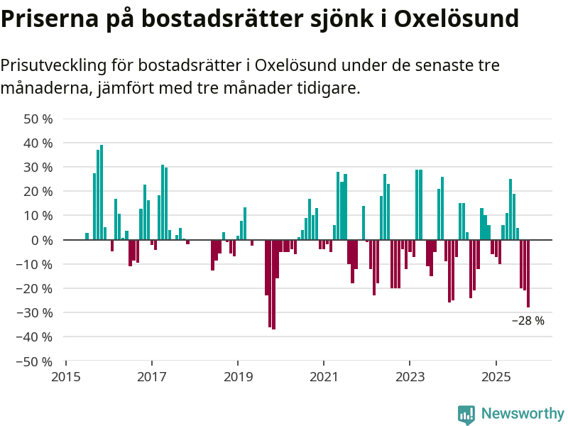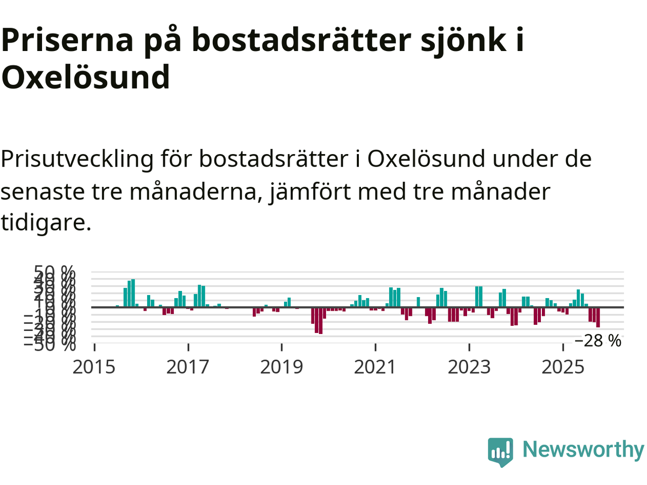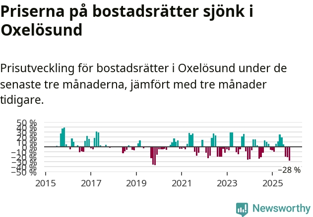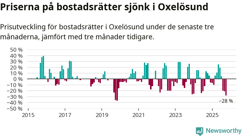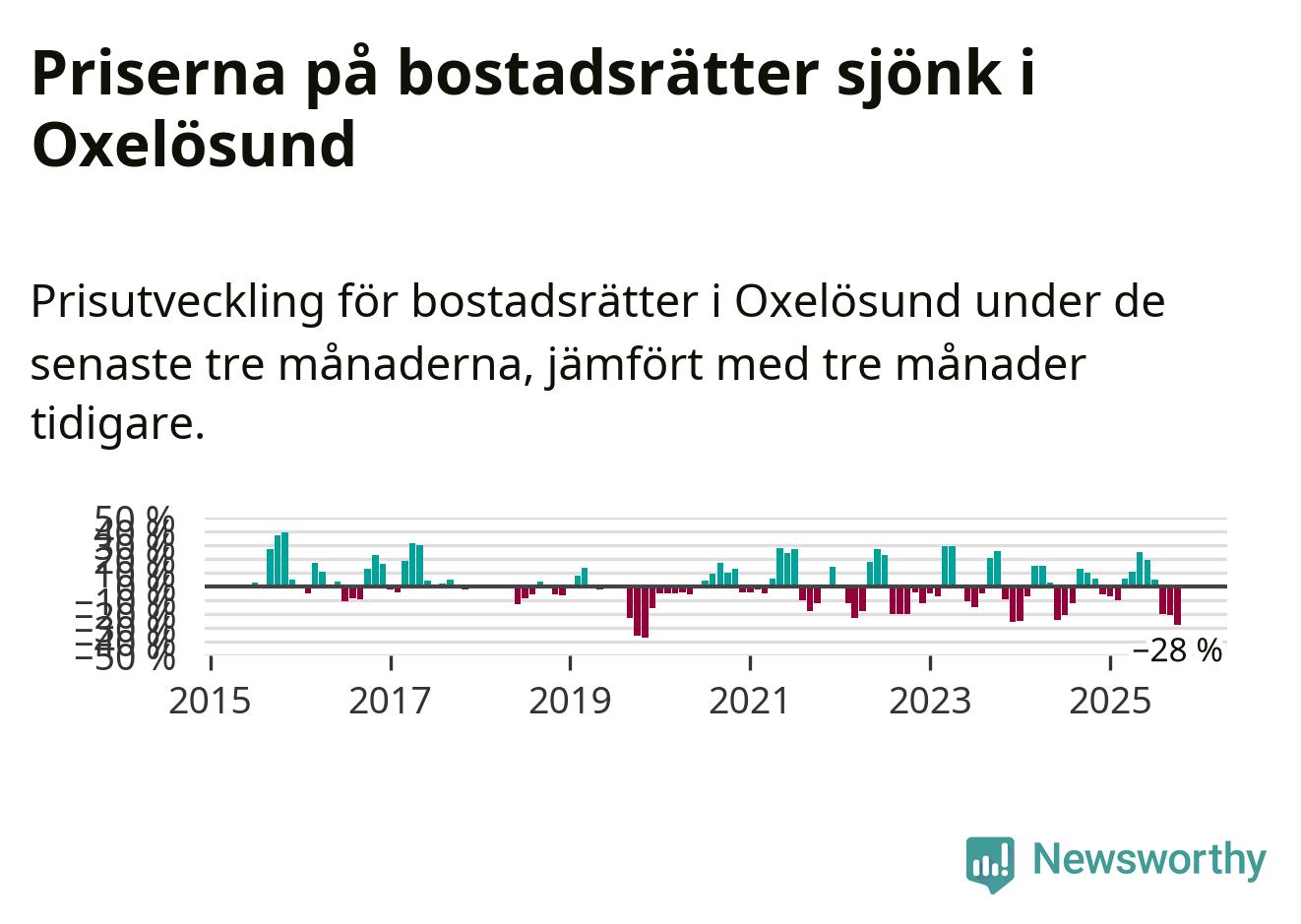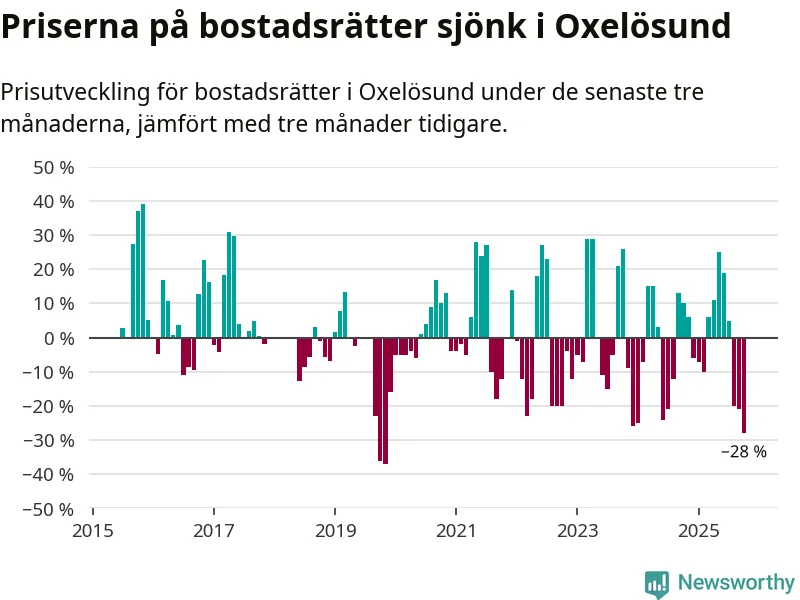 Priserna på bostadsrätter sjönk med 28 procent i Oxelösunds kommun under de senaste tre månaderna. Det är den svagaste prisutvecklingen sedan 2019.