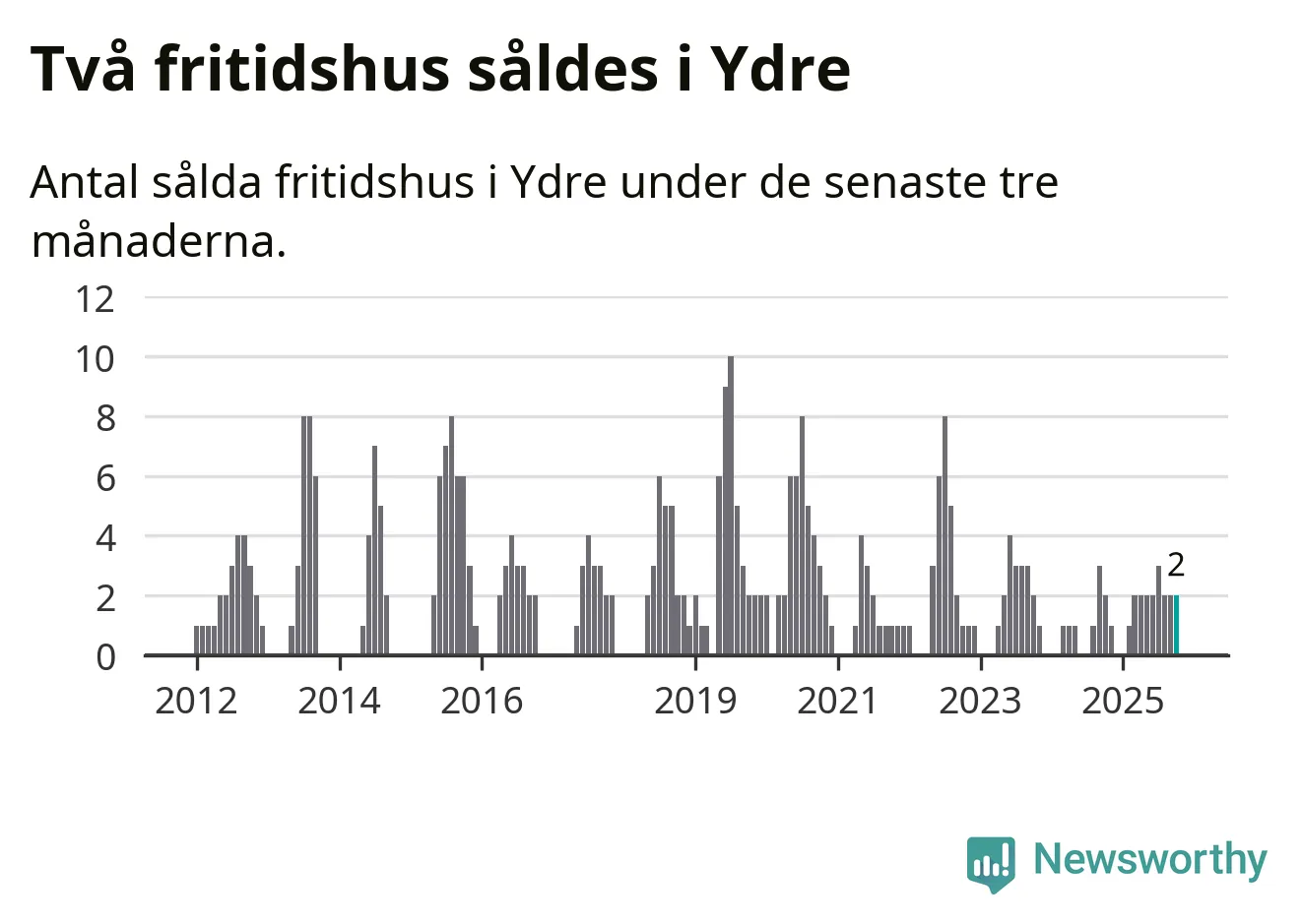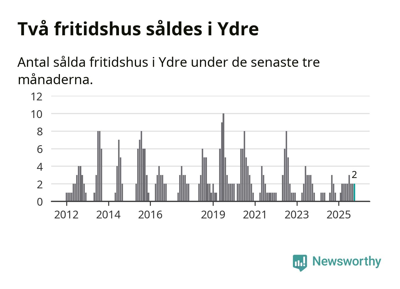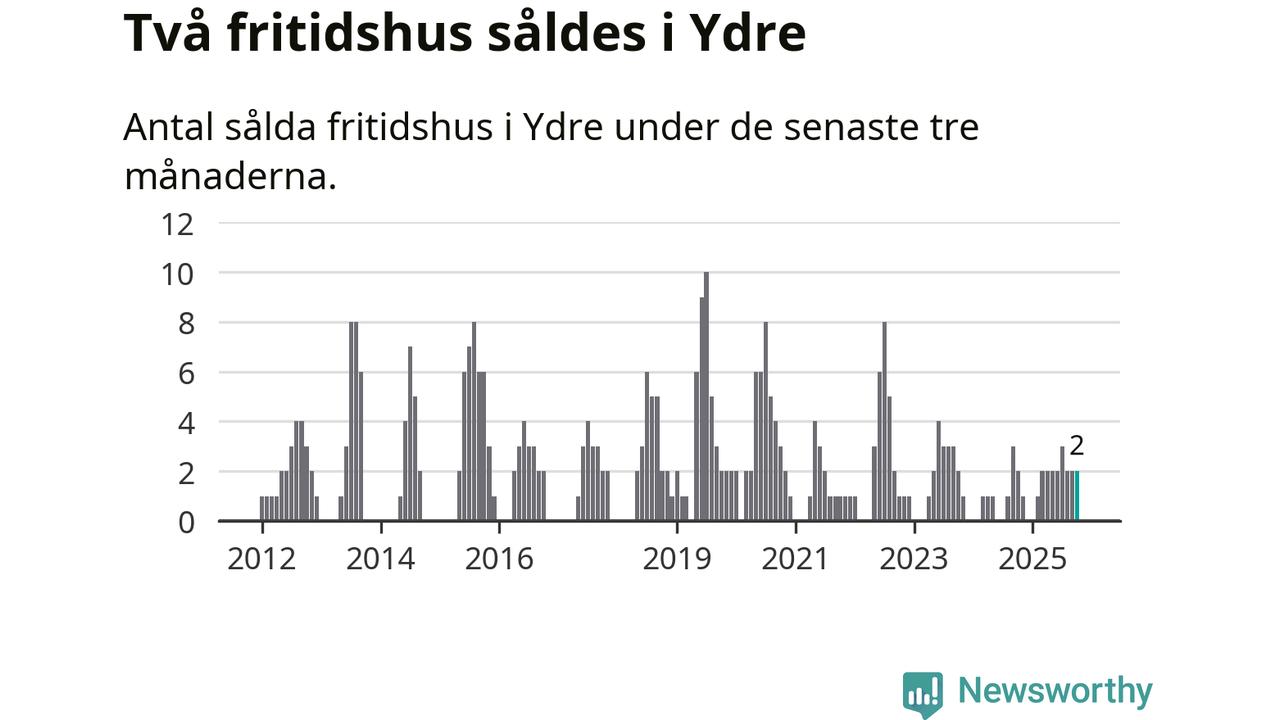 Mellan augusti och oktober gjordes sammanlagt två affärer med fritidshus i Ydre kommun. Det är lika många affärer som vid motsvarande tid i fjol.