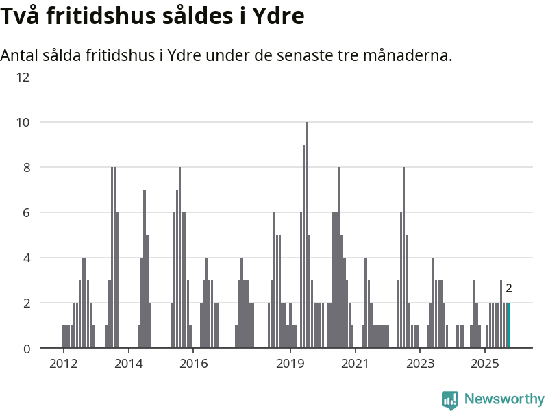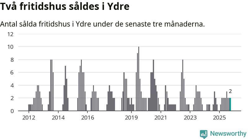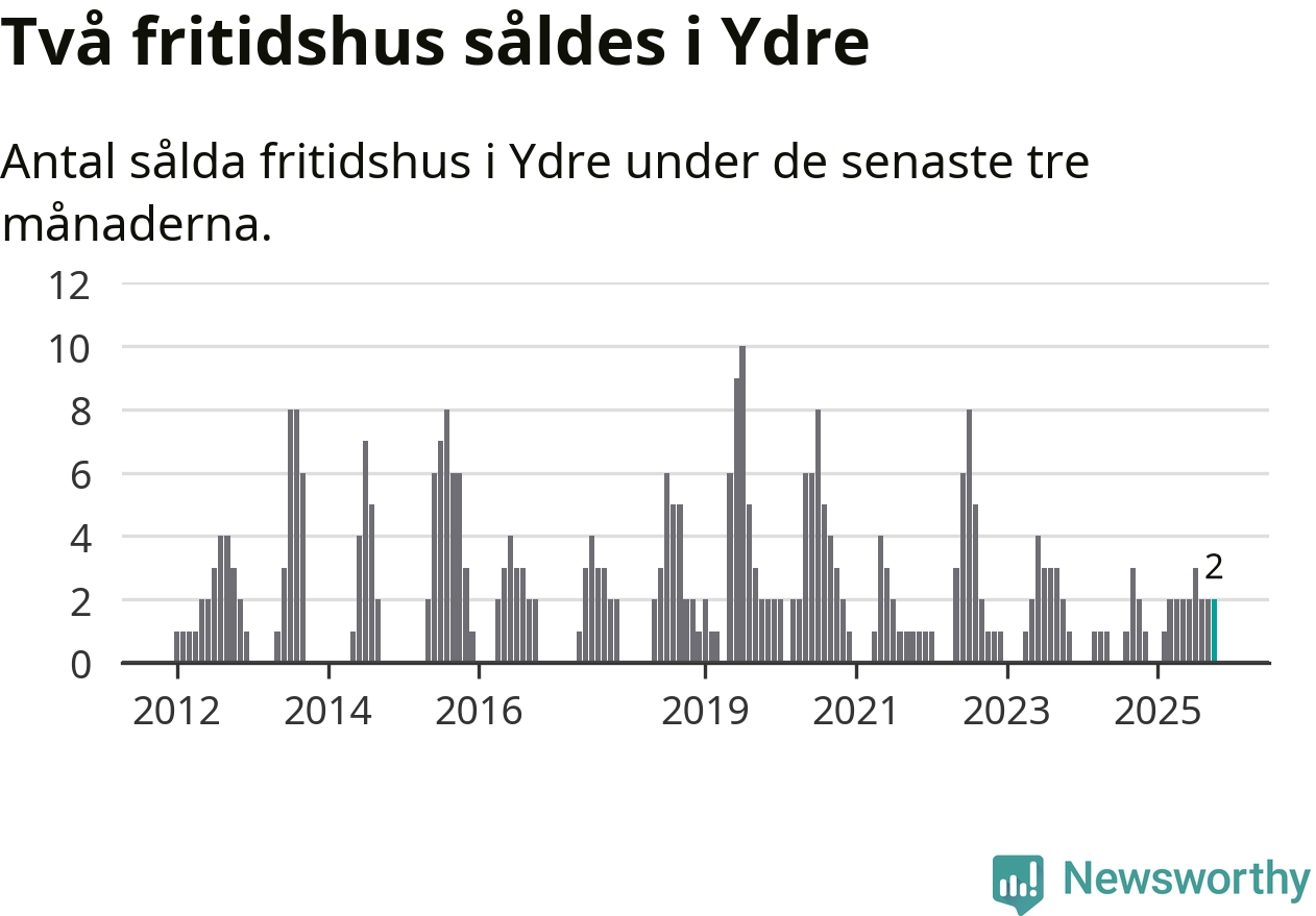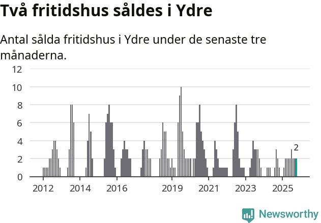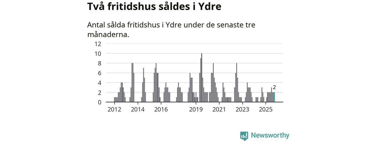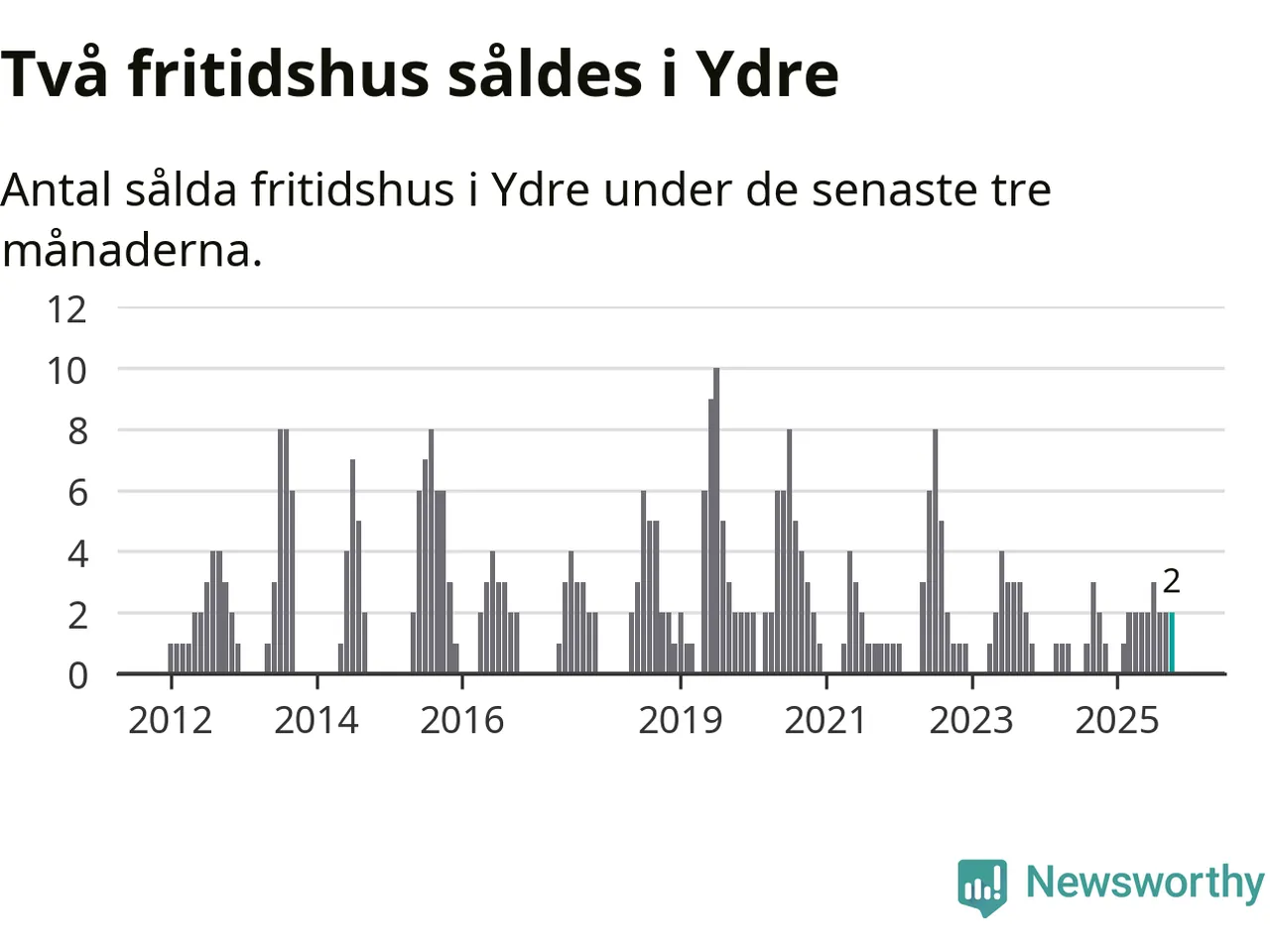 Mellan augusti och oktober gjordes sammanlagt två affärer med fritidshus i Ydre kommun. Det är lika många affärer som vid motsvarande tid i fjol.