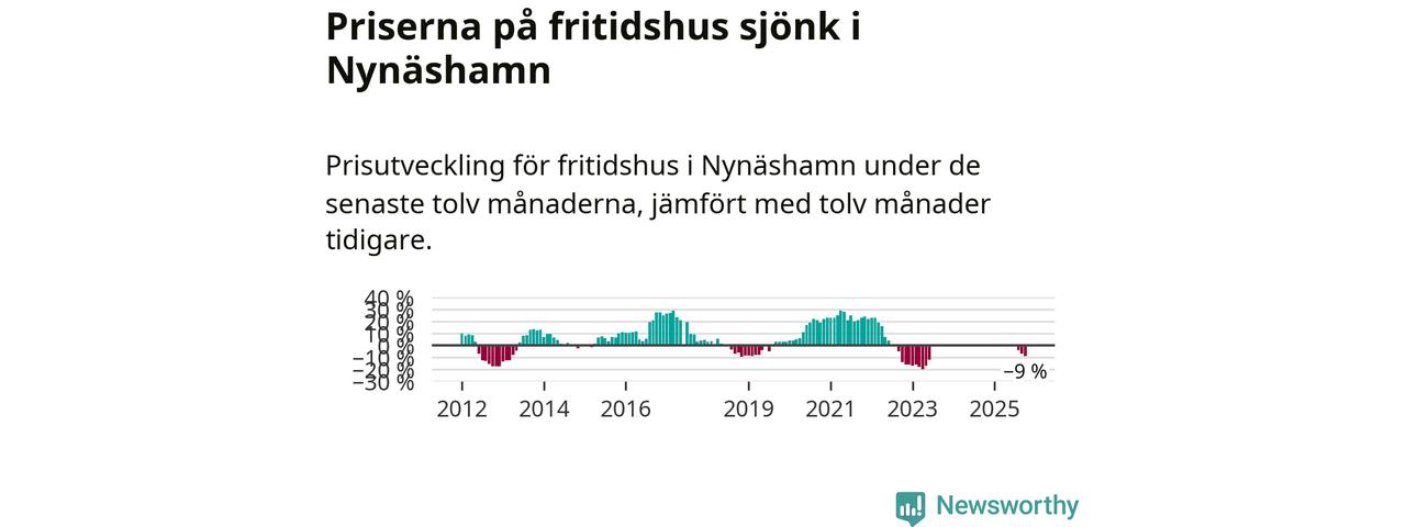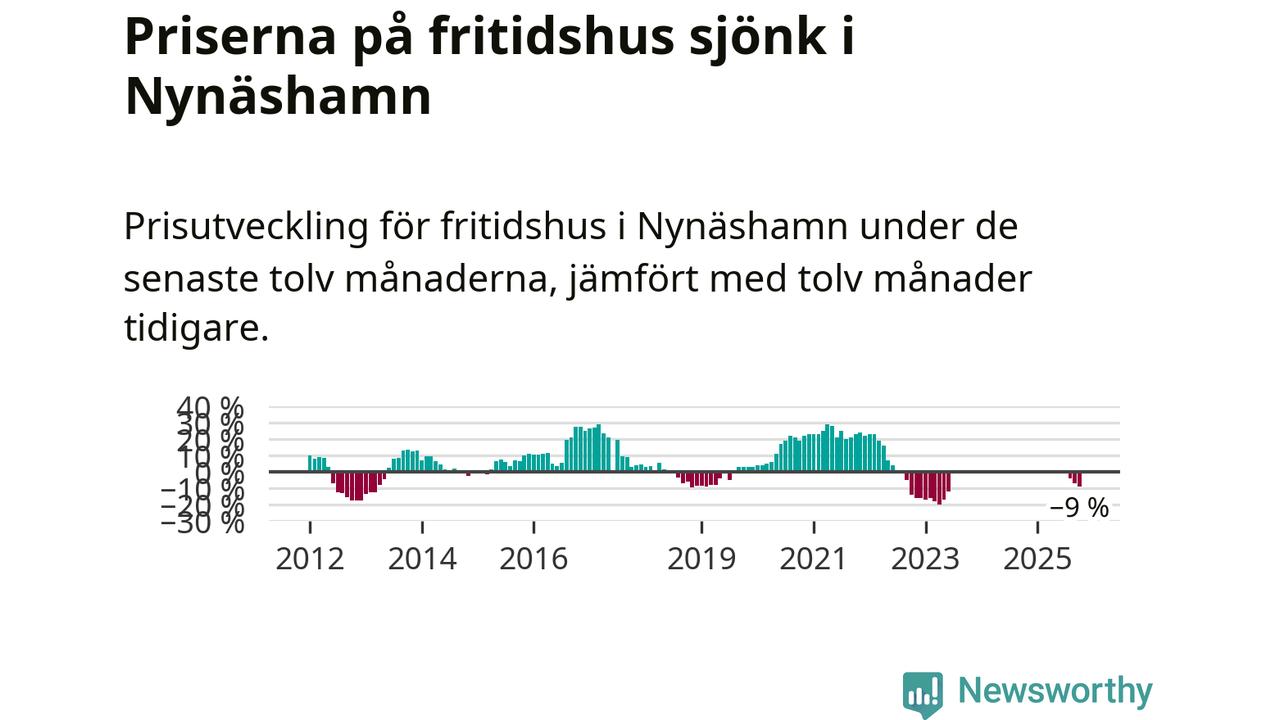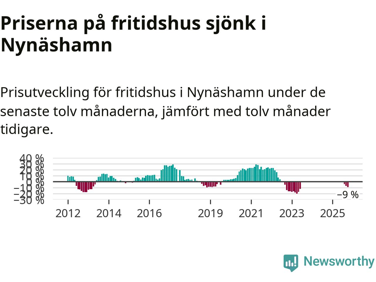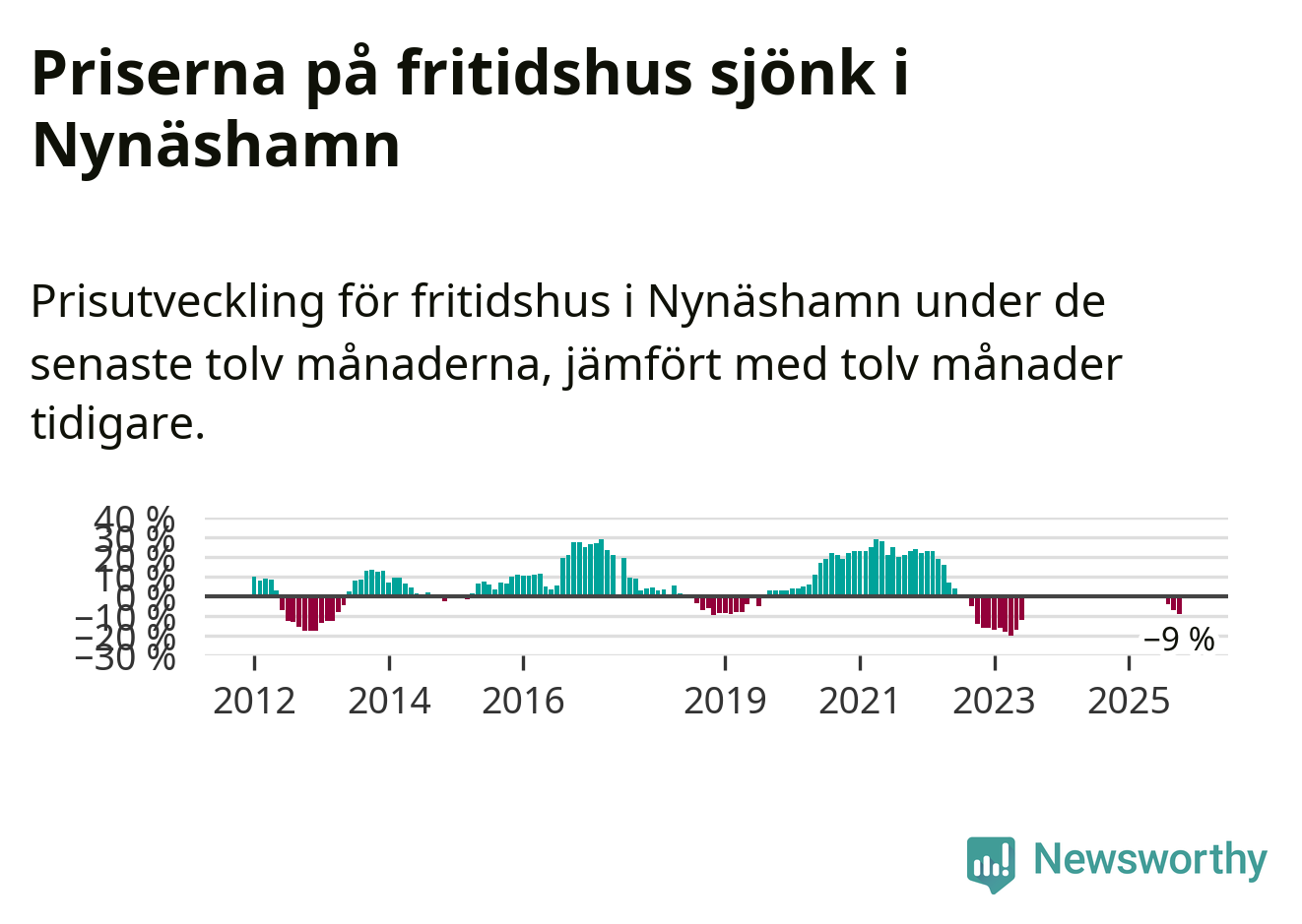 Priserna på fritidshus har gått ner i Nynäshamns kommun. Medelpriset på försäljningarna under de senaste tolv månaderna visar på en nedgång med 9 procent.