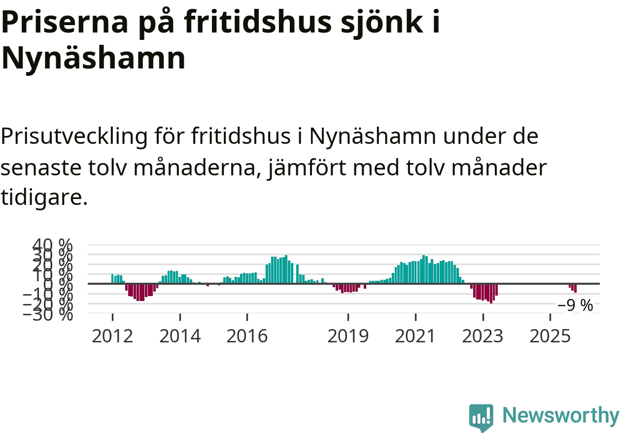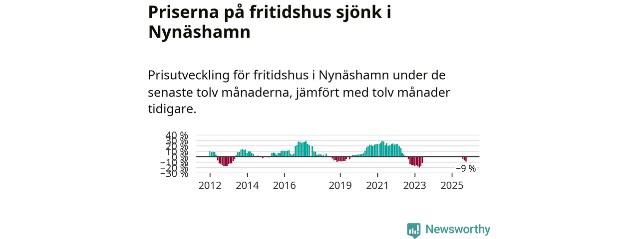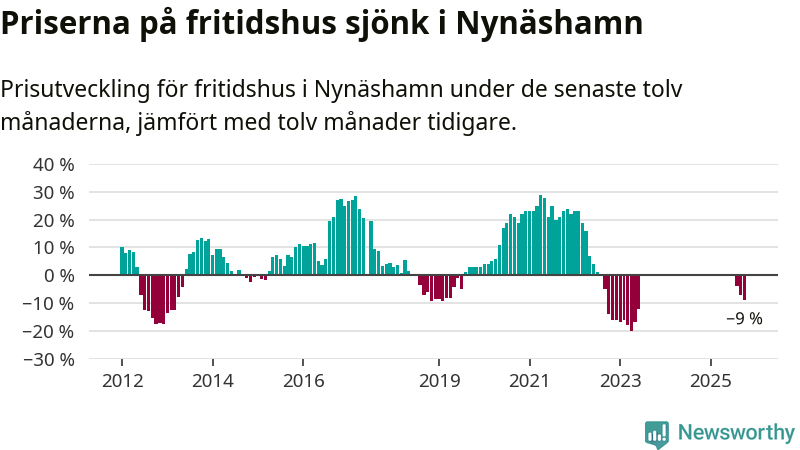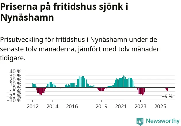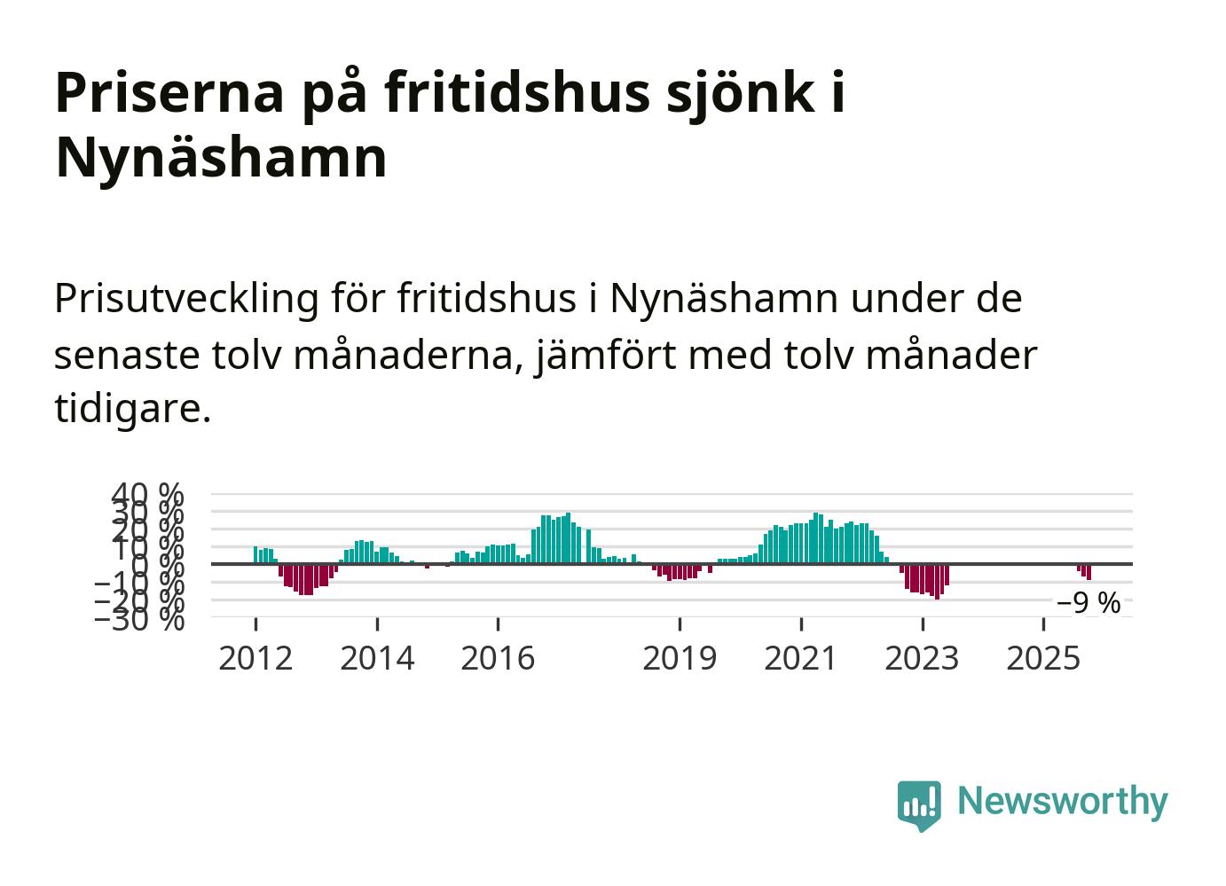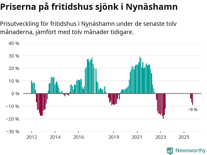 Priserna på fritidshus har gått ner i Nynäshamns kommun. Medelpriset på försäljningarna under de senaste tolv månaderna visar på en nedgång med 9 procent.