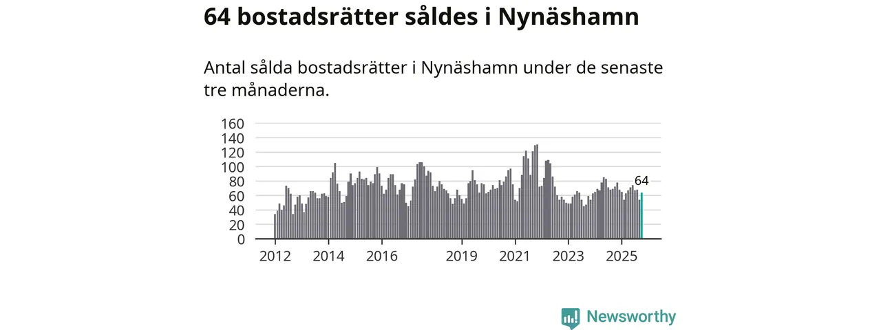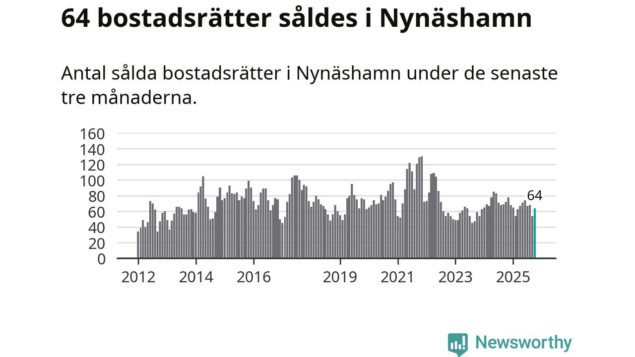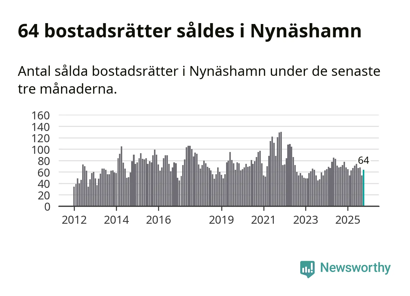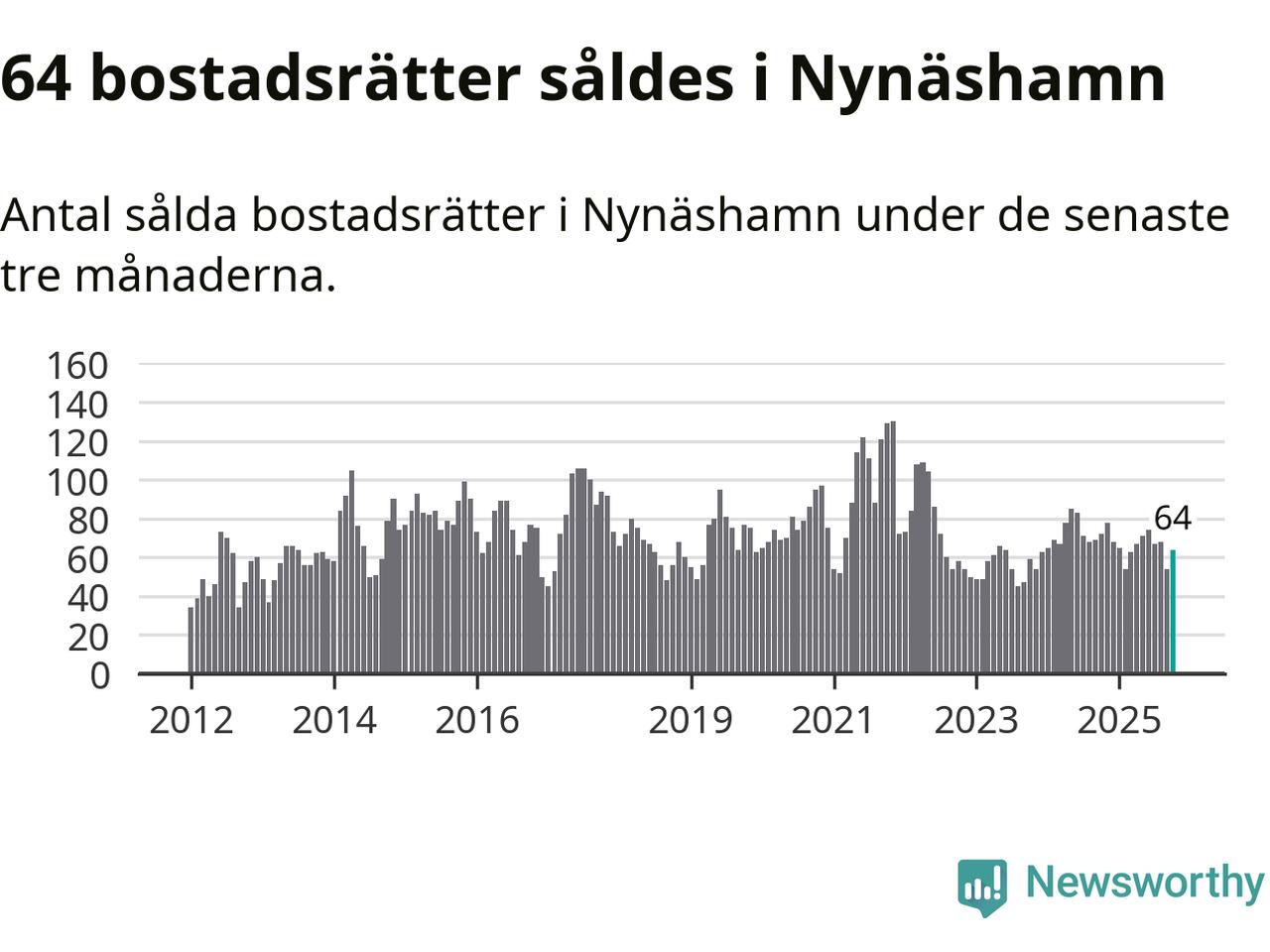 Sammanlagt såldes 64 bostadsrätter i Nynäshamns kommun mellan augusti och oktober till ett genomsnittligt pris på 1,7 miljoner kronor. I fjol gjordes 72 affärer vid den här tiden på året.
