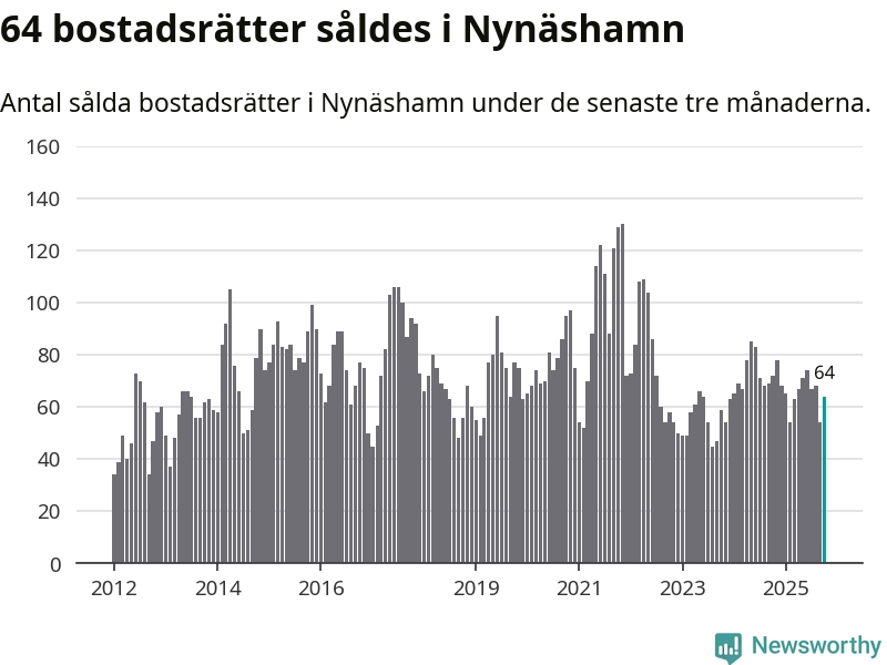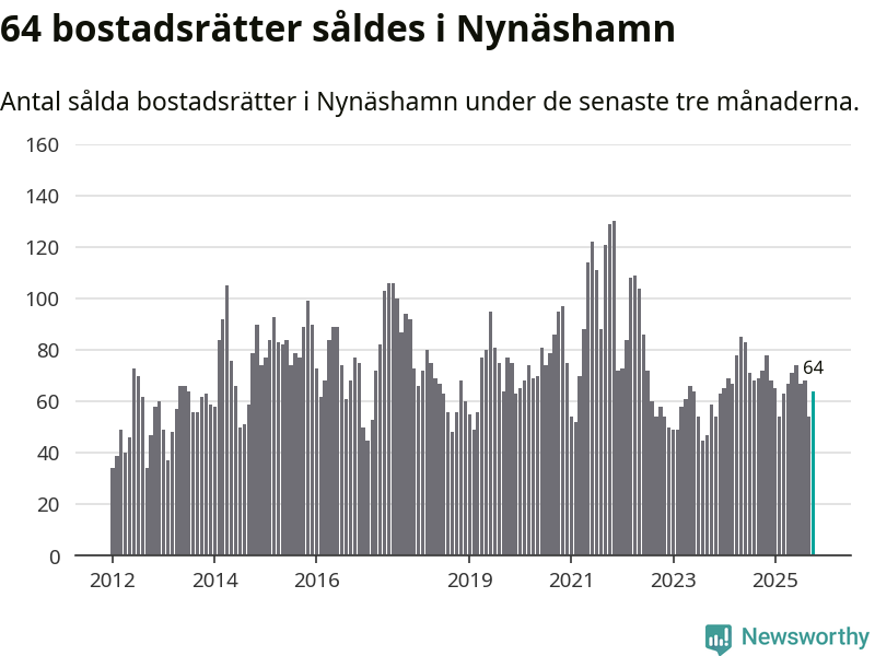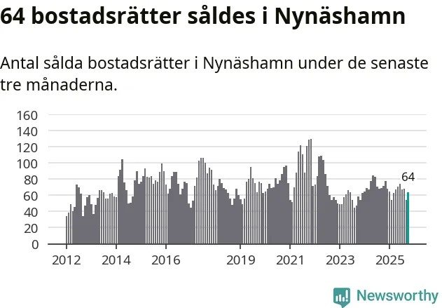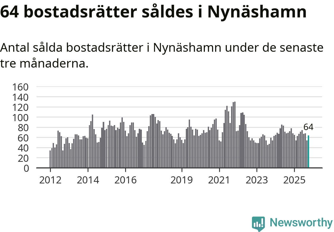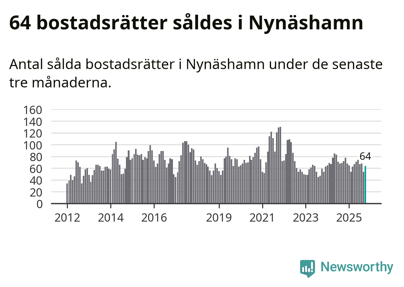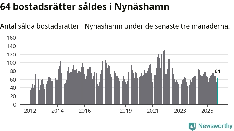 Sammanlagt såldes 64 bostadsrätter i Nynäshamns kommun mellan augusti och oktober till ett genomsnittligt pris på 1,7 miljoner kronor. I fjol gjordes 72 affärer vid den här tiden på året.