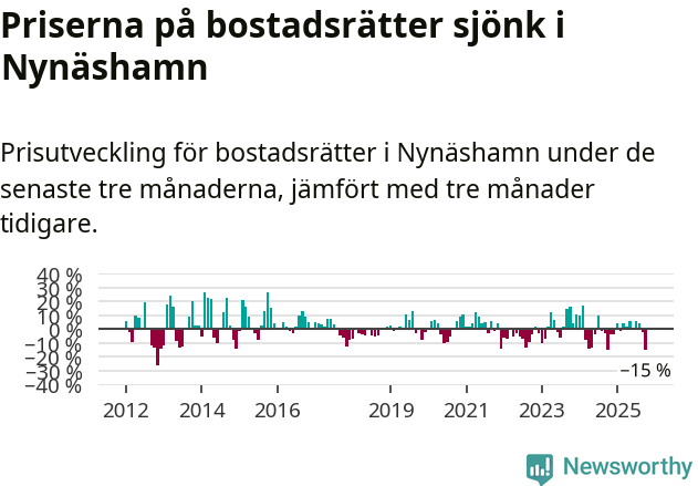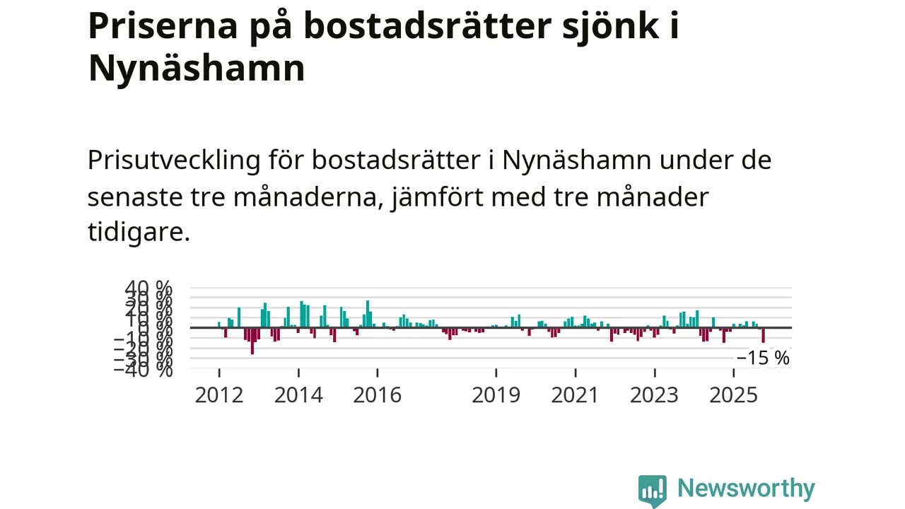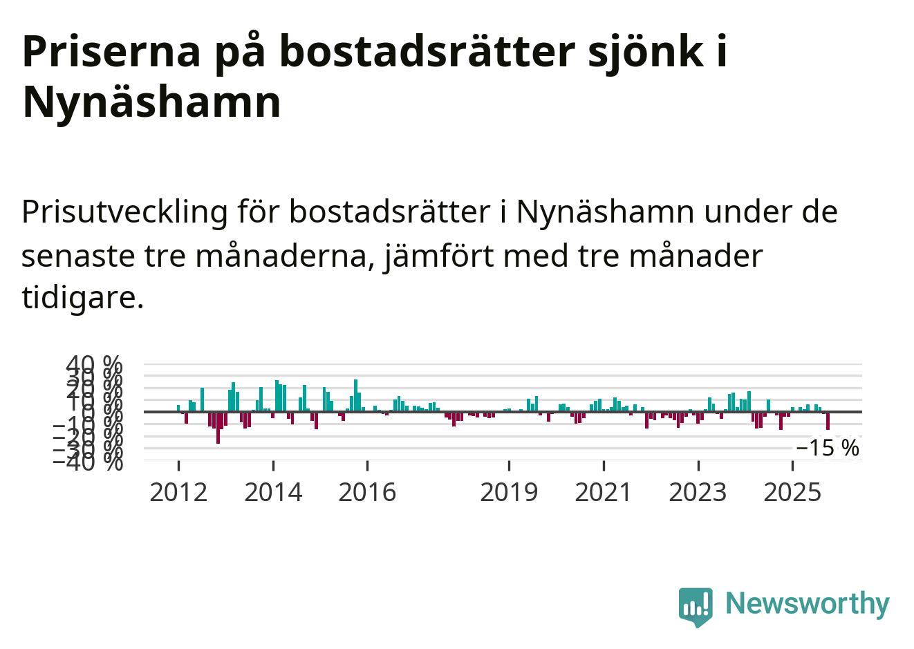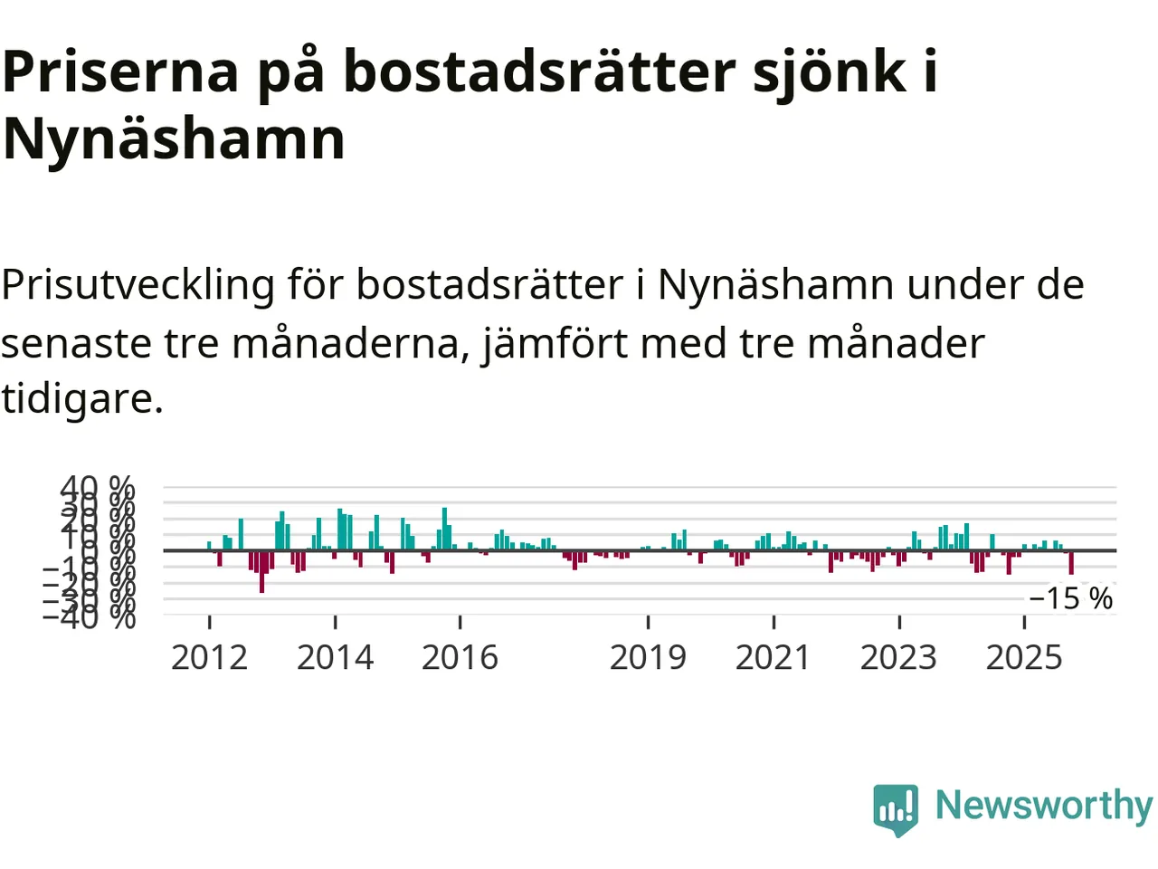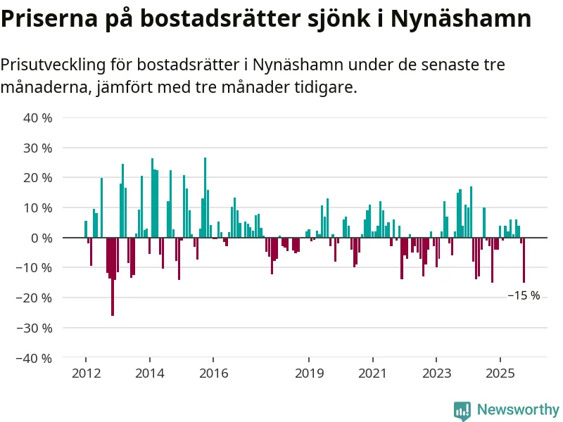 Priserna på bostadsrätter sjönk mellan augusti och oktober med 15 procent i Nynäshamns kommun. Det är en betydande nedgång jämfört med det gångna året då priserna i snitt stått stilla.