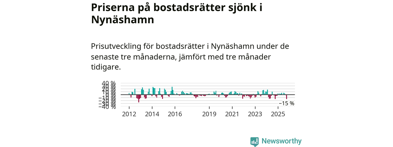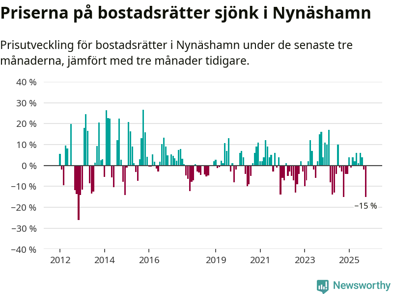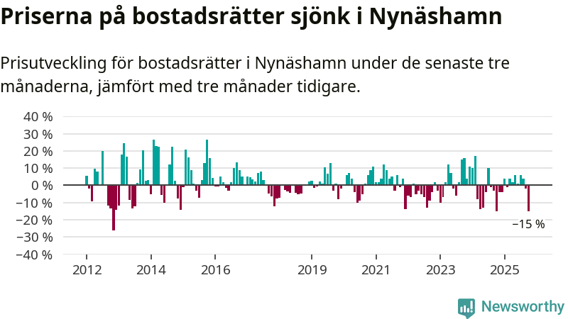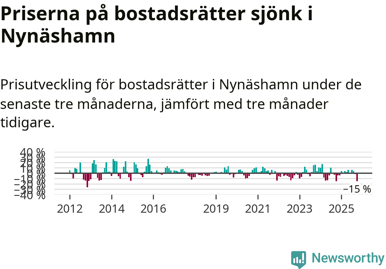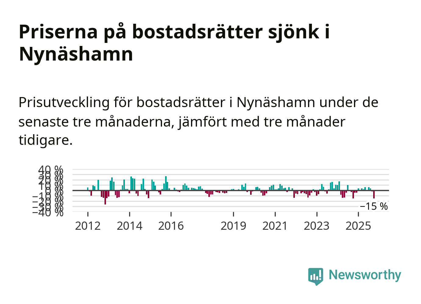 Priserna på bostadsrätter sjönk mellan augusti och oktober med 15 procent i Nynäshamns kommun. Det är en betydande nedgång jämfört med det gångna året då priserna i snitt stått stilla.