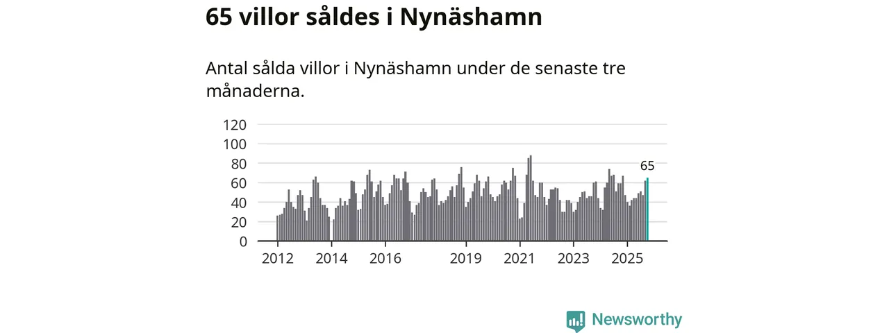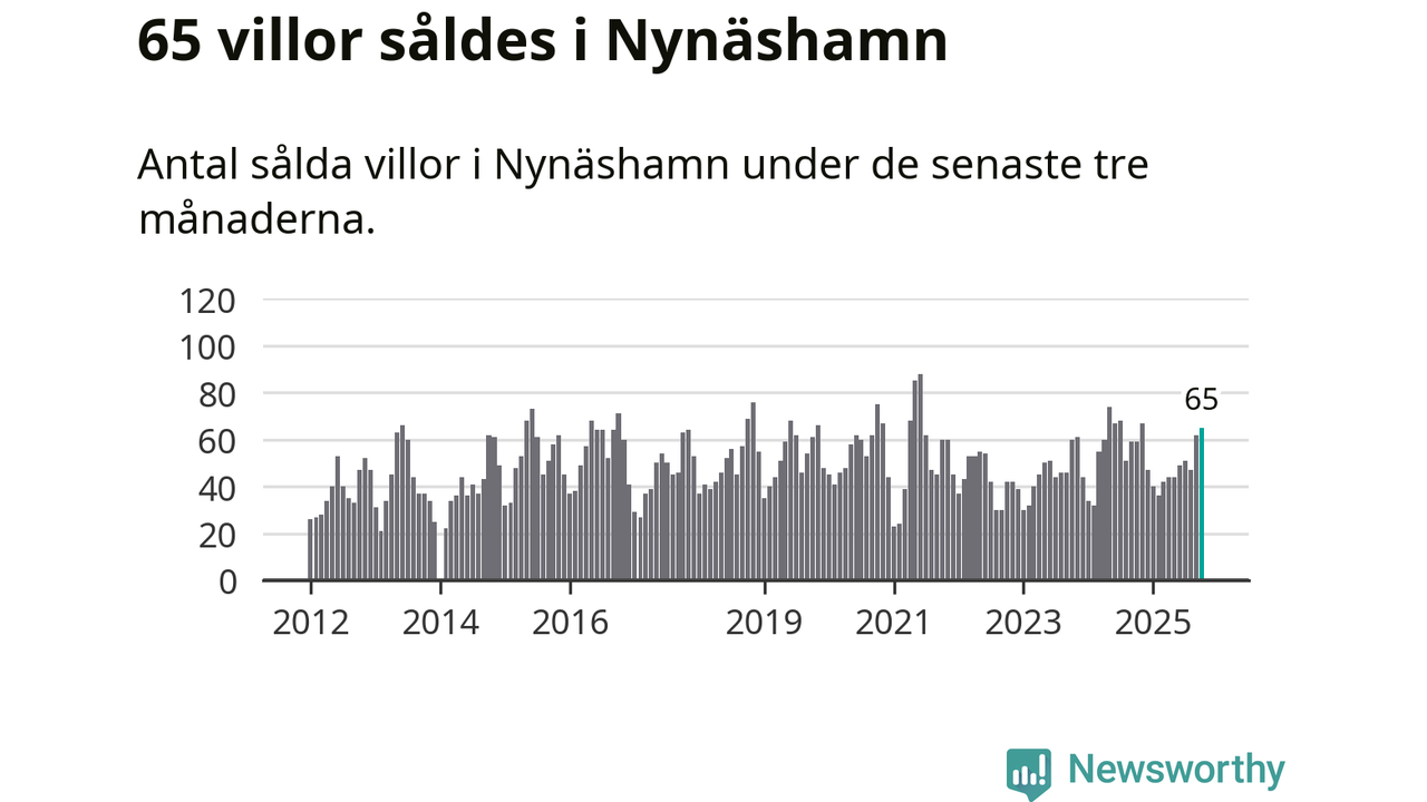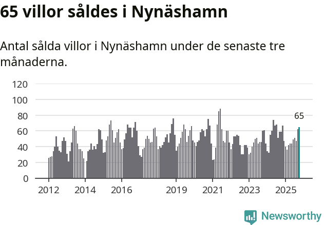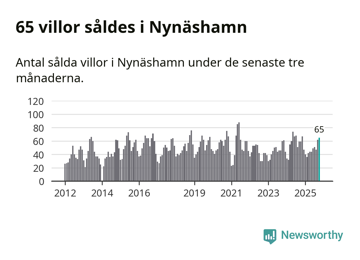 Sammanlagt såldes 65 villor i Nynäshamns kommun mellan augusti och oktober till ett genomsnittligt pris på 4,0 miljoner kronor. I fjol gjordes 59 affärer vid den här tiden på året.