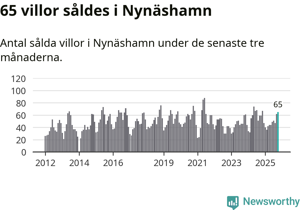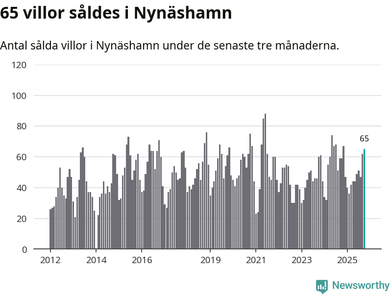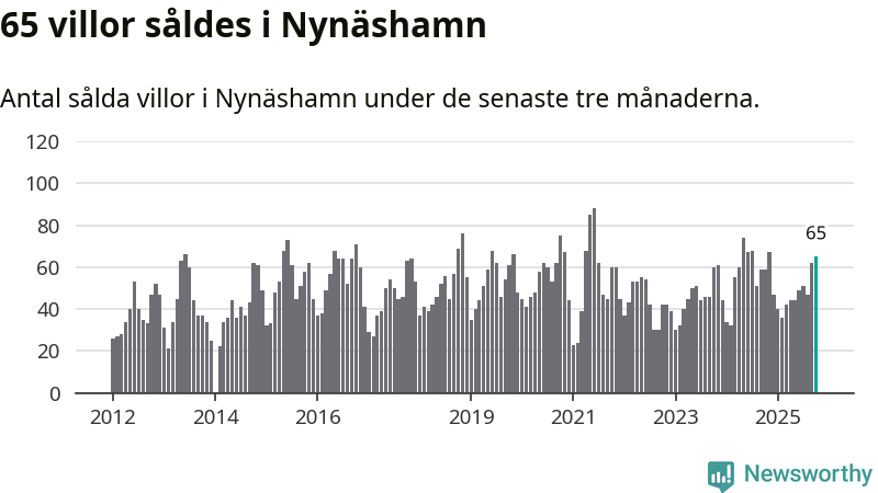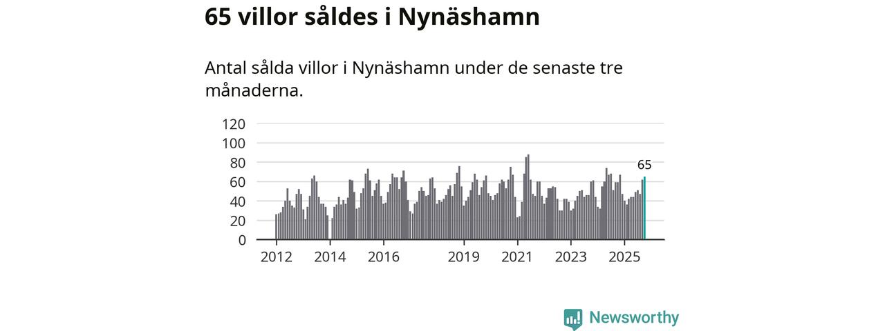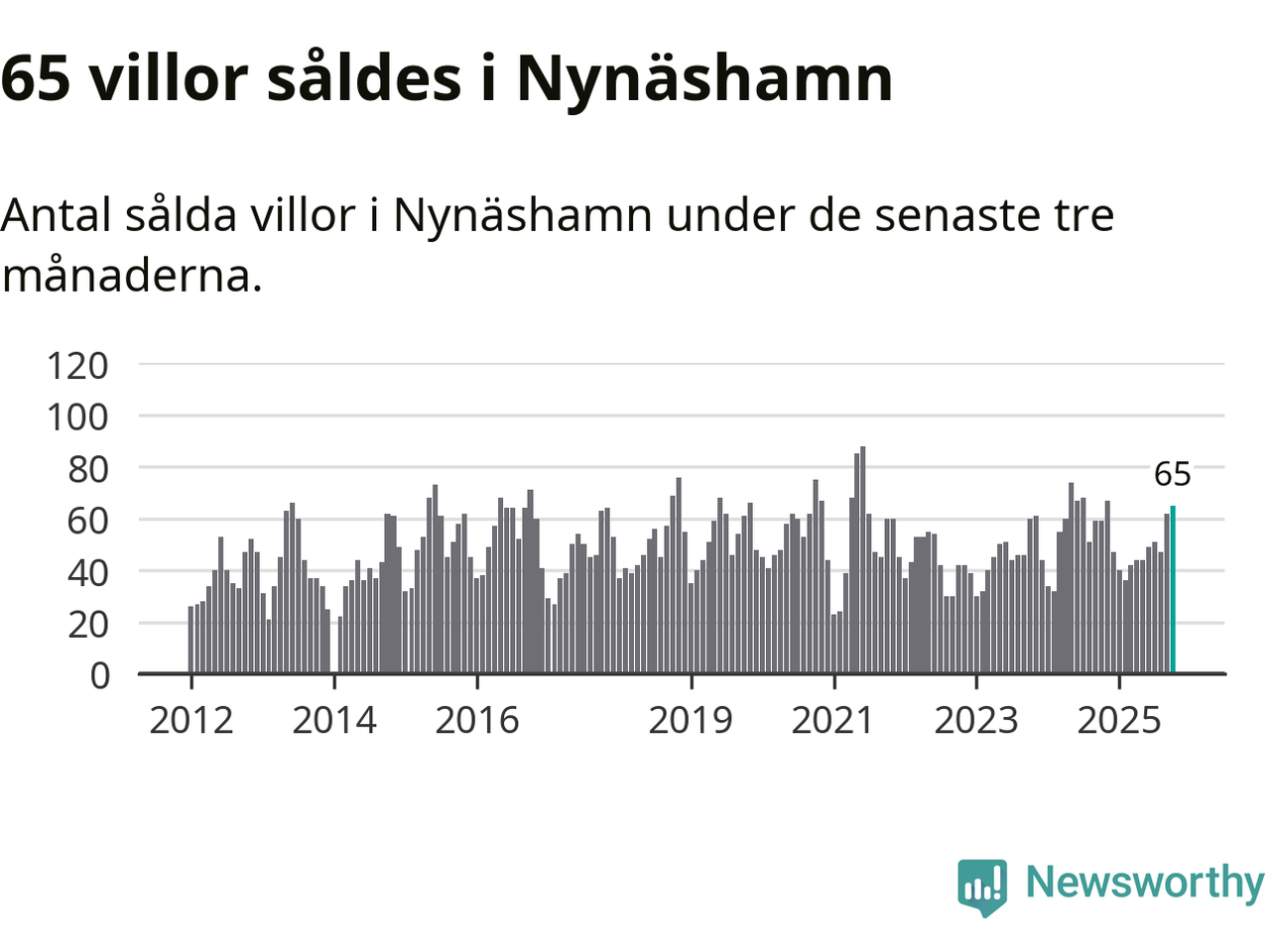 Sammanlagt såldes 65 villor i Nynäshamns kommun mellan augusti och oktober till ett genomsnittligt pris på 4,0 miljoner kronor. I fjol gjordes 59 affärer vid den här tiden på året.