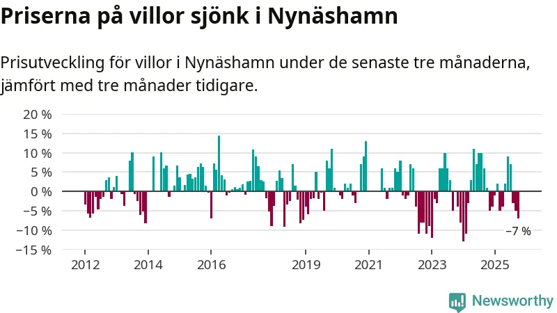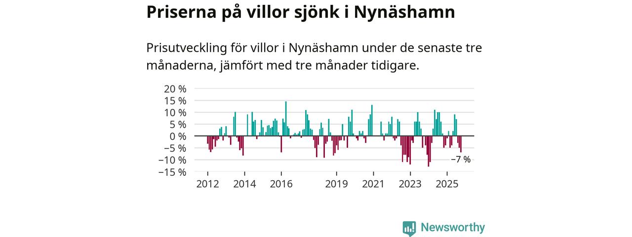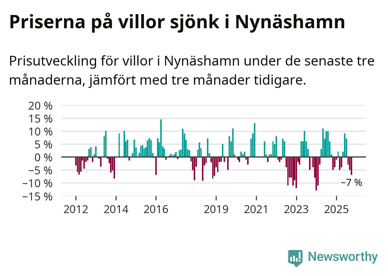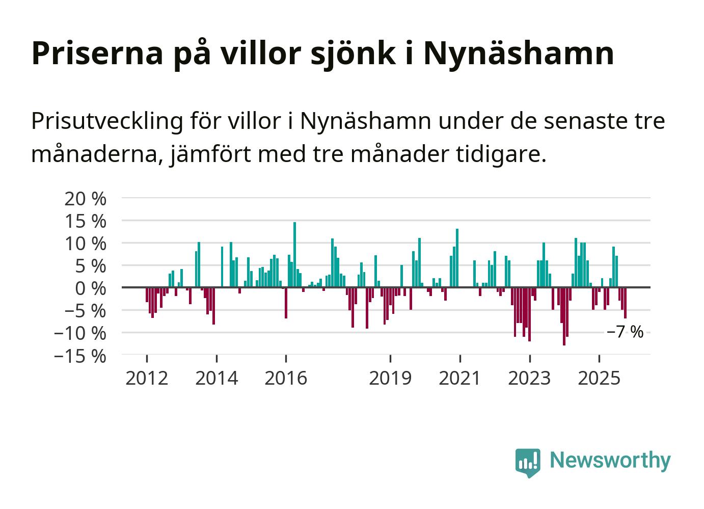 Villapriserna har gått ner i Nynäshamns kommun. Medelpriset på försäljningarna under de senaste tre månaderna visar på en nedgång med 7 procent.