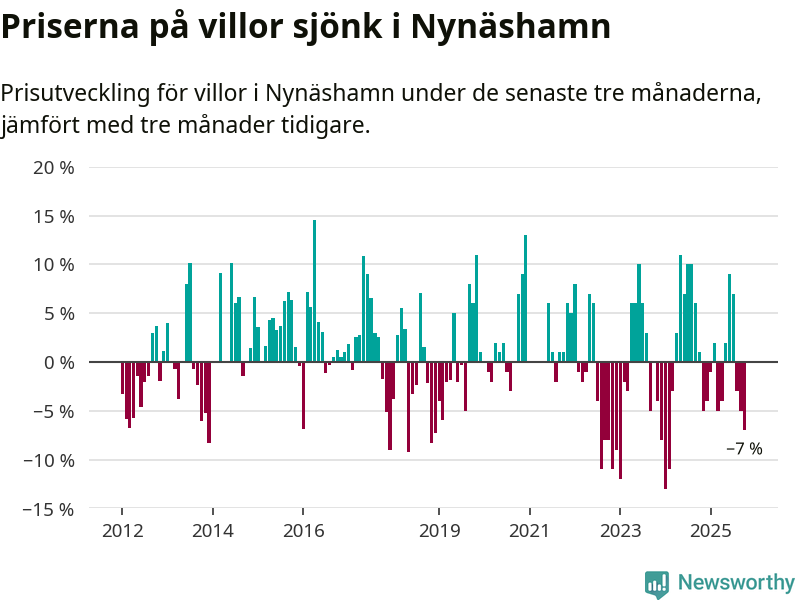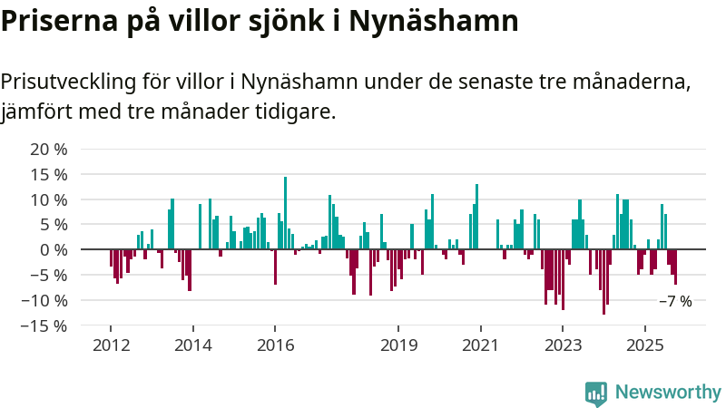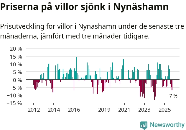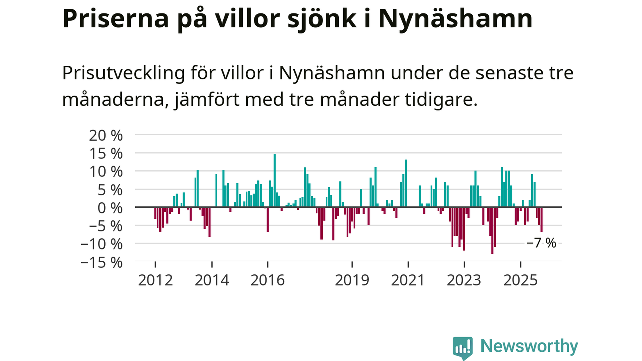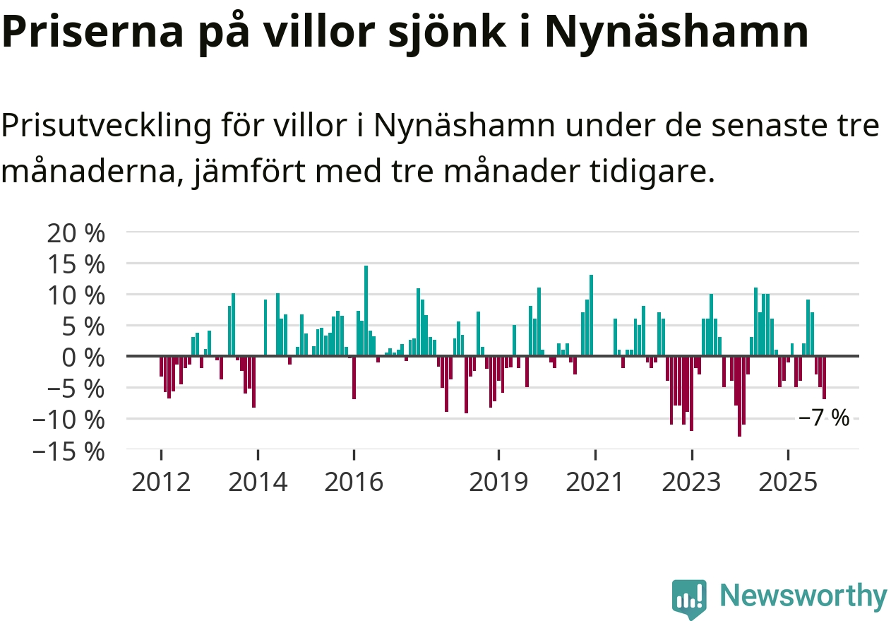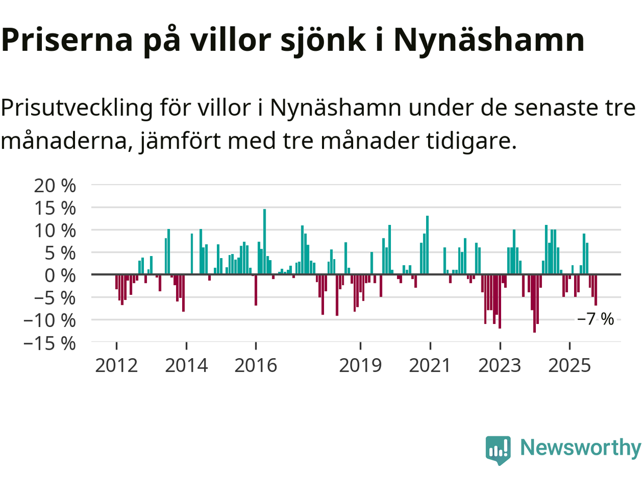 Villapriserna har gått ner i Nynäshamns kommun. Medelpriset på försäljningarna under de senaste tre månaderna visar på en nedgång med 7 procent.