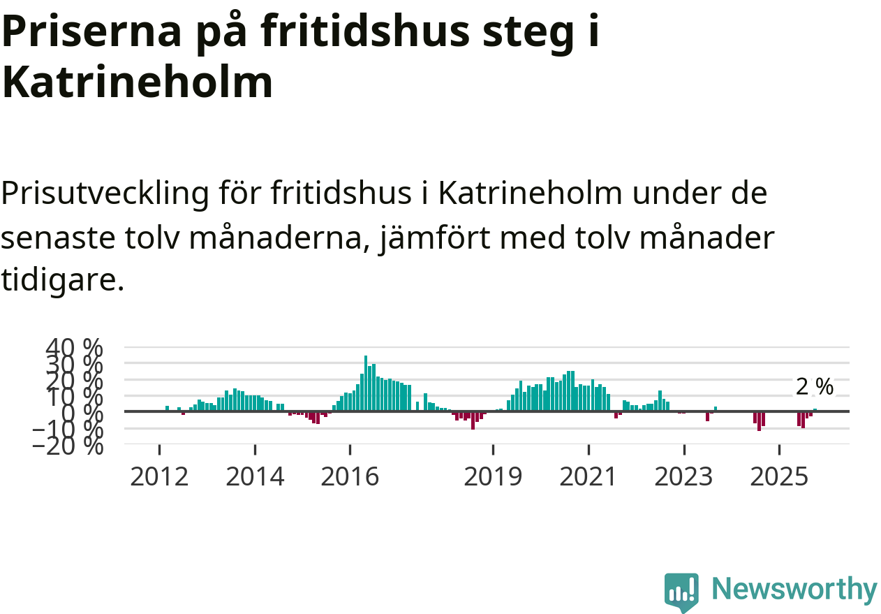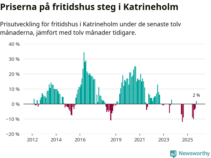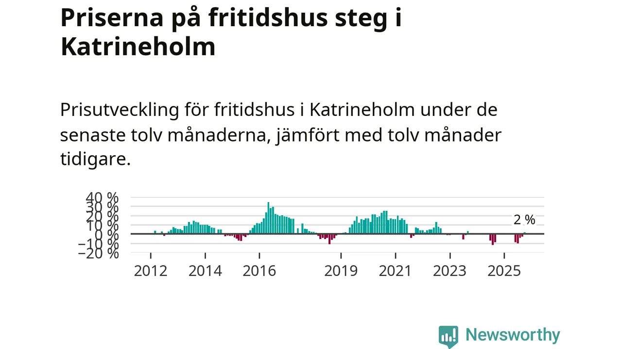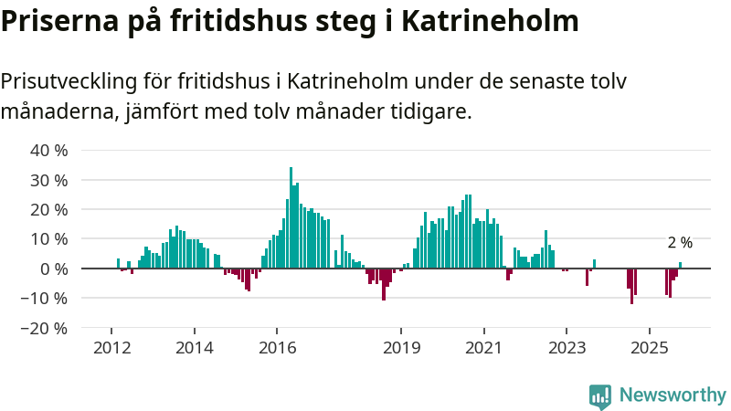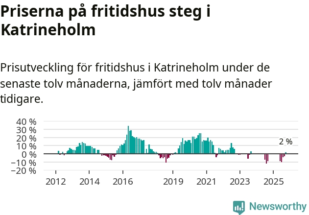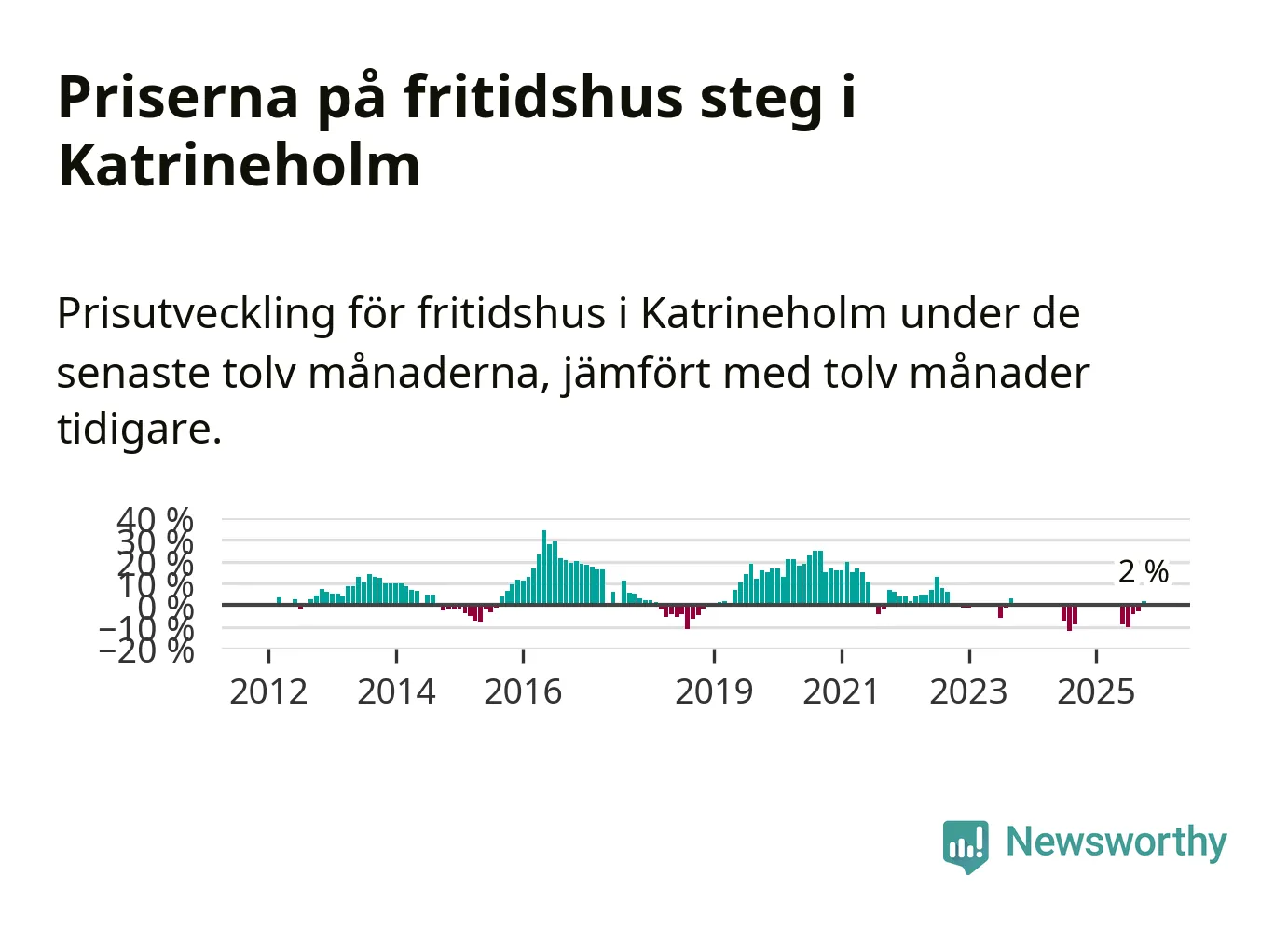 Priserna på fritidshus har gått upp i Katrineholms kommun. Medelpriset på försäljningarna under de senaste tolv månaderna visar på en uppgång med 2 procent.