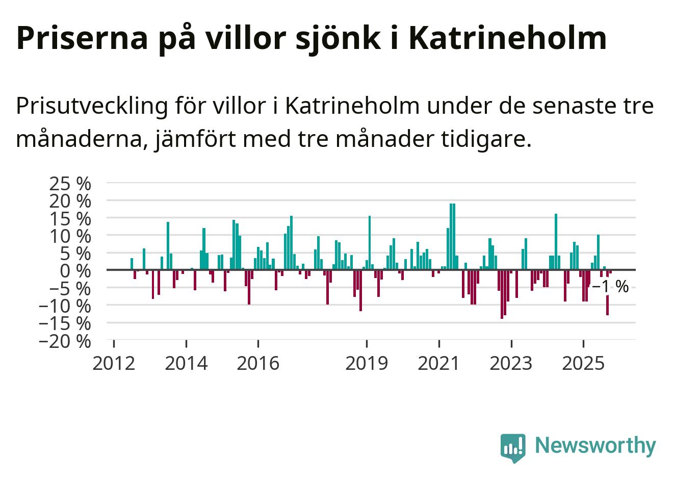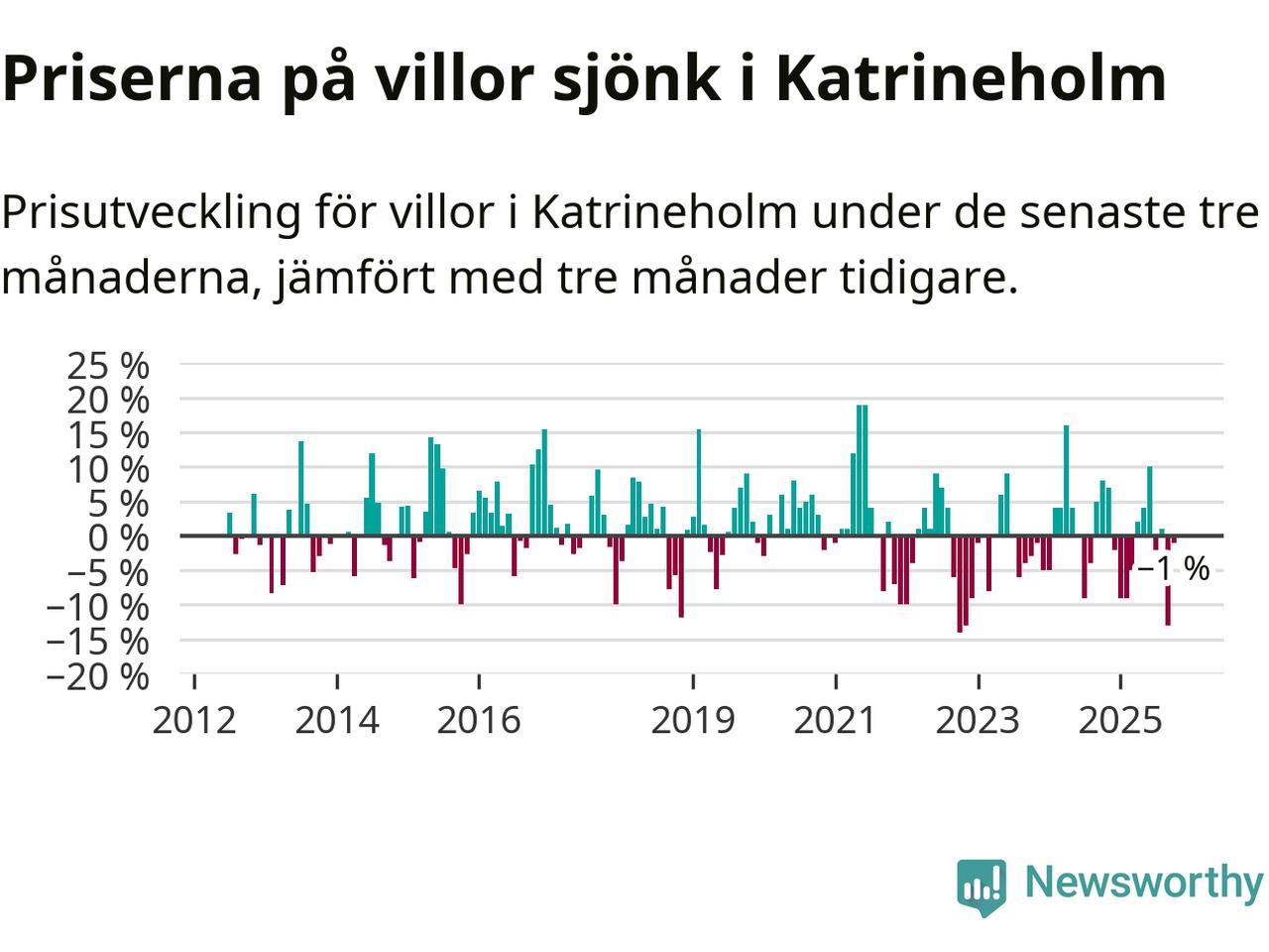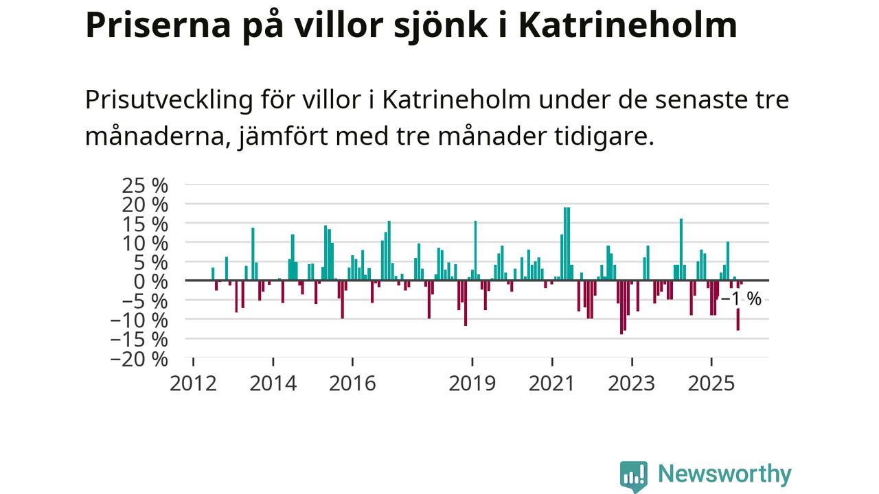 Villapriserna har gått ner i Katrineholms kommun. Medelpriset på försäljningarna under de senaste tre månaderna visar på en nedgång med 1 procent.