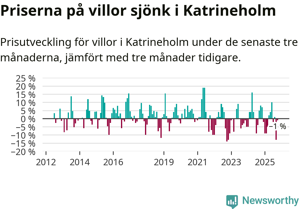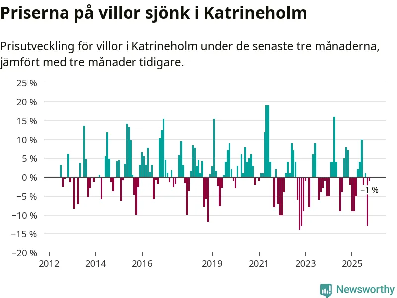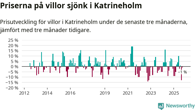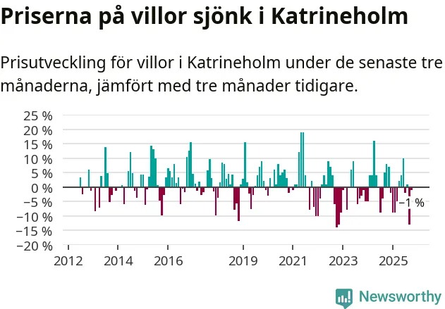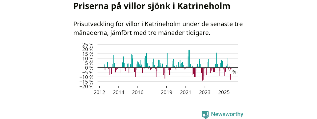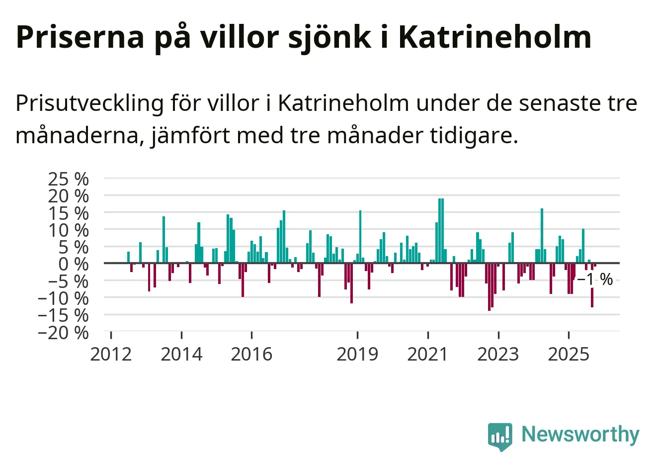 Villapriserna har gått ner i Katrineholms kommun. Medelpriset på försäljningarna under de senaste tre månaderna visar på en nedgång med 1 procent.