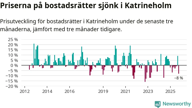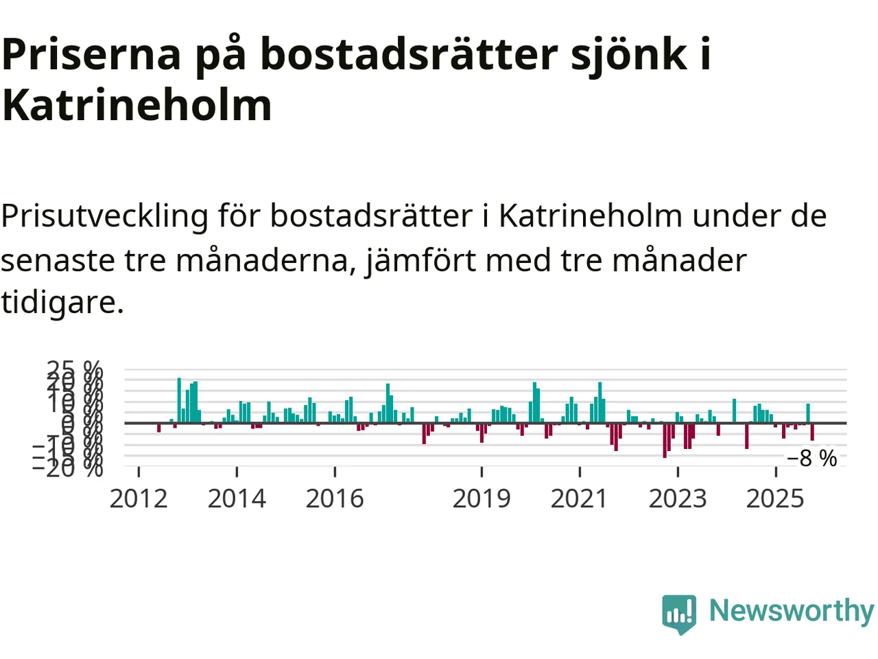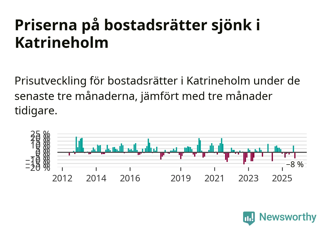 Priserna på bostadsrätter har gått ner i Katrineholms kommun. Medelpriset på försäljningarna under de senaste tre månaderna visar på en nedgång med 8 procent.