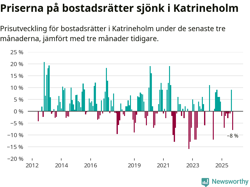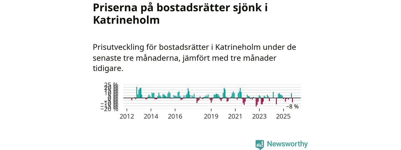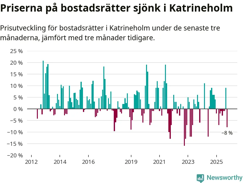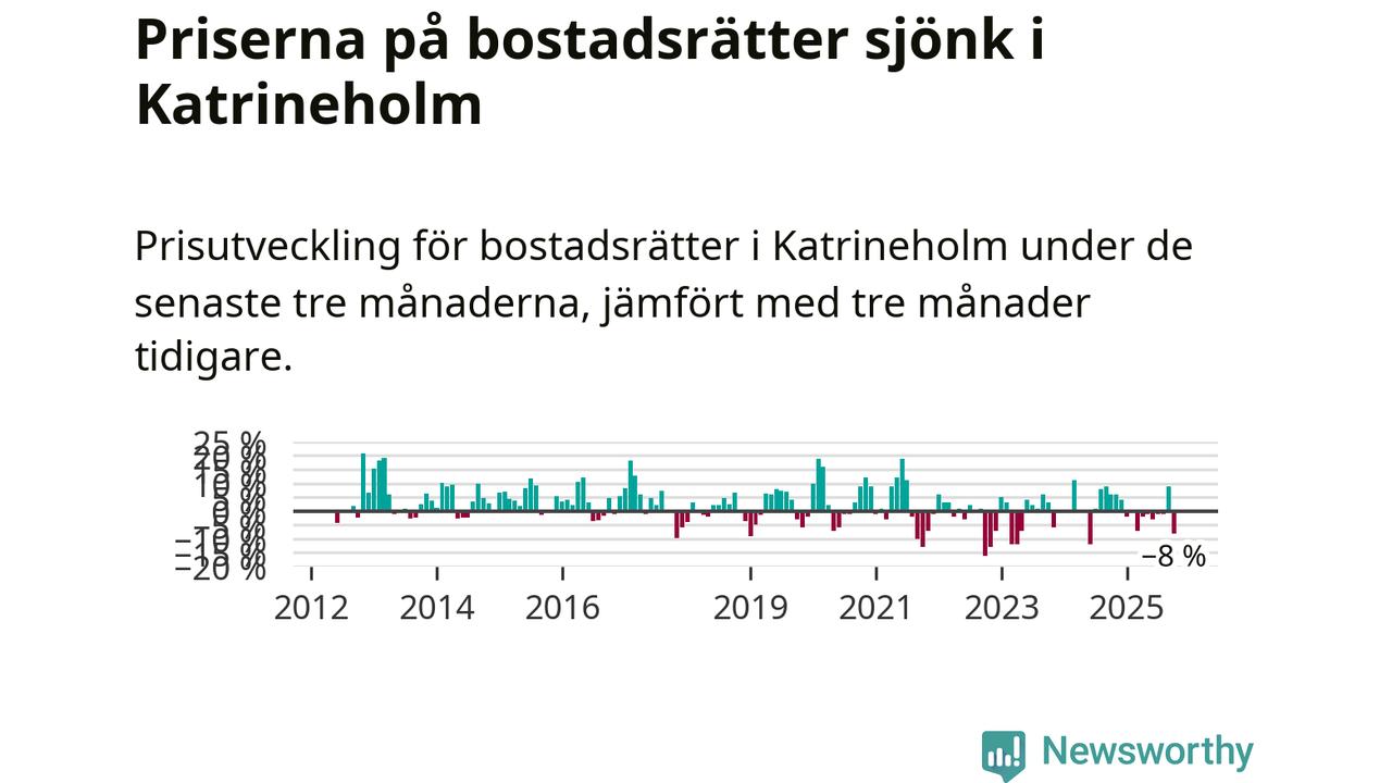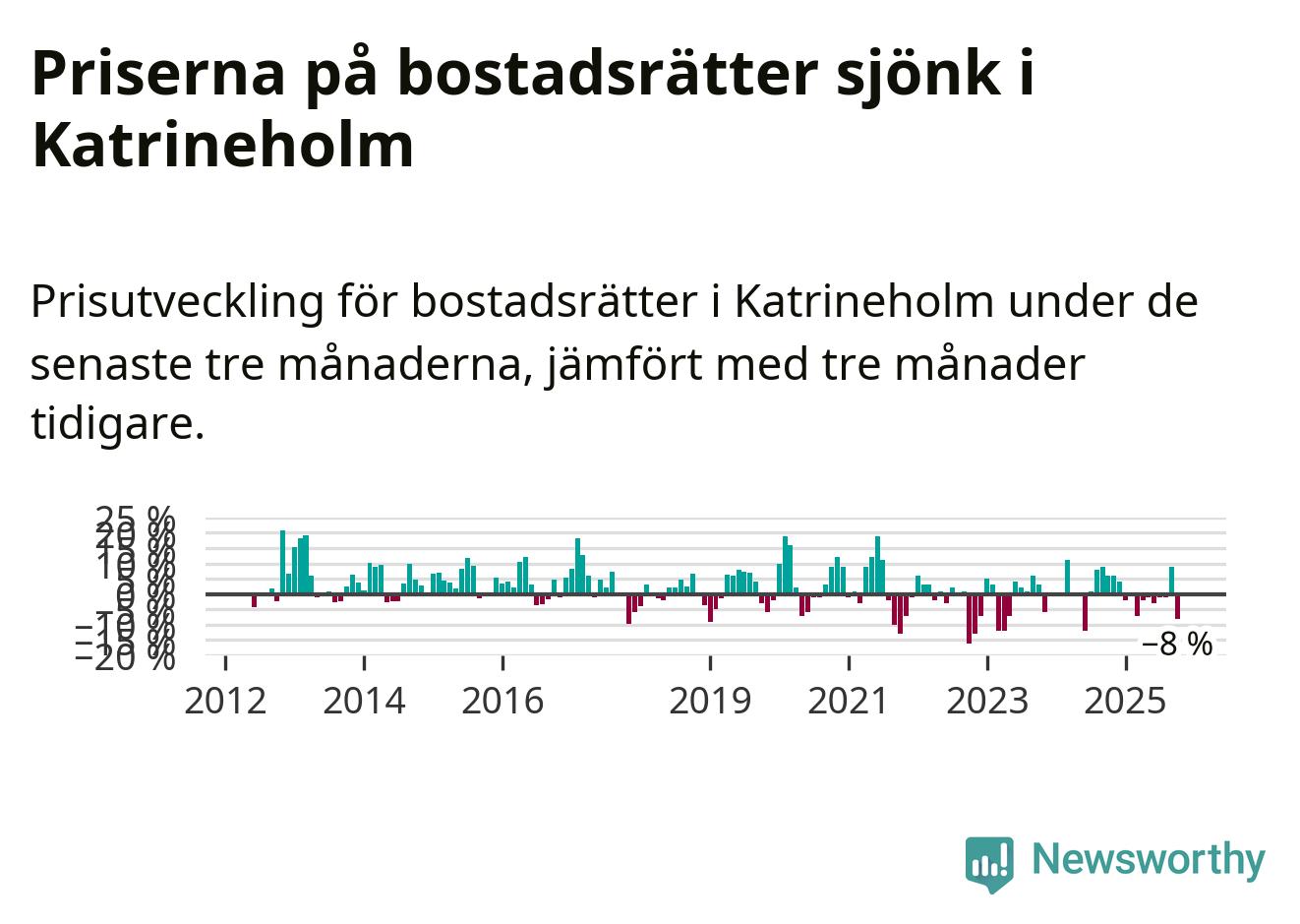 Priserna på bostadsrätter har gått ner i Katrineholms kommun. Medelpriset på försäljningarna under de senaste tre månaderna visar på en nedgång med 8 procent.