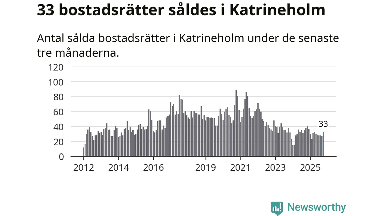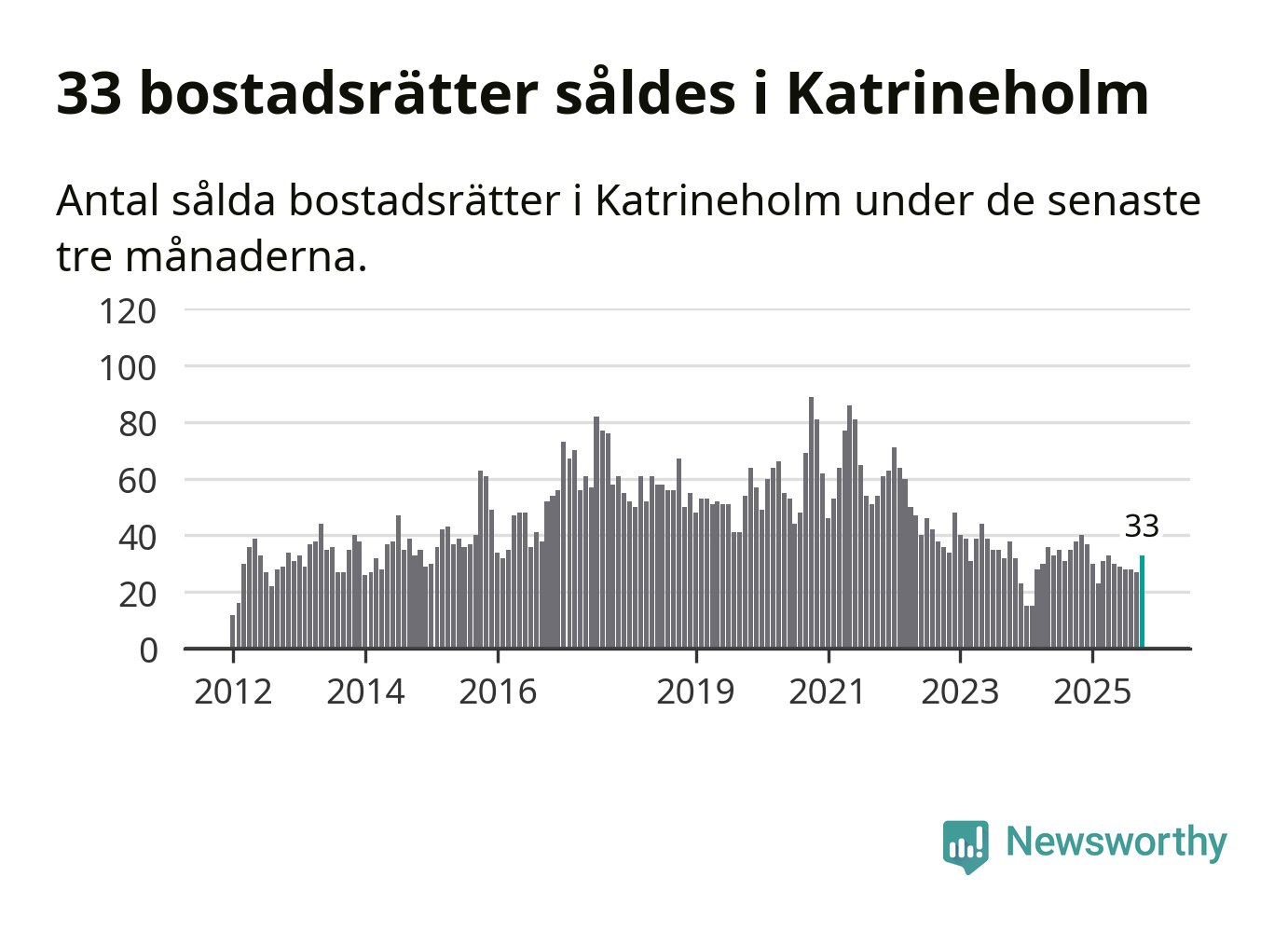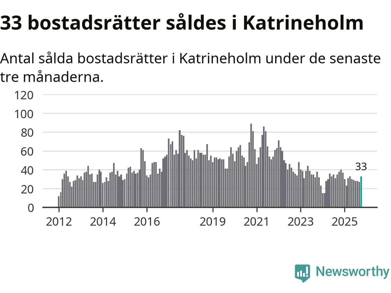 Sammanlagt såldes 33 bostadsrätter i Katrineholms kommun mellan augusti och oktober till ett genomsnittligt pris på 1,1 miljoner kronor. I fjol gjordes 38 affärer vid den här tiden på året.
