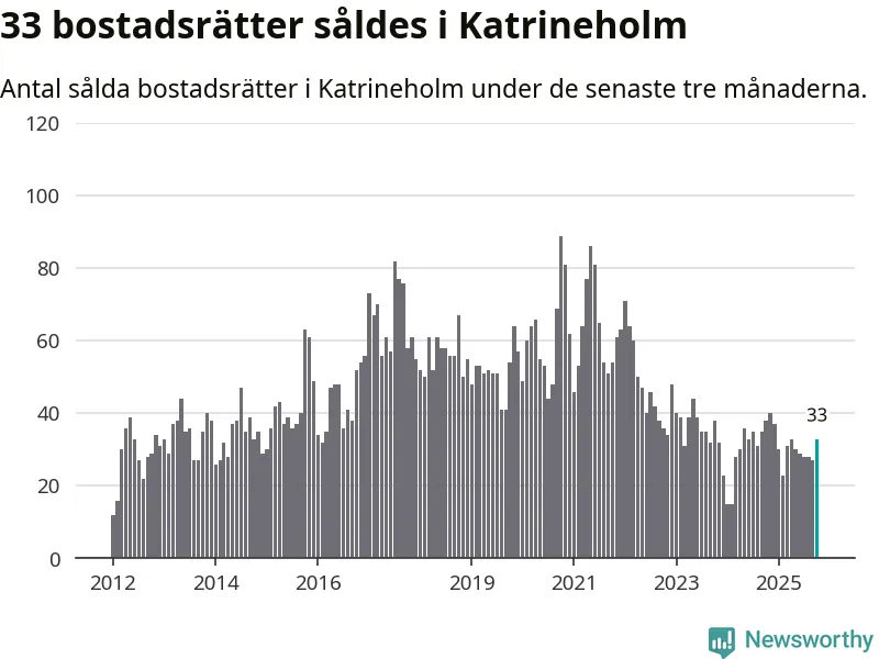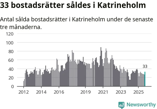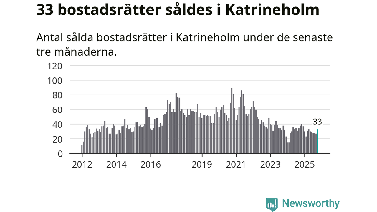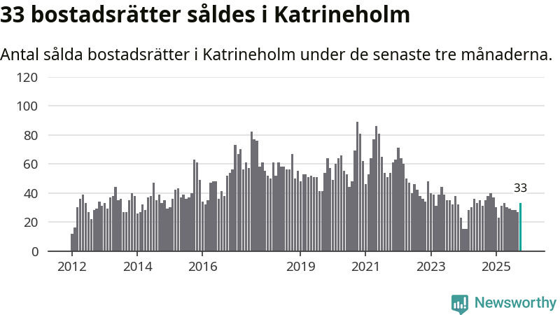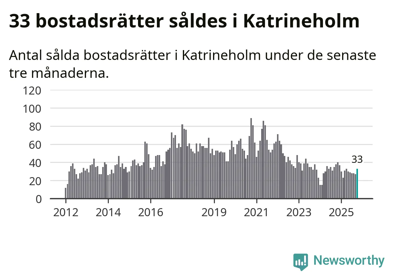 Sammanlagt såldes 33 bostadsrätter i Katrineholms kommun mellan augusti och oktober till ett genomsnittligt pris på 1,1 miljoner kronor. I fjol gjordes 38 affärer vid den här tiden på året.