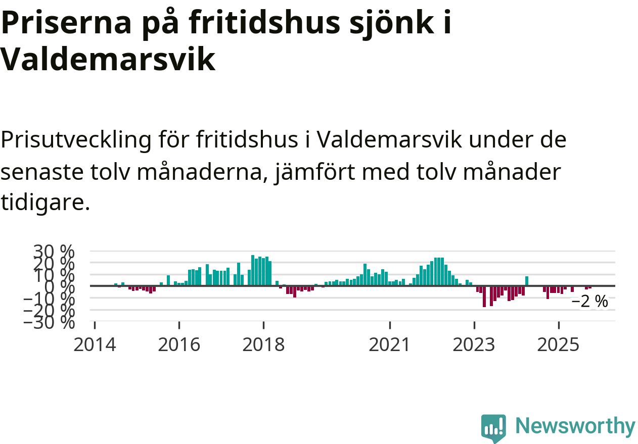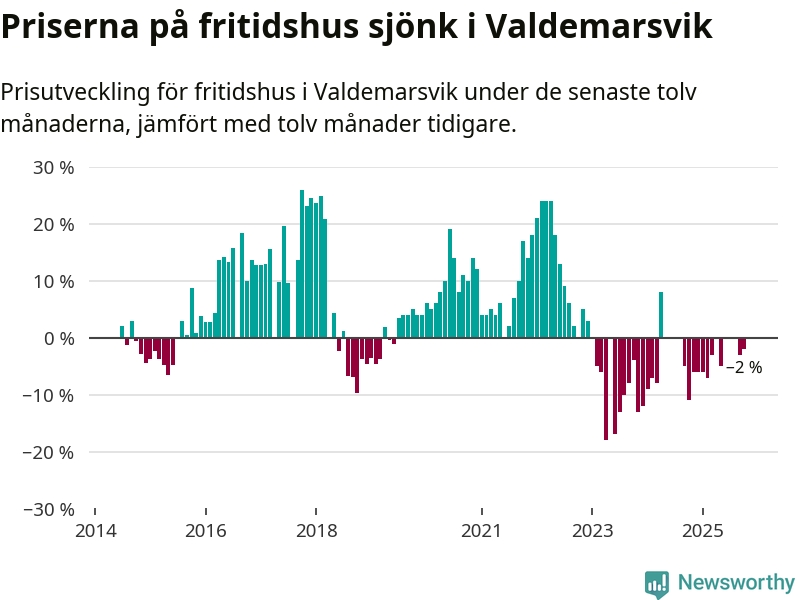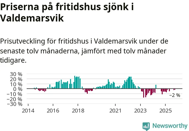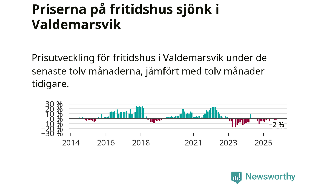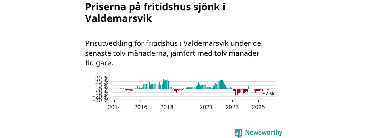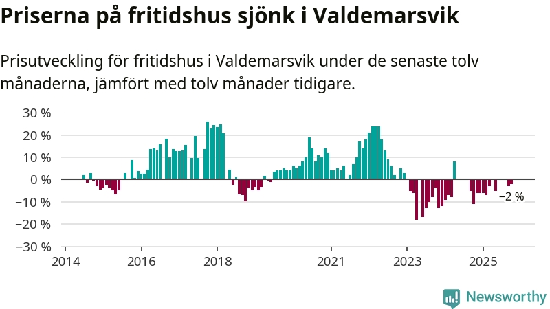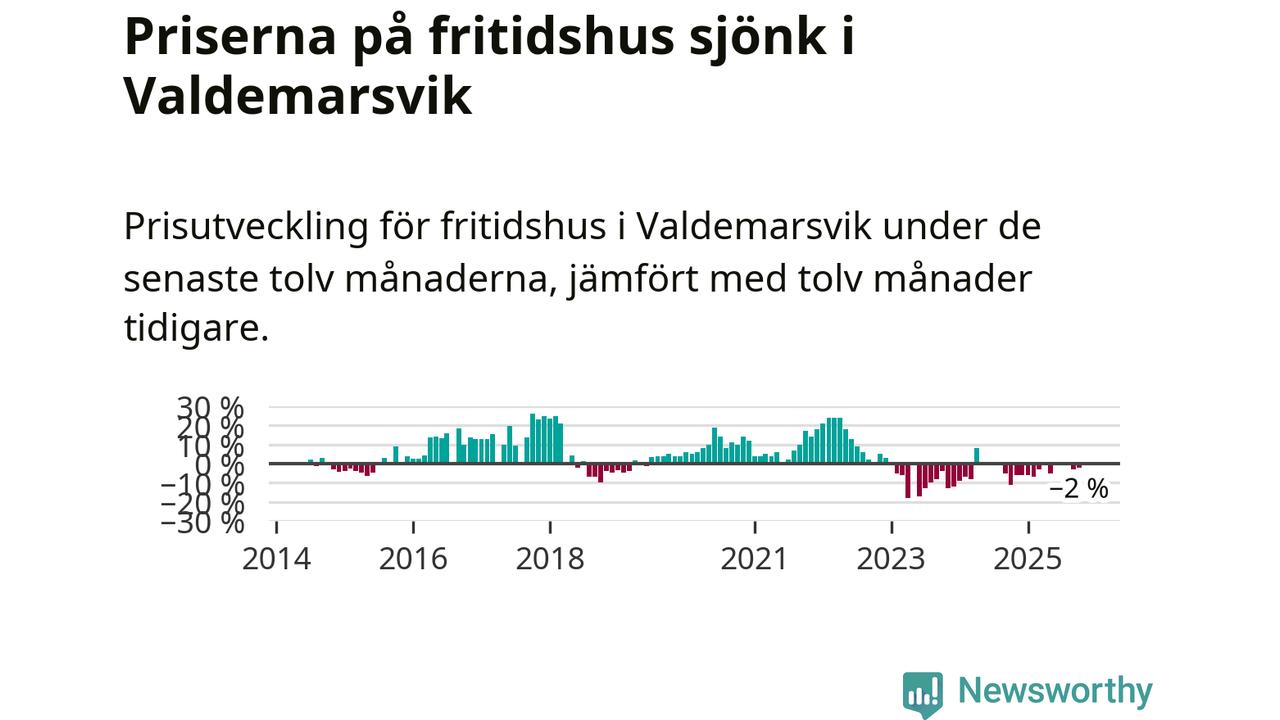 Priserna på fritidshus har gått ner i Valdemarsviks kommun. Medelpriset på försäljningarna under de senaste tolv månaderna visar på en nedgång med 2 procent.